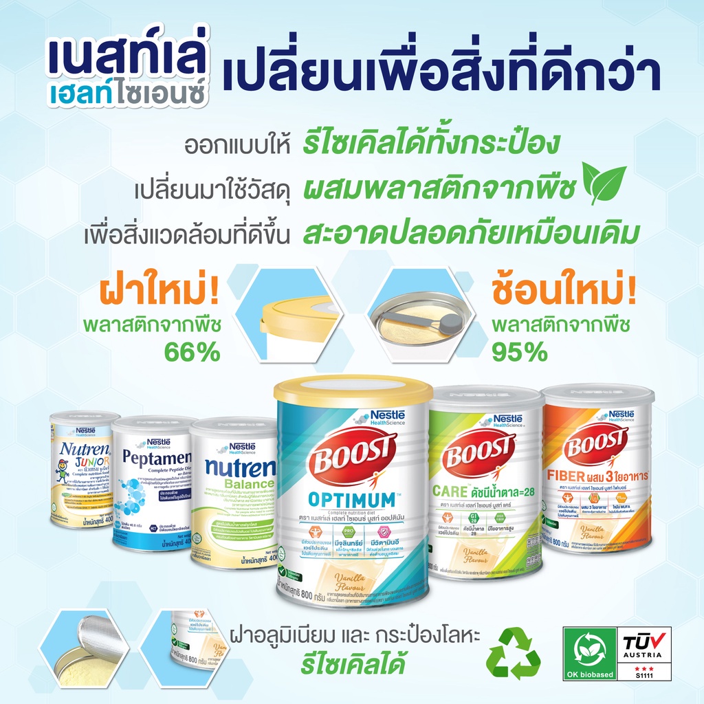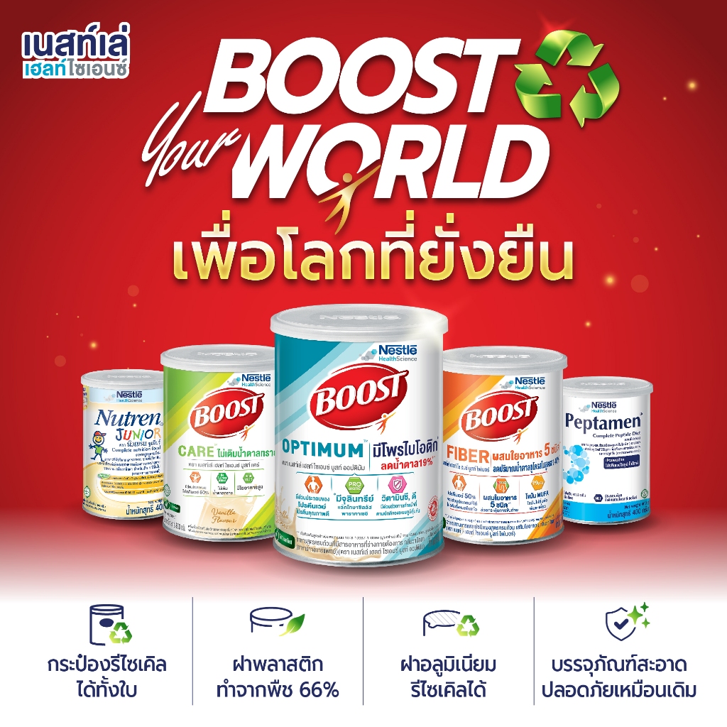 Boost Care บูสท์ แคร์ อาหารเสริมทางการแพทย์มีเวย์โปรตีน สำหรับผู้สูงอายุ น้ำตาลต่ำ ขนาดกระป๋อง 800 กรัม (2 กระป๋อง) เนสท์เล่ เฮลท์ ไซเอนซ์ บูสท์ แคร์ อาหารเสริมทางการแพทย์ มีค่าดัชนีน้ำตาล (GI) = 28 ช่วยให้แข็งแรง มีเวย์โปรตีน, ไขมัน MUFA, ใยอาหาร, วิตามิน, แร่ธาตุ • มีเวย์โปรตีน ให้กรดอะมิโ