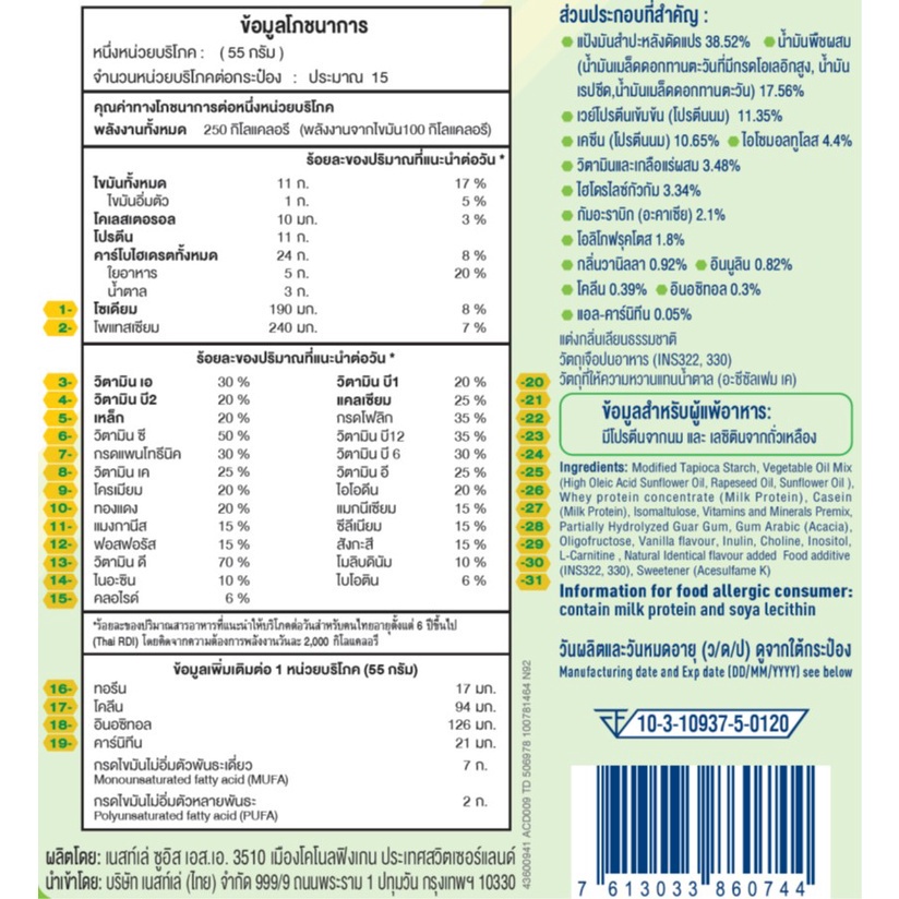 ... นจำเป็นต่อการสร้างโปรตีนชนิดต่างๆ ช่วยซ่อมแซมส่วนที่สึกหรอในร่างกาย เป็นอาหารเสริมสูตรครบถ้วน • มีใยอาหาร เพิ่มกากในระบบทางเดินอาหาร ช่วยกระตุ้นการขับถ่าย • มีแคลเซียม มีส่วนช่วยในกระบวนการสร้างกระดูกและฟันที่แข็งแรง • มีวิตามินบี 12 มีส่วนช่วยในการทำงานของระบบประสาทและสมอง • มีวิตามินอี มีส่วนช่วยในกระบวนการต่อต้านอนุมูลอิสระ • มีไขมัน MUFA หรือกรดไขมันไม่อิ่มตัวพันธะเดี่ยว ดัชนีน้ำตาล (Glycemic Index = GI) เป็นค่าที่บ่งบอกว่าหลังกินอาหาร แต่ละชนิดจะส่งผลให้ระดับน้ำตาลในเลือดสูงขึ้นเท่าใด ค่าสูงสุดคือ 100 อาหารที่มีดัชนีน้ำตาลต่ำ คือมีค่าดัชนีน้ำตาลต่ำกว่า 55 ส่วนประกอบที่สำคัญ แป้งมันสำปะหลังดัดแปร 38.52% น้ำมันพืชผสม (น้ำมันเมล็ดดอกทานตะวันที่มีกรดโอเลอิกสูง, น้ำมันเรปซีด,น้ำมันเมล็ดดอกทานตะวัน) 17.56% เวย์โปรตีนเข้มข้น (โปรตีนนม) 11.35% เคซีน (โปรตีนนม) 10.65% ไอโซมอลทูโลส 4.4% วิตามินและเกลือแร่ผสม 3.48% ไฮโดรไลซ์กัวกัม 3.34% กัมอะราบิก (อะคาเซีย) 2.1% โอลิโกฟรุคโตส 1.8% กลิ่นวานิลลา 0.92% อินนูลิน 0.82% โคลีน 0.39% อินอซิทอล 0.3% วิธีเตรียม ผสมน้ำ 210 มล. (อุณหภูมิไม่เกิน 45 องศาเซลเซียล) นิวเทรน ออปติมัม 7 ช้อน 55 กรัม จะได้นิวเทรน ออปติมัมพร้อมดื่มปริมาณ 250 มล. หลังผสมแล้วควรใช้ภายใน 4 ชั่วโมงหากเก็บไว้อุณหภูมิปกติ หรือใช้ภายใน 12 ชั่วโมงถ้าเก็บไว้ในตู้เย็น *ควรใช้ให้หมดภายใน 4 สัปดาห์ หลังเปิดฝา *ปิดฝาให้แน่น เก็บไว้ในที่แห้งและเย็น