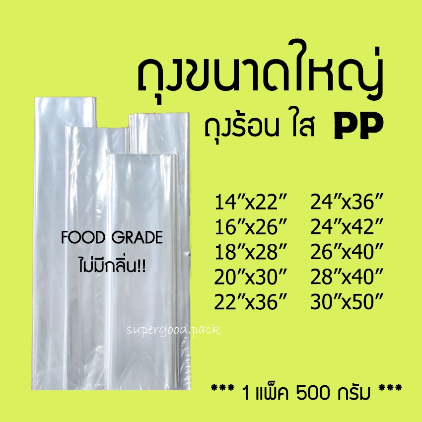 ถุงพลาสติก PP ถุงใส FOOD GRADE(500 กรัม /ครึ่งกก.) ส่งตรงจากโรงงาน คุณสมบัติ : ใส เหนียว ไม่มีกลิ่นเหม็น ทนความร้อน ตัวอย่างของถุง PP ที่เห็นได้ในชีวิตประจำวัน ถุงแกง ถุงคลุมเสื้อ ถุงใส่ผัก ใส่อาหาร 📌น้ำหนักของสินค้า 500 กรัม +/-เล็กน้อย 📌 **** จำนวนใบโดยประมาณ**** 14"x22"= 35 ใบ