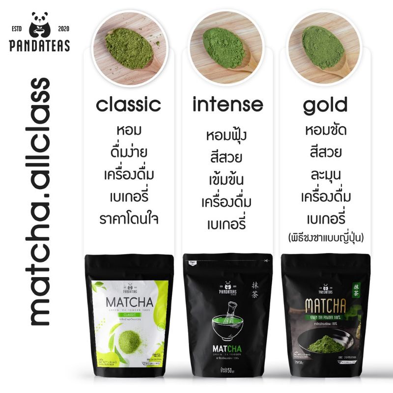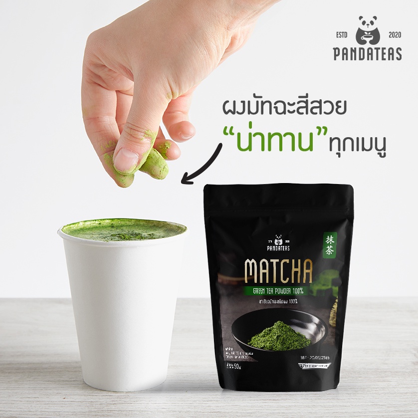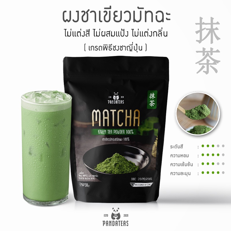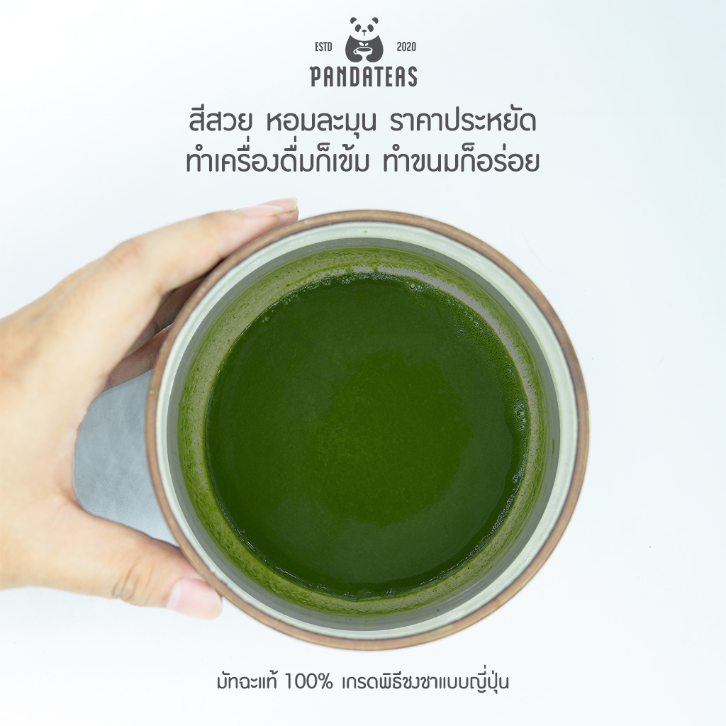 ... มัทฉะแท้ๆ 100% ที่ทางร้านได้คัดสรรมัทฉะหลายชนิดจนได้ที่พอใจ ทั้ง สี กลิ่น รส ในราคาที่ทุกท่านจับต้องได้ ไม่ว่าจะเป็นการดื่มแบบร้อน แบบเย็น หรือทำเครื่องดื่ม เบเกอรี่ ก็สามารถทำได้ เพราะมัทฉะเป็นมัทฉะเกรด A ทำไมต้อง? มัทฉะแพนด้าที - ตามหามัทฉะรสชาติดี ในราคาประหยัด ดื่มแก้ร้อน ดื่มผ่อนคลาย หรือ ทำเครื่องดื่มก็สามารถ เซฟต้นทุนของคุณให้ต่ำลง ในราคา 50 กรัม ในราคา 70 บาทเท่านั้น - ชามัทฉะแท้ๆจะได้รถชาติหอมของมัทฉะมีความมันแบบครีมๆขณะที่ตีต้องมีฟอง ซึ่งมัทฉะของ Panda-tea ไม่ทำให้คุณผิดหวัง - ชามัทฉะที่กรรมวิธีปลูกในที่ร่ม ธรรมดี น้ำดี ปลูกจนกว่าได้เวลาที่กำหนด ยิ่งเขียวก็ยิ่งต้องใช้เวลาปลูกนาน **มัทฉะที่ดีนั้นต้องมีกลิ่นที่ดี** นำอบในอุณภูมิที่ต่ำจนแห้ง และนำบดละเอียด จนได้มัทฉะที่กลมกล่อม มัทฉะลาเต้ อุปกรณ์และวัตถุดิบที่ต้องมี -ผงชาเขียว 1 ช้อนชา -นมสดไขมันต่ำ ครึ่งแก้ว (150 มิลลิลิตร) -น้ำตาลจากหญ้าหวาน 2 ช้อนชา (หรือตามชอบ) -น้ำแข็ง 1 แก้ว ขั้นตอนวิธีชงมัทฉะลาเต้ -ร่อนผงชาเขียวลงไปในถ้วยหรือชาม แล้วจึงเทน้ำอุ่นลงไป คนจนผงชาเขียวละลาย -ใส่น้ำแข็งลงในแก้วที่เตรียมไว้ -เทน้ำตาลจากหญ้าหวานในแก้วน้ำแข็ง แล้วจึงเทนมสดตามลงไป -นำชาเขียวที่ทำไว้ในขั้นตอนแรกเทผสมลงไปในแก้วนม ถือเป็นอันเรียบร้อย วิธีการเก็บรักษา - ถ้าลูกค้ายังไม่ฉีกซิปล็อคสินค้าจะอยู่ได้นานถึง 1 ปี โดนเก็บไว้ที่แห้ง หรือในตู้เย็น - ถ้าฉีกซิปแล้วควรเก็บไว้ในที่แห้ง ไม่ควรเก็บไว้ในตู้เย็น เพราะชาจะดูดกลิ่นได้ดี จะอยู่ได้มากที่สุด 2-3 เดือน (คงรสชาติ)