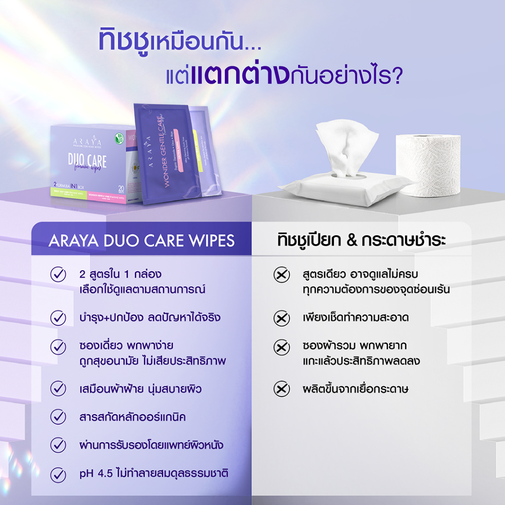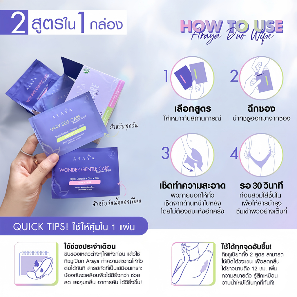 ARAYA DUO CARE FEMININE WIPES 2 สูตรใน 1 กล่อง | เวชสำอางทิชชูเปียกสำหรับจุดซ่อนเร้น DAILY SELF CARE FEMININE WIPES >> สูตรเสริมสร้างภูมิคุ้มกัน (สำหรับชีวิตประจำวัน) เสริมเกราะป้องกันผิว(skin barrier) ฟื้นฟูโครงสร้างชั้นผิวให้แข็งแรง ยากต่อการแพ้ระคายเคืองง่าย พร้อมรักษาสมดุลความชุ่มชื