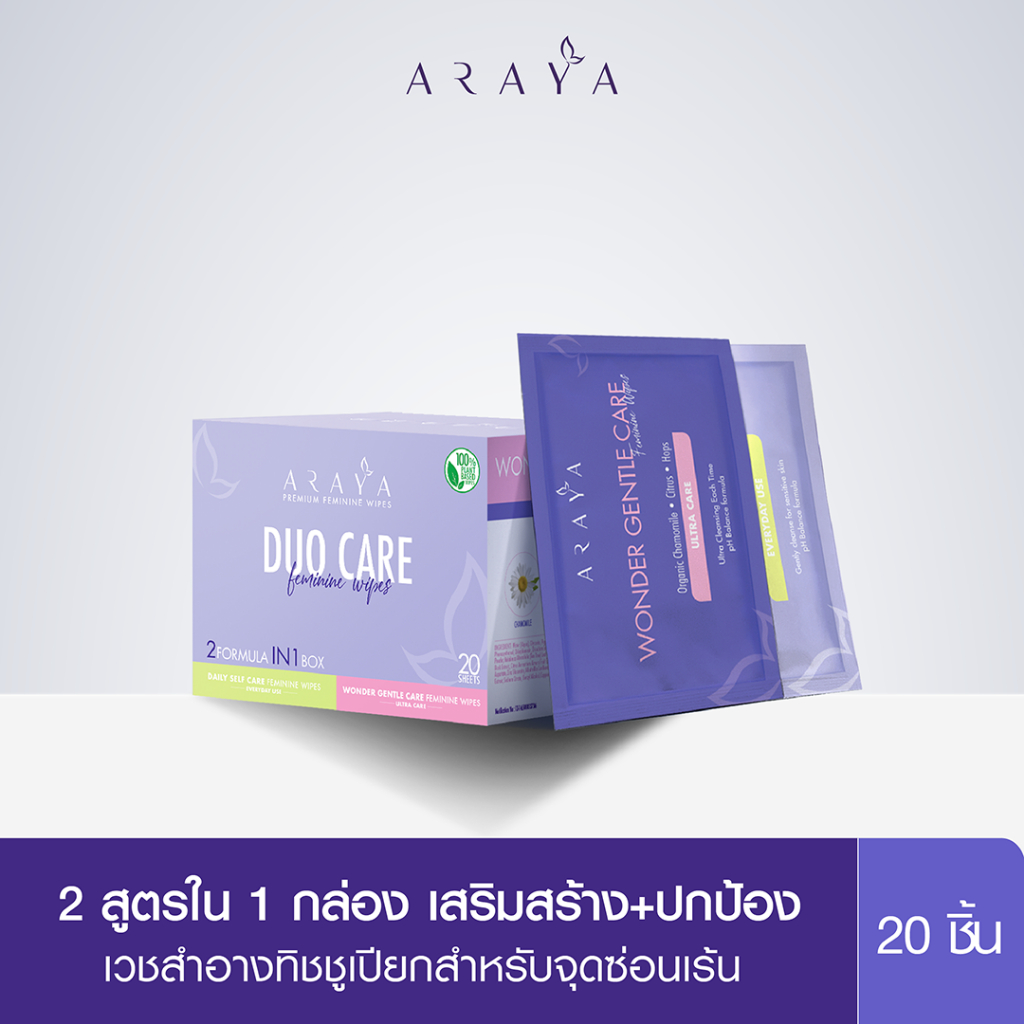 (W) ARAYA DUO CARE Feminine Wipes เวชสำอางทิชชูเปียกสำหรับจุดซ่อนเร้น 2สูตรใน 1 กล่อง / 20ชิ้น