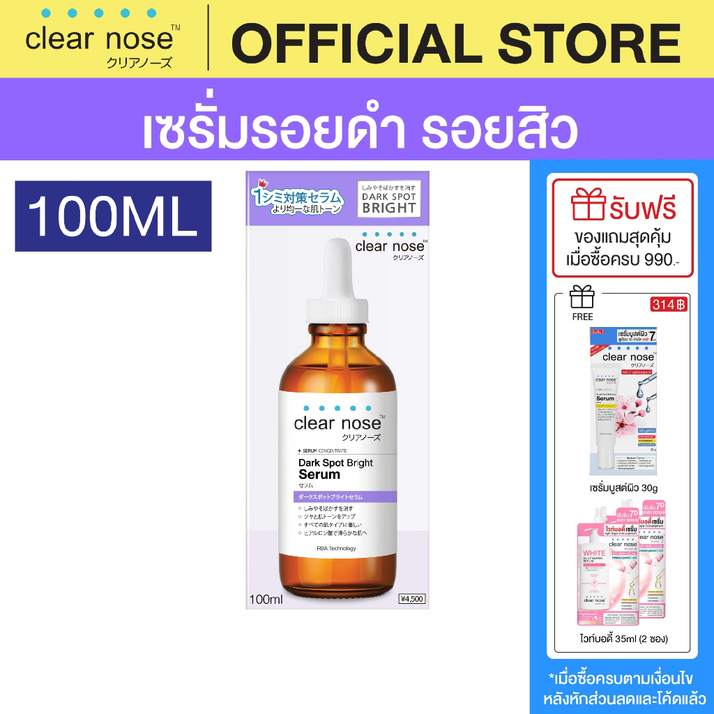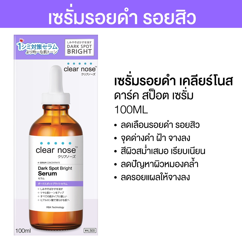 **Clear Nose Official ส่งตรงจากบริษัทฯ เพื่อความมั่นใจ 100%** ใหม่ !! เคลียร์โนส ดาร์ค สป็อต ไบรท์ เซรั่ม (100 ml) เซรั่มลดเลือนรอยดำ รอยสิว ผิวกระจ่างใส เซรั่มใหม่ล่าสุดที่ช่วย ลดเลือนรอยดำ ให้ดูจางลง ฟื้นบำรุงผิวที่หมองคล้ำให้แลดูกระจ่างใส สูตรเข้มข้น ซึมไว ดาร์ค สป็อต ไบรท์ เซรั่ม ช่วย