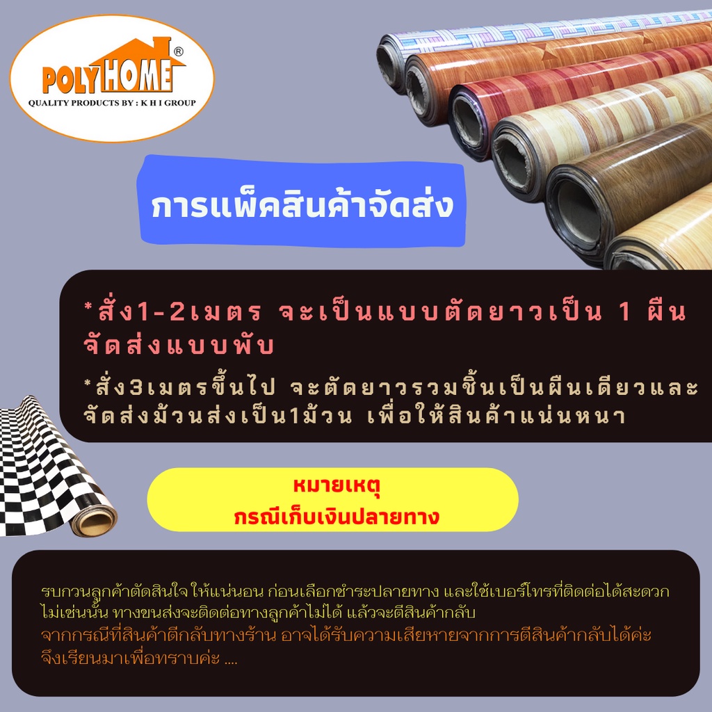 ... รณีต้องการแบบยกม้วน = 27เมตร ลูกค้าสามารถเข้าไปในร้านค้า และเลือกสินค้าแบบสั่งเป็นม้วน ได้ค่ะ เพื่อจะได้ในราคายกม้วนค่ะ**** หรือทักแชทสอบถามได้เลยค่ะ คุณสมบัติ - เสื่อน้ำมันPVC เกรดเอ คุณภาพดี - เสื่อน้ำมัน สีสันสดใส - ปูเรียบง่ายไม่จำเป็นต้องใช้กาว - เช็คทำความสะอาดง่าย โดนน้ำได้ - ตัวช่วยที่จะปกปิดรอยเก่า และราคาประหยัด คุ้มค่า - ใช้สำหรับปูพื้น ปูโต๊ะ ปูหลังตู้ และอเนกประสงค์ (ช่วยลดความร้อน) วิธีกดสั่ง กดเลือกลาย..... - -> ตัวอย่าง:ต้องการซื้อยาว 10 เมตร ให้ลูกค้ากดเลือกลาย.... กดจำนวนเป็น 20 ****ทางร้านไม่ได้ตัดซอยให้ จะตัดให้ยาวให้ไป เป็นผืนเดียวกันค่ะ เพื่อป้องกันการยับ **** การแพค 1-2 เมตร - - > จัดส่งแบบสินค้าพับ 3 เมตรขึ้นไป จัดส่งแบบม้วน เพื่อลดการยับของสินค้า (ทางร้านแนะนำให้สั่ง 3 เมตร ขึ้นไป เพื่อการจัดส่งแบบม้วน เพื่อไม่ให้เกิดรอยพับ) สามารถสั่งได้ยาวสูงสุดโดยไร้รอยต่อ 27 เมตร ****หากไม่แน่ใจในการสั่งซื้อและติดปัญหา สามารถทักแชทสอบถามปรึกษา ก่อนสั่งซื้อได้เลยค่ะ ****กรณีหลังสั่งซื้อ เมื่อตรวจสอบสินค้า หากพบปัญหา ให้ทักสอบถามร้านก่อนรีวิวค่ะ ***หมายเหตุ กรณีการชำระเงินปลายทาง*** รบกวนลูกค้าตัดสินใจให้แน่นอนก่อนเลือกชำระปลายทางนะคะ และใช้เบอร์โทรที่ติดต่อได้สะดวก ไม่เช่นนั้น ทางขนส่งจะติดต่อทางลูกค้าไม่ได้ แล้วจะตีสินค้ากลับ จากกรณีที่สินค้าตีกลับทางร้าน อาจได้รับความเสียหายจากการตีสินค้ากลับได้ค่ะ จึงเรียนมาเพื่อทราบค่ะ .... #หมายเหตุเพิ่มเติม: ไม่รับเปลี่ยนและคืนสินค้า หากกรณี สินค้าผิดไม่ตรงตามที่สั่งและมีตำหนิ ให้ถ่ายวีดีโอพร้อมภาพ ก่อนแกะสินค้า ส่งมาเพื่อชี้แจ้งและแจ้งร้านทราบหลังได้รับภายใน 3 วัน //เสื่อของแท้คุณภาพ ต้องร้าน POLYHOME เท่านั้น! ลูกค้าอย่าลืมตรวจสอบชื่อร้านค้า ต้องเป็นชื่อ POLYHOME ด้วยนะคะ/// เช็คเสื่อของแท้: โลโก้ POLYHOME ชื่อร้าน POLYHOME #เสื่อน้ามัน #เสื่อน้ำมันราคาถูก #เสื่อน้ำมันลายสวยๆ #เสื่อน้ำมันเคลือบเงา #เคลือบลามิเนต #เสื่อกันน้ำ #เสื่อปิคนิค #เสื่อ #เสื่อเคลือบ #เสื่อพีวีซี #กันน้ำ #เสื่อเกรดเอ #สินค้าคุณภาพ #เสื่อพับ #ผ้ายาง #ผ้าใบกันน้ำ #ปูพื้น #พรมปูพื้นห้องนอน #แต่งบ้าน #ตกแต่งบ้าน #ปูพื้นห้องนอน #พรม #พรมปูพื้น #เสื่อน้ํามันปูพื้น #Floor #ปูโต๊ะ #ตกแต่งบ้าน #ตกแต่งห้อง #ตกแต่งห้องนอน #ตกแต่งคอนโด