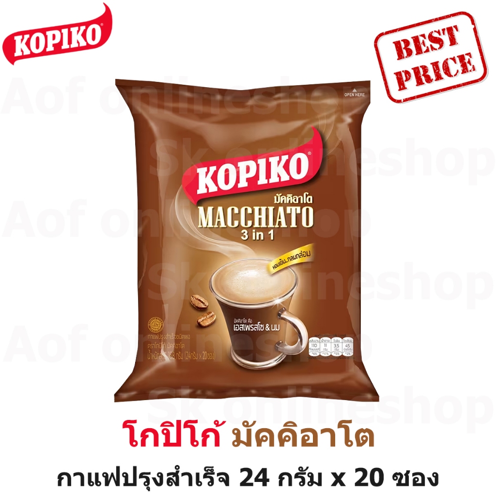 KOPIKO โกปิโก้ มัคคิอาโต กาแฟปรุงสำเร็จ 24 กรัม x 20 ซอง โกปิโก้ มัคคิอาโต กาแฟปรุงสำเร็จชนิดผง 3 อิน 1 สูตรมัคคิอาโต รสชาติเข้มข้นและอร่อยกลมกล่อม โดยมาพร้อมผงเอสเพรสโซ ที่เพิ่มความหอมให้กับกาแฟ เพื่อให้ได้ความหอมในแบบฉบับของมัคคิอาโต - กาแฟปรุงสำเร็จชนิดผง3 อิน 1 - รสชาติเข้มข้น อร่อยกลมกล่