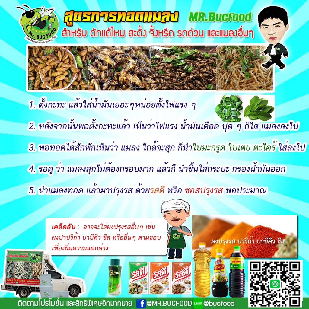 ... แต่ชอบ ส่วนประกอบในการทอด -จิ้งหรีด -น้ำมัน -ใบเตย .โหรพา -กระทะ -เตาเกส หรือใช้แบบ ปิ๊กนิก ก็ได้ กรณีทอดกินเอง หรือ มีลูกค้าไม่มาก -ตะลิ๋ว ตะแกรง ใช้ตัก -ที่พักน้ำมัน จะเป็น หม้อ หรือภาชนะที่สามารถใช้รองได้ -กระดาษซับมัน