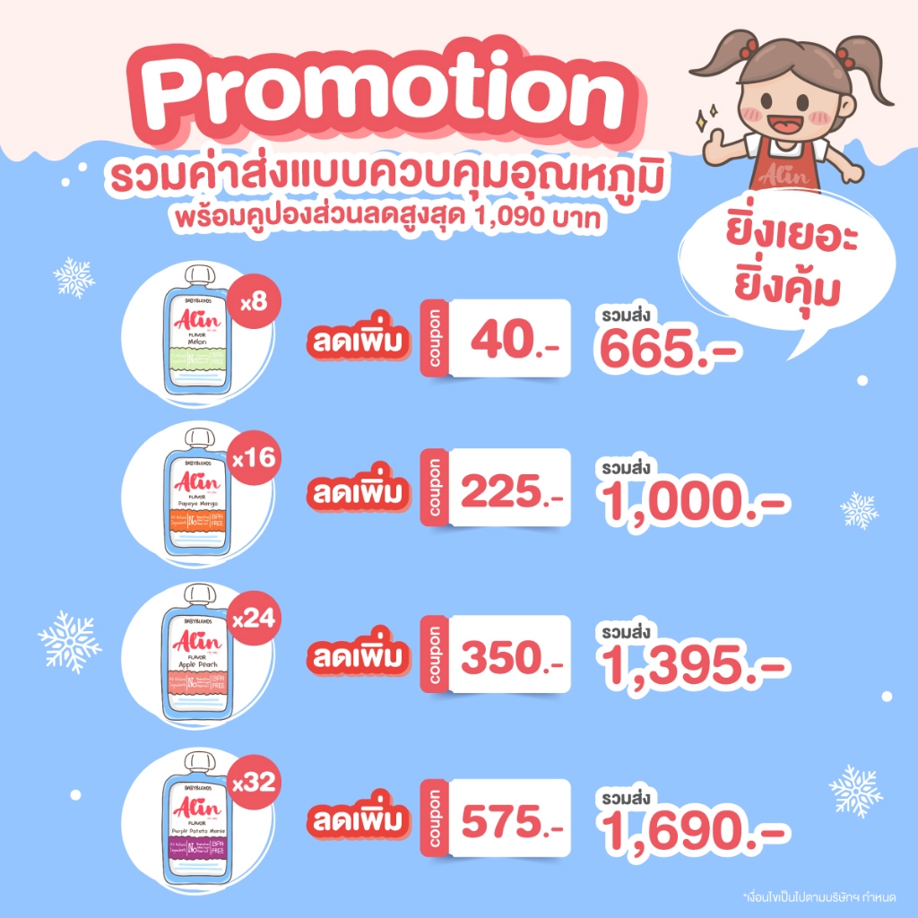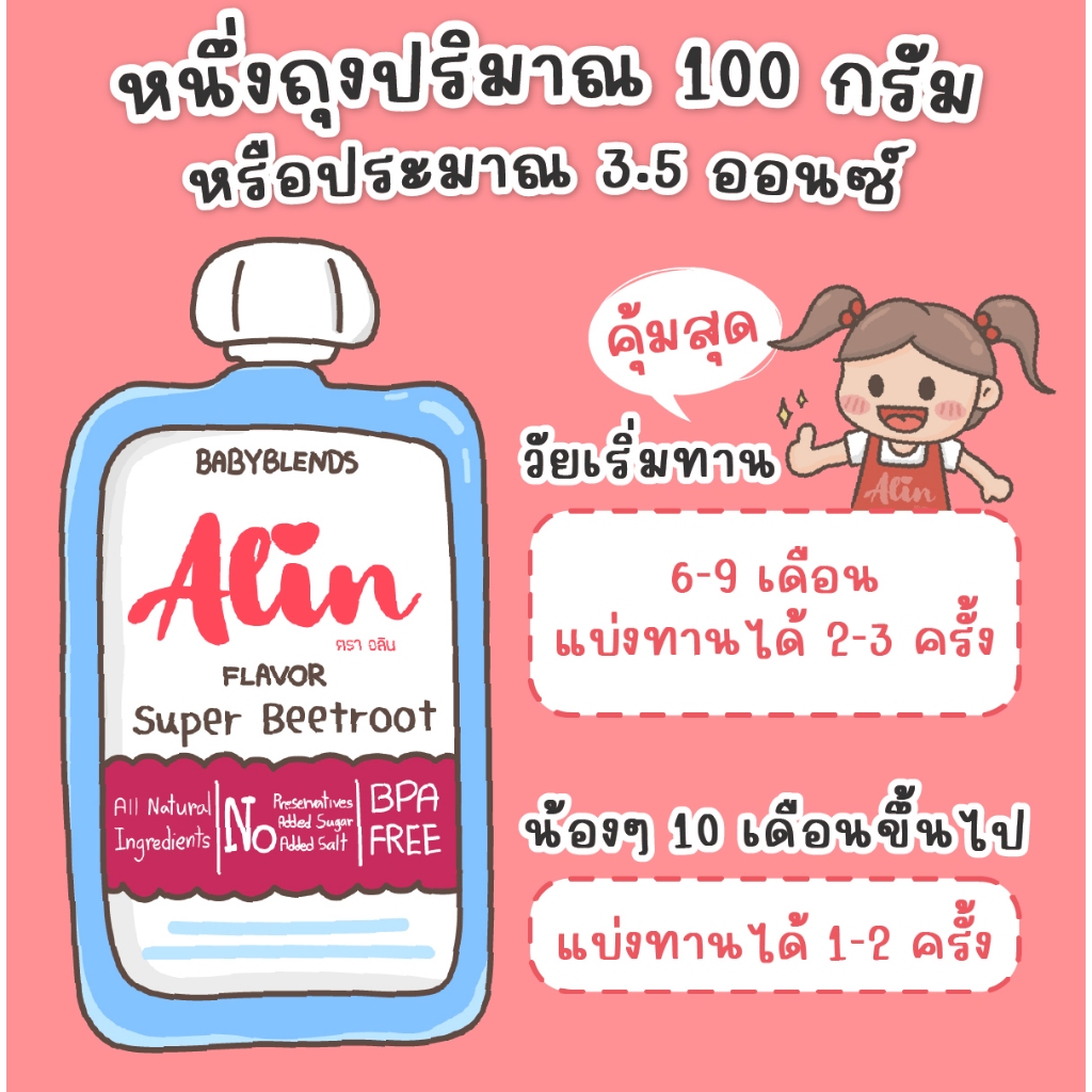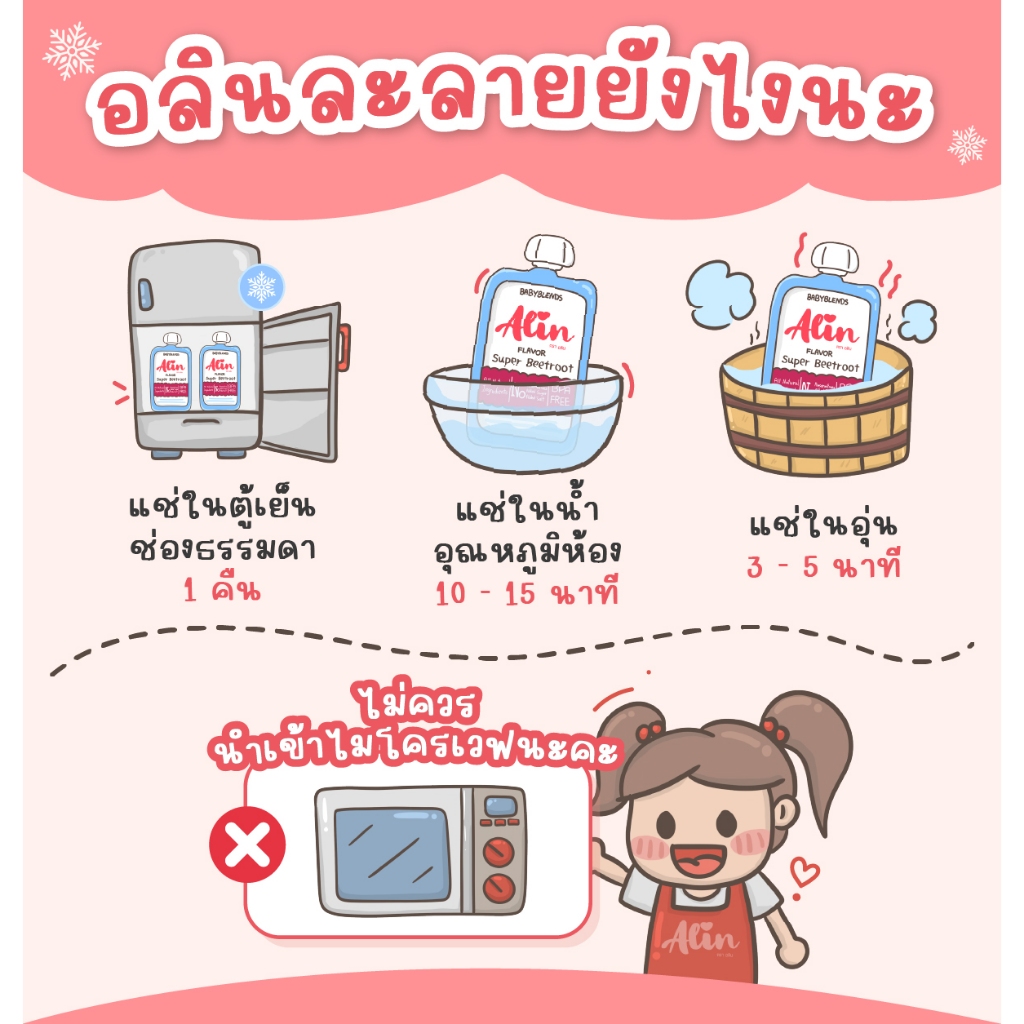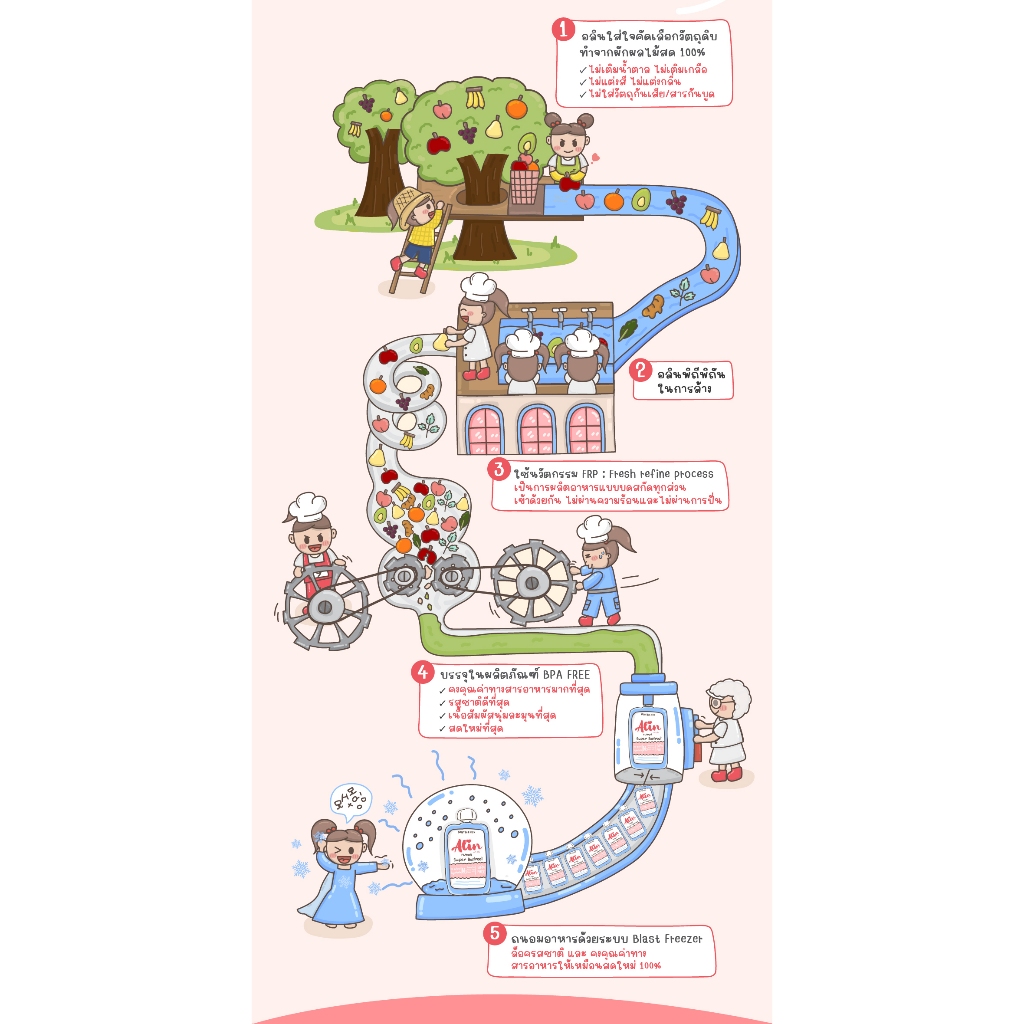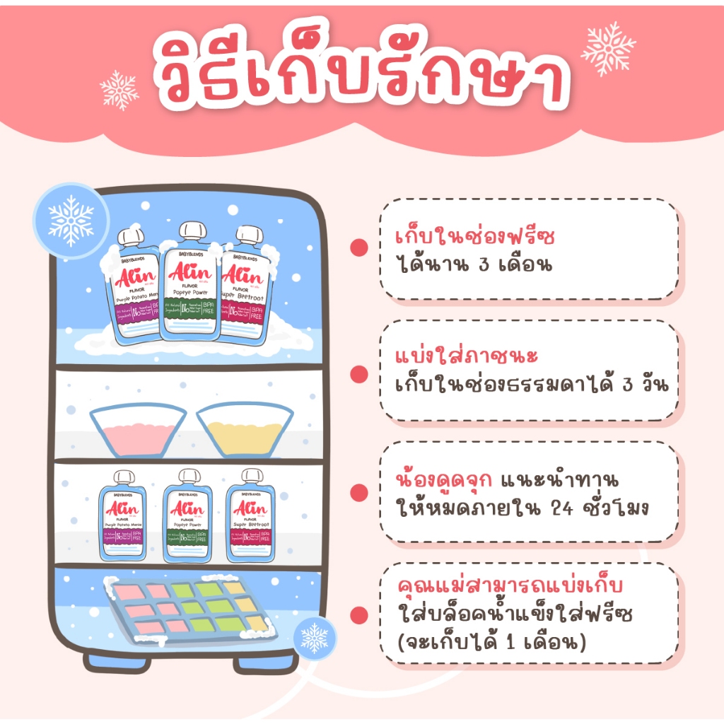 ... พรุน ที่มีฤทธิ์เป็นยาระบายอ่อนๆ ช่วยให้กระบวนการขับถ่ายทำงานได้ดีเยี่ยม! บอกเลยสายธาตุหนัก พลาดไม่ด้ายย อลินคัดสรรเฉพาะผักผลไม้ปลอดภัย ทำด้วยความเต็มใจและตั้งใจอย่างที่สุดเพื่อส่งมอบสินค้าที่ดีที่สุดให้คุณลูกค้าคนพิเศษ ที่เปรียบเหมือนครอบครัวของอลินทุกๆ คนค่ะ อลินเพียวเร่..เนื้อผักผลไม้ 100% เหมาะกับใคร? อลินเหมาะสำหรับน้องวัย 6 เดือนขึ้นไป หรือน้องๆที่คุณหมอประเมินให้เริ่มทานผักผลไม้ได้แล้ว ทานเป็นมื้อเสริมหรือมื้อว่าง และสามารถนำไปผสมข้าวบดทานเป็นมื้อหลักได้ สะดวกมากๆเลยค่ะ นอกจากนี้ อลินยังเหมาะสำหรับผู้สูงอายุ ผู้ป่วย ที่เคี้ยวผักผลไม้ลำบาก ทุกเพศทุกวัยที่ต้องการทานผักผลไม้และรักสุขภาพ ทานเป็นอาหารว่างหรือแทนของหวานได้เลยค่ะ เพราะอลินทำจากธรรมชาติ 100% อลินเพียวเร่…เนื้อผักผลไม้สด 100% ประโยชน์เพียวๆ ถุงเดียวรู้เรื่อง ผลิตด้วยนวัตกรรม FRP(Fresh refine process) ซึ่งเป็นการผลิตอาหารแบบใหม่ ที่บดทุกส่วนเข้าด้วยกัน ไม่ผ่านความร้อน ไม่ผ่านการปั่น เพื่อคงความสดใหม่และคงคุณค่าทางสารอาหารตามแบบธรรมชาติมากที่สุด เป็นนวัตกรรมเอกสิทธิ์เฉพาะของแบรนด์อลิน เจ้าแรกและเจ้าเดียวในเมืองไทย รสชาติอร่อย ทานง่าย ไม่เหม็นกลิ่นผัก เนื้อสัมผัสนุ่มละมุนลิ้น เหมือนได้ทานผักผลไม้สดๆจากลูก แม้คนที่ไม่ชอบทานผักผลไม้ยังติดใจในรสชาติที่เป็นเอกลักษณ์ของอลิน ไม่ใส่สารปรุงแต่งรสชาติ ไม่ใส่เกลือ/น้ำตาล ไม่ใส่วัตถุกันเสีย/สารกันบูด ใช้ผักผลไม้ปลอดภัย โรงงานผลิตมาตรฐาน GMP บรรจุภัณฑ์ Food grade USDA BPA-free เก็บรักษาด้วย *Blast freezer (*ระบบแช่แข็งอาหารคุณภาพสูงสุด) Alin family Taste to happiness ข้อควรระวัง สินค้าผลิตจากผักผลไม้ 100% หากมีโรคประจำตัวหรือแพ้อาหารบางชนิด แนะนำปรึกษาแพทย์ก่อนรับประทานนะคะ ห้ามนำผลิตภัณฑ์เข้าไมโครเวฟ รอบจัดส่ง ส่งทุกวันจันทร์-เสาร์ ตัดรอบทุกวัน 11.00 น. จ-พฤ จัดส่ง ทุกพื้นที่ ศ- กทม ปริมณฑล อีสาน*ยกเว้นพื้นที่อื่นๆ* ส.- จัดส่ง ทุกพื้นที่ *ยกเว้นภาคอีสาน* ระยะเวลาจัดส่ง กรุงเทพฯและปริมณฑล ภาคอีสาน 2-3 วันทำการ พื้นที่อื่นๆ 2-4 วันทำการค่ะ