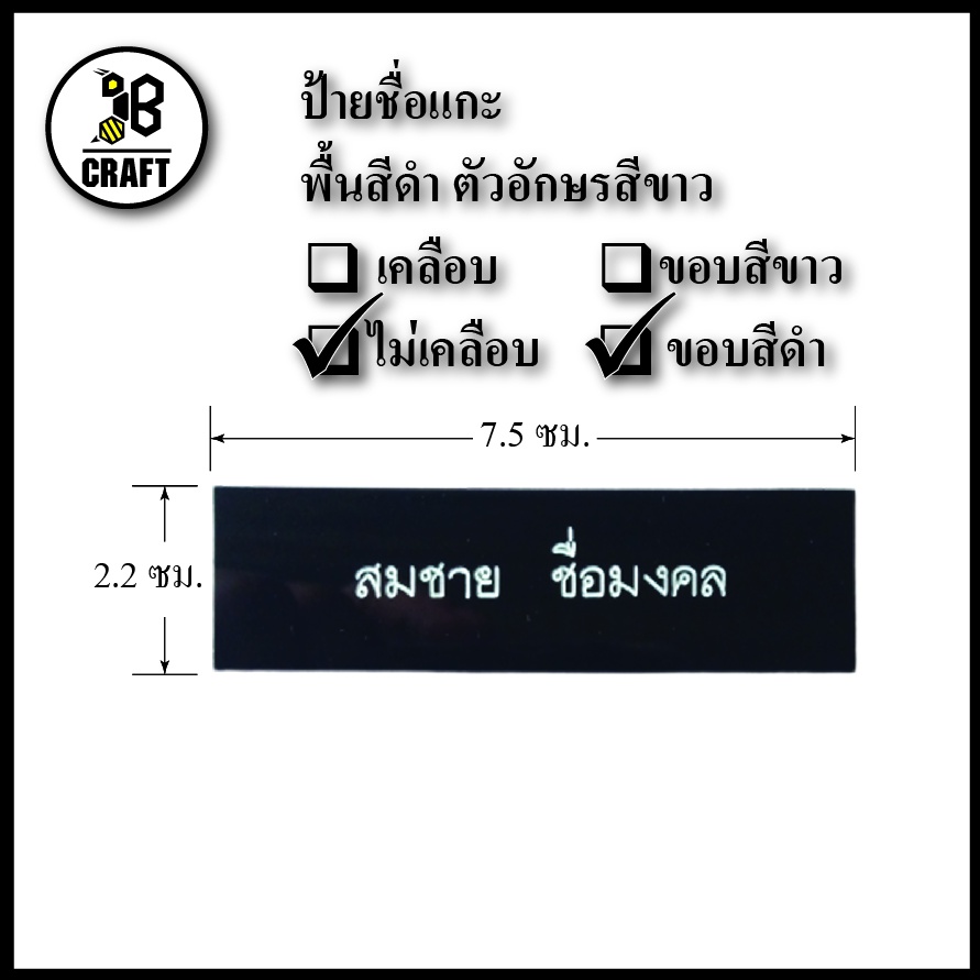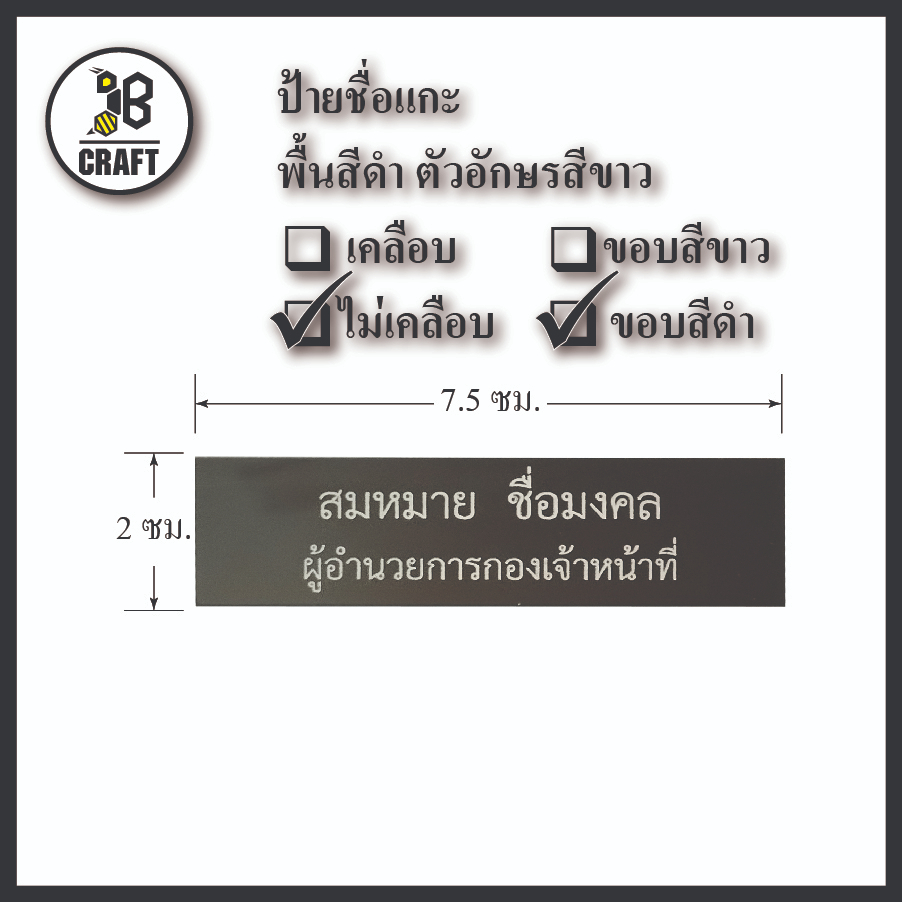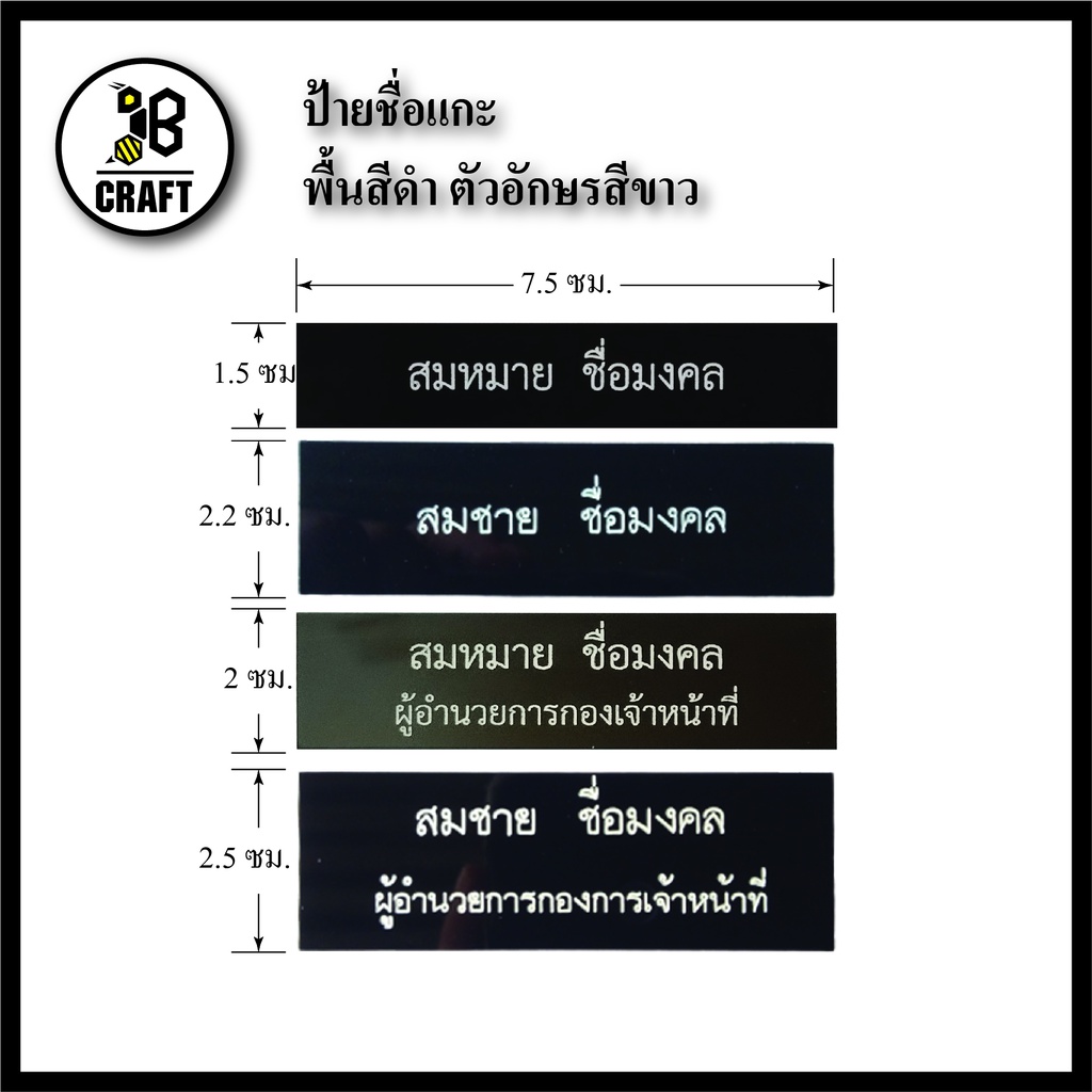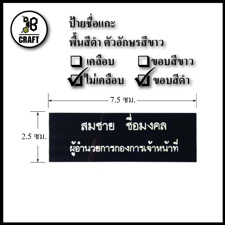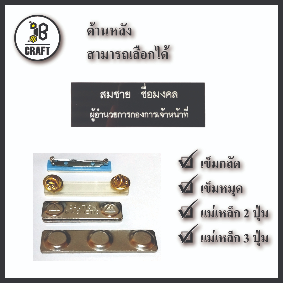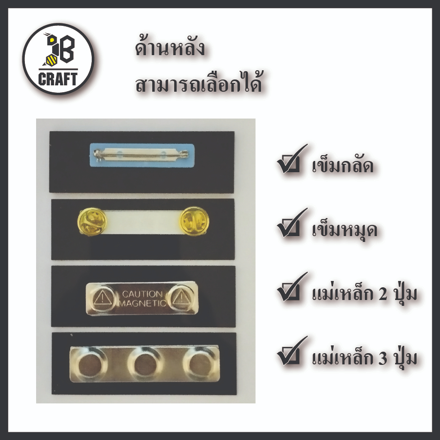 ป้ายชื่อ, ป้ายชื่อแกะ, ป้ายชื่อข้าราชการ, ป้ายชื่อติดหน้าอก วัสดุ : อะครีลิค สีดำ พื้นดำ ขอบดำ ตัวหนังสือสีขาว พร้อมติดเข็มกลัดด้านหลัง (สามารถเลือกเปลี่ยนเป็นเข็มหมุดหรือแม่เหล็กได้) 1 บรรทัด ขนาด 1.5 x 7.5 ซม. 1 บรรทัด ขนาด 2.2 x 7.5 ซม. 2 บรรทัด ขนาด 2.0 x 7.5 ซม. 2 บรรทัด ขนาด 2.5 x