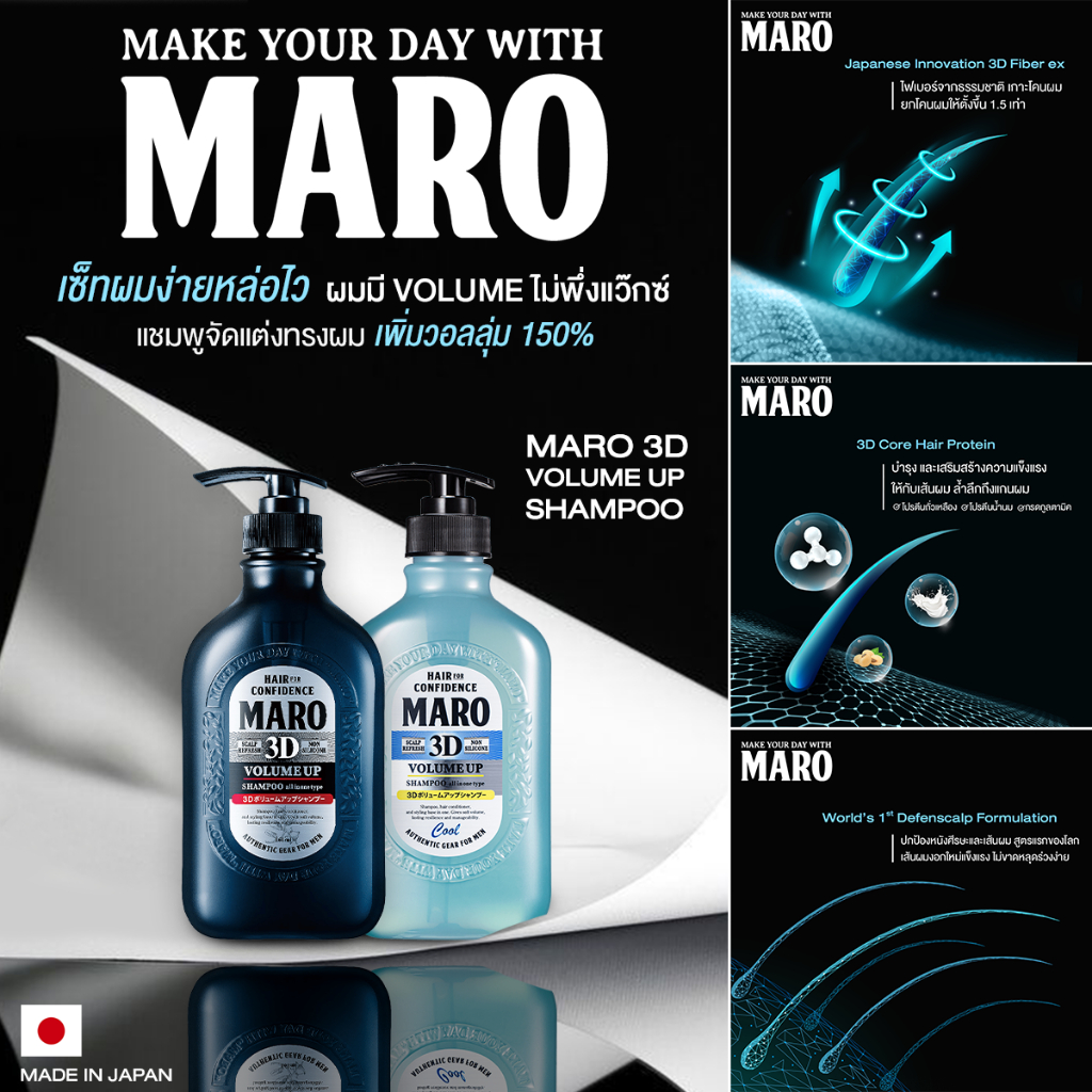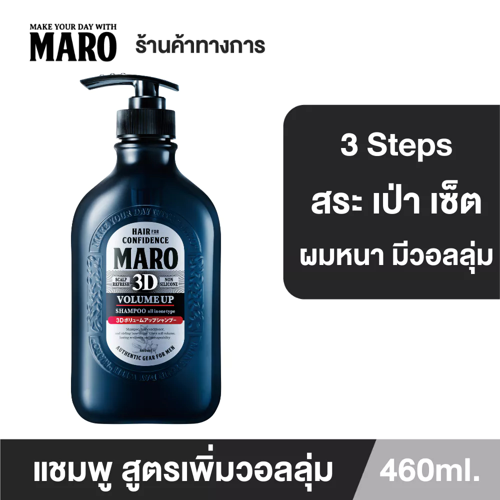 Maro 3D Volume Up Shampoo 460ML - มาโร่ ทรีดี วอลลุ่ม อัพ นวัตกรรมจากประเทศญี่ปุ่น ⚫ แชมพูที่ผสานนวัตกรรมใหม่จากญี่ปุ่น ใช้ ง่ายๆเพียง สระ เป่า เซ็ต ⚫ 🌟คุณสมบัติ🌟 ✔ เป็นแชมพูที่รวม Shampoo + Conditioner + Styling Base เข้าด้วยกัน ✔ นวัตกรรม 3D fiber ex ไฟเบอร์จากธรรมชาติ ช่วยยกโคนผมทำให้ผ