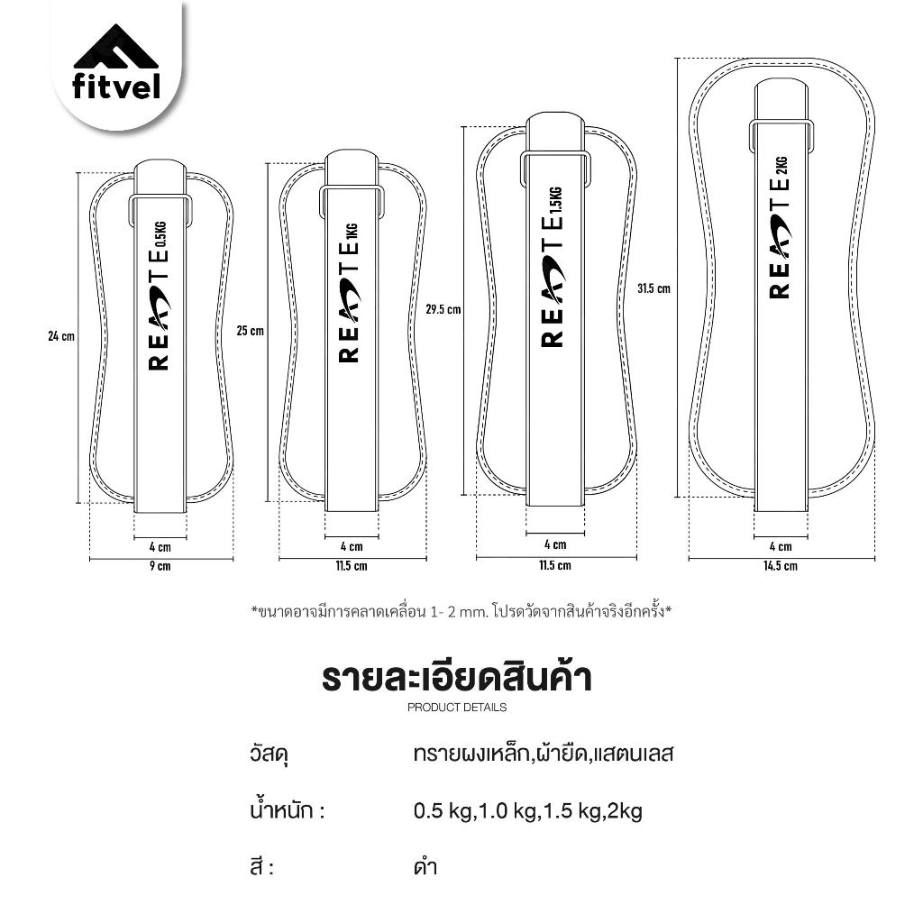 ... ายรัดตีนตุ๊กแกปรับได้ง่ายให้พอดีกับข้อเท้าและข้อมือ • ห่วงโลหะทนต่อการยึดสายรัดให้แน่นไม่มีหลุด • การเย็บตะเข็บที่แน่นหนา ใช้เป็นประจำได้ทุกวัน • จุดสีดำเป็นเม็ดทรายผงเหล็กเล็กละเอียด ┄┄┄┄┄┄┄┄┄┄┄┄┄┄┄┄┄┄ รายละเอียดสินค้า • วัสดุผ้าไนล่อน / ผ้าไลคร่า / ทรายผงเหล็ก • น้ำหนักข้างละ 0.5 / 1 / 1.5 / 2 KG. • สีดำ • จำนวน 1 คู่ (2ชิ้น) ** น้ำหนักสินค้าเป็นน้ำหนักต่อ 1 ข้าง ** เช่น 1 KG. = ถุงทรายข้างละ 1 KG. จำนวน 1 คู่ (2ข้าง) ┄┄┄┄┄┄┄┄┄┄┄┄┄┄┄┄┄┄ คำแนะนำการใช้งาน • ภาพสินค้าเรดเต้เป็นสินค้าจริงที่ถ่ายทำเพื่อการโฆษณา • สีสินค้าจริงอาจแตกต่างกันขึ้นอยู่กับแสงและจอแสดงผล • ของแท้แบรนด์เรดเต้เท่านั้น • ขนาดสินค้าอาจคลาดเคลื่อน 1-3 CM. • ควรตรวจสอบอุปกรณ์ทุกครั้งก่อนใช้งาน • ไม่ควรเก็บไว้ในที่ร้อนจัดหรืออับชื้น • จำเป็นต้องยืดกล้ามเนื้อก่อนการออกกำลังกายทุกครั้ง • ตากในที่ร่ม ไม่ควรตากในที่แดดจัด • ห้ามปั่นแห้ง ห้ามรีดด้วยความร้อน • ห้ามซักโดยเด็ดขาด ┄┄┄┄┄┄┄┄┄┄┄┄┄┄┄┄┄┄ การจัดส่งสินค้า • ทางร้านจัดส่งทุกวันจันทร์ - วันเสาร์ • ตัดรอบส่งสินค้าเวลา 08.00 น. หากไม่ทันจะจัดส่งรอบถัดไป • หยุดวันอาทิตย์ วันนักขัตฤกษ์ และ วันหยุดพิเศษบริษัทฯ ┄┄┄┄┄┄┄┄┄┄┄┄┄┄┄┄┄┄ การเปลี่ยนที่อยู่จัดส่งสินค้า • หากยังไม่มีเลข tracking ลูกค้าสามารถเปลี่ยนที่อยู่เองได้เลย • หากมีเลข tracking แล้วจะไม่สามารถเปลี่ยนที่อยู่ได้ • โปรดเข้าใจร้านค้าไม่สามารถแก้ไขข้อมูลส่วนตัวของลูกค้าได้ ┄┄┄┄┄┄┄┄┄┄┄┄┄┄┄┄┄┄ การติดตามสถานะคำสั่งซื้อ • สถานะขนส่งไม่อัพเดทเกิน 3 วัน โปรดทักแชทแจ้งแอดมิน