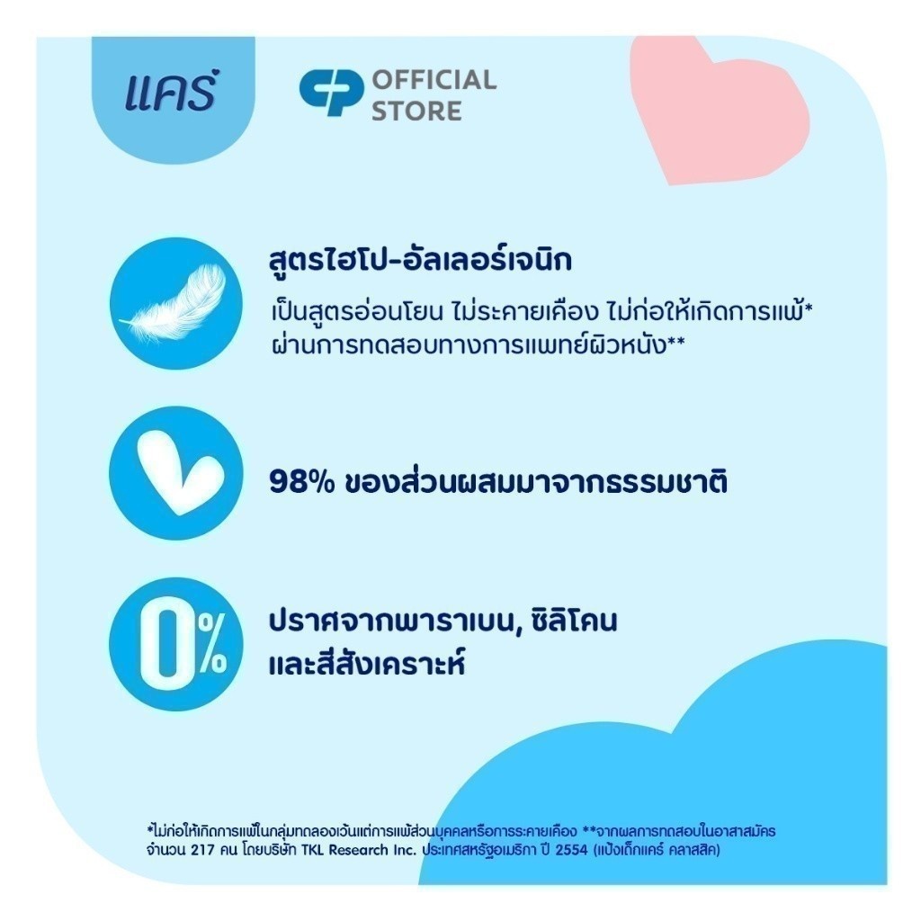 ... ฮโป อัลเลอร์เจนิกและทางการแพทย์ผิวหนังสหรัฐอเมริกา** แล้วว่าเป็นสูตรที่อ่อนโยน ไม่ระคายเคือง ไม่ก่อให้เกิดการแพ้* จึงปลอดภัยต่อผิวบอบบางเสมือนผิวลูกน้อย - หมายเหตุ: ไม่ก่อให้เกิดการแพ้ในกลุ่มทดลองเว้นแต่การแพ้ส่วนบุคคลหรือการระคายเคือง - แคร์ ฮายขมิ้น ช่วยลดผดผื่นที่เกิดจากความเปียกชื้นให้ลูกน้อยแห้งสบายตัว *ไม่ก่อให้เกิดการแพ้ในกลุ่มทดลองเว้นแต่การแพ้ส่วนบุคคลหรือการระคายเคือง **จากการทดสอบในอาสาสมัครจำนวน192 คน โดยบริษัท TKL Research Inc. ประเทศสหรัฐอเมริกา ปี 2558 [แป้งเด็ก, แป้งเด็กแคร์, แป้งฝุ่น, แป้ง] Care baby talcum consists of hypoallergenic formula which has been approved by American Dermatological Association** that the product is gentle, non-irritate, and hyopallergenic*, so it is safe for sensitive skin like baby's one. Care Hi-Kamin" helps alleviate rash from wetness, soothing baby's skin *Not causing allergic reaction in the test study group except the individual allergic reaction ** from the study in 192 volunteers by TKL Research Inc. USA 2015 [Personal Care]