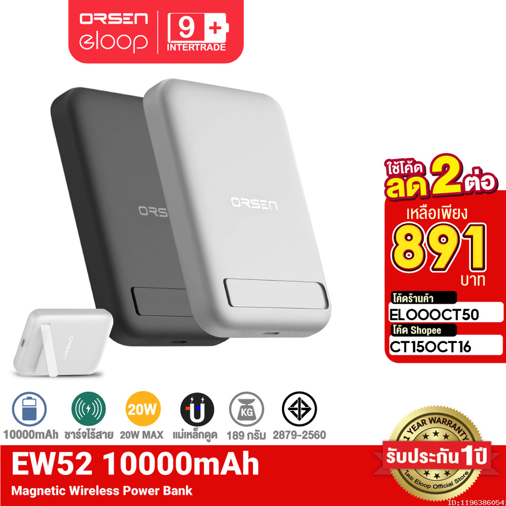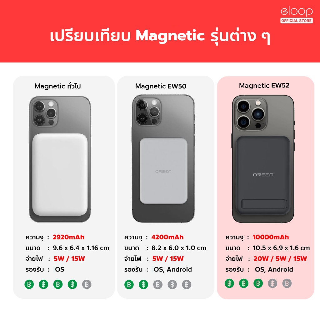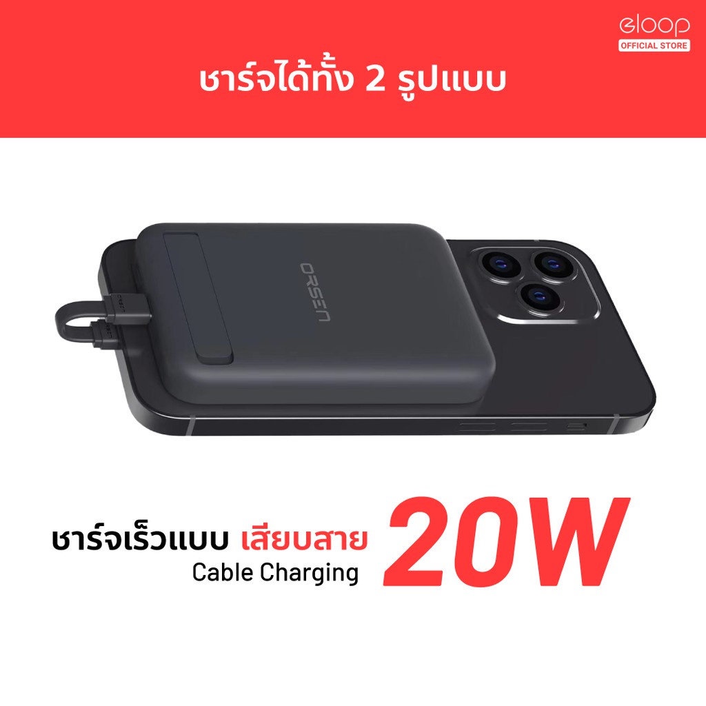 ... 5W / 20W มาพร้อมฐานตั้งสำหรับวางมือถือในตัว# คุณสมบัติสินค้า # ・ แบตเตอรี่สำรอง MagCharge Magnetic ความจุ 10000 mAh ・ ความจุมากกว่า MagCharge Magnetic Battery Pack ทั่วไป ในขนาดที่ใกล้เคียงกัน ・ ใช้สำหรับ Phone 12 / 13 / 14 / 4 สามารถใช้ MagCharge Magnetic โดยไม่ต้องใส่เคส ・ ระบบแม่เหล็กยึดแน่น ไม่หลุด พกพาได้สะดวกยิ่งขึ้น ・ รองรับชาร์จไร้สาย QI Wireless Charge สูงสุด 15W ・ จ่ายไฟ 7.5W Max ใช้สำหรับ Phone / 15W Max สำหรับ Android (รุ่นที่รองรับ) ・ สามารถจ่ายไฟให้แบตสำรอง และชาร์จมือถือในขณะเดียวกันได้ ・ Output Type C 20W (Max) เพิ่มความรวดเร็วในการชาร์จมากขึ้น ・ รองรับชาร์จเร็ว PD 20W สำหรับ 12 / 13 / 14 ขึ้นไป ・ Input Type C 20W ชาร์จตัวแบตสำรองได้รวดเร็วขึ้น 2 เท่า ・ มีไฟ LED แสดงสถานะการทำงานและปริมาณความจุของแบตเตอรี่สำรอง ・ ใช้กับสายชาร์จแบบสั้น S10C / S10L ได้อย่างลงตัว ・ ออกแบบฐานตั้งสำหรับวางมือถือในตัว เพิ่มความสะดวกสบาย ・ ได้รับมาตรฐานสากล CE, FCC, RoHS, มอก. # ไฟแสดงสถานะ # ที่ตัวแบตเตอรี่สำรอง จะมีไฟ LED สีขาว บอกสถานะการทำงานอยู่ และระดับแบตเตอรี่ขณะใช้งานได้อีกด้วย ・ ไฟ LED ติด 4 ดวง - แบตเตอรี่อยู่ในระดับ 75% - 100% ・ ไฟ LED ติด 3 ดวง - แบตเตอรี่อยู่ในระดับ 50% - 75% ・ ไฟ LED ติด 2 ดวง - แบตเตอรี่อยู่ในระดับ 25% - 50% ・ ไฟ LED ติด 1 ดวง - แบตเตอรี่อยู่ในระดับ 0% - 25% ・ ไฟ LED สีเขียว ติด 1 ดวง - แสดงสถานะการชาร์จเร็ว หรือ Fast Charging # รายละเอียดสินค้า # แบตสำรองแบรนด์สุดฮิตรุ่นใหม่ล่าสุดจาก Orsen by Eloop รุ่น EW52 10000mAh PD20W ชาร์จพลังให้กับอุปกรณ์พกพาต่างๆ ได้รวดเร็วยิ่งขึ้นด้วยเทคโนโลยี Qi Wireless Charge รองรับการชาร์จไร้สายสูงสุด 7.5W สำหรับ 12 ขึ้นไป และรองรับ 15W สำหรับสมาร์ทโฟนรุ่นอื่นๆที่รองรับ # ข้อมูลทางเทคนิค # ・ แบรนด์ : Orsen By Eloop ・ รุ่น : EW52 ・ Input (Type C) : 5V/2.4A 9V/2.22A ・ Output (Type C) : 5V/3A 9V/2.22A 12V/1.67A ・ Wireless Charge : 5W / 7.5W / 10W / 15W MagCharge Magnetic ・ Total Output : 20W (Max) ・ ความจุแบตเตอรี่ : 10000 mAh ・ ชนิดแบตเตอรี่ : Li-Polymer ・ เวลาที่ใช้ชาร์จแบตสำรอง (Charging Time) : ประมาณ 3 ชั่วโมง # ขนาดและน้ำหนัก # ・ น้ำหนักสินค้า : 189 กรัม ・ น้ำหนักสินค้ารวมแพ็คเกจ : 273 กรัม ・ ขนาดสินค้า : 6.9 x 10.5 x 1.6 cm ・ ขนาดสินค้ารวมแพ็คเกจ : 8.2 x 11.3 x 3.3 cm # อุปกรณ์ในกล่อง # 1 x Eloop EW52 10000 mAh 1 x สายชาร์จ Type C to Type C 1 x ซองผ้า 1 x คู่มือภาษาอังกฤษ