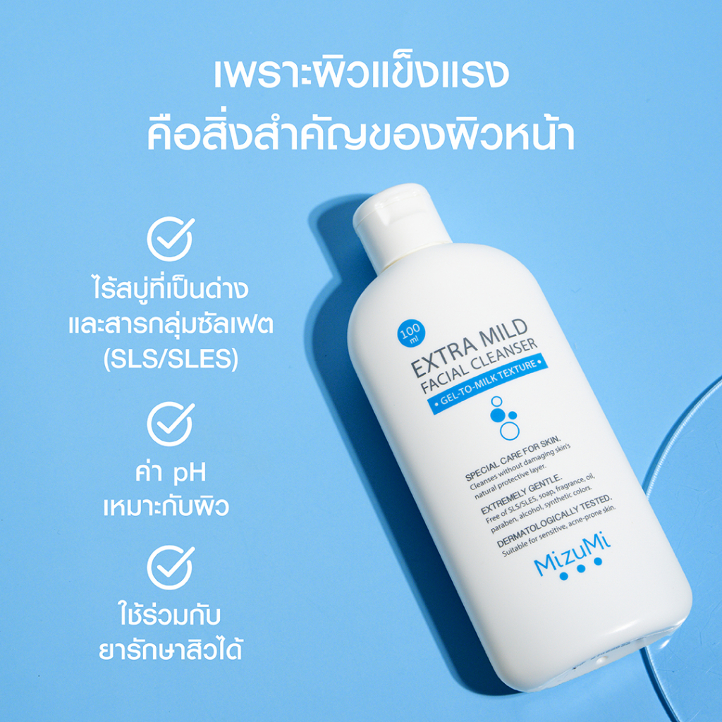 MizuMi EXTRA MILD FACIAL CLEANSER 100ml. เจลล้างหน้า สูตรอ่อนโยนพิเศษ ลดการชะล้าง เกราะป้องกันผิว ✅ลดการชะล้างเกราะป้องกันผิวตามธรรมชาติ ให้ผิวแข็งแรง ไม่เป็นสิวง่าย 💙 ไร้สบู่ที่เป็นด่างและสารกลุ่มซัลเฟต (SLS/SLES) ทําความสะอาดผิว อย่างอ่อนโยน ลดการชะล้างสารให้ความชุ่มชื้นผิวตาม