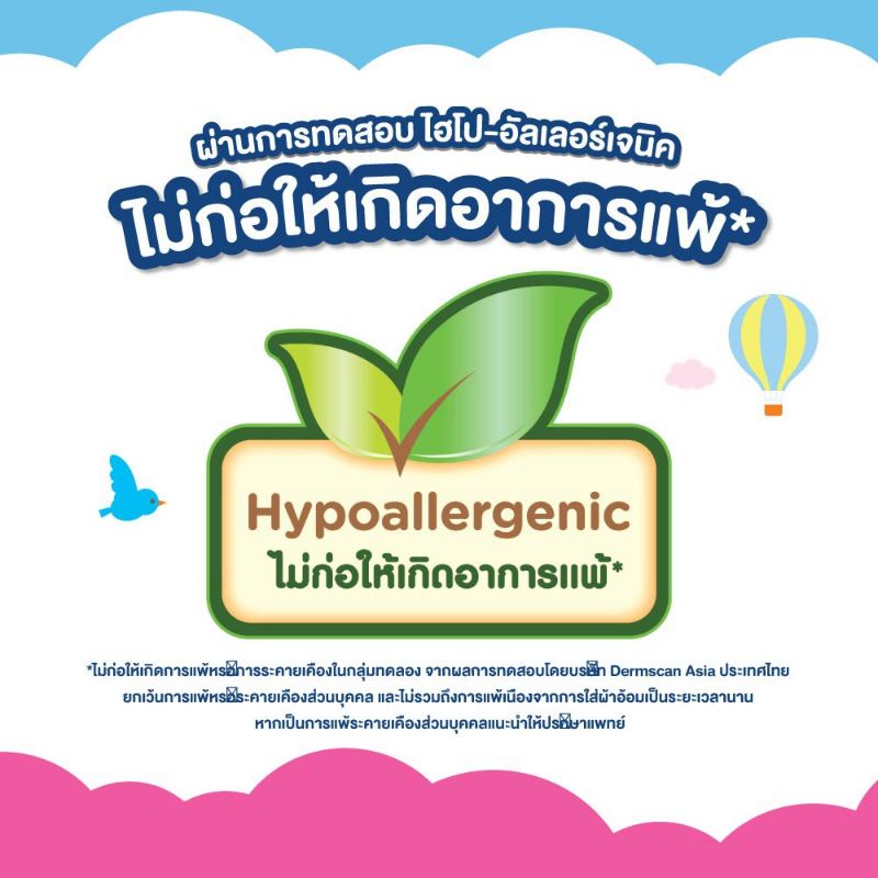 ... ้ลูกน้อยรู้สึกสบายตัว ไม่ร้อน ไม่อับชื้น พร้อมขอบเอวเว้าสะดือ เพื่อเลี่ยงการสัมผัสบริเวณสะดือที่ยังไม่แห้งของทารกแรกเกิด -ผ่านการทดสอบไฮโป-อัลเลอร์เจนิค ไม่ก่อให้เกิดอาการแพ้* อ่อนโยนต่อผิวสัมผัสลูกน้อย *ไม่ก่อให้เกิดการแพ้หรือการระคายเคืองในกลุ่มทดลอง จากผลการทดสอบ โดยบริษัท Dermscan Asia ประเทศไทย ยกเว้นการแพ้ หรือการระคายเคืองส่วนบุคคล และไม่รวมถึงการแพ้เนื่องจากการใส่ผ้าอ้อมเป็นระยะเวลานาน หากเป็นการแพ้ระคายเคืองส่วนบุคคลแนะนำให้ปรึกษาแพทย์ -สัมผัสนุ่ม ผิวหน้าสัมผัสนุ่ม อ่อนโยน ซึมซับได้ดี ไม่อับชื้น -พาวเวอร์เจล ดูดซับของเหลวได้อย่างรวดเร็วและซึมซับยาวนานสูงสุด 10 ชม. ช่วยให้ผิวลูกน้อยแห้ง สบายผิว สบายตัว -ขอบขาพิเศษ ด้วยการออกแบบขอบขาพิเศษ ป้องกันการรั่วซึมบริเวณขอบขาด้านข้างของลูกน้อย -ซอฟท์อีซี่เทป แถบเทปสุดนุ่ม สามารถปรับขยับง่ายตามต้องการ เพื่อความกระชับรับกับสรีระของเด็กแรกเกิด -แถบวัดความเปียกชื้น เมื่อแถบวัดความชื้นเปลี่ยนจากสีเหลืงเป็นสีเขียวก็ได้เวลาเปลี่ยนผ้าอ้อมแล้ว *หากผลิตภัณฑ์ถูกเก็บในที่ชื้น แถบวัดความเปียกชื้นอาจจะเปลี่ยนเป็นสีเขียวก่อนใช้ ซึ่งไม่มีผลกระทบต่อคุณภาพของผลิตภัณฑ์ -ขอบเอวเว้าสะดือ ออกแบบเว้าพิเศษ เพื่อป้องกันสะดือที่ยังไม่แห้งของเด็กแรกเกิด *ภาพสินค้าเป็นเพียงตัวอย่าง สินค้าจริงอาจแตกต่างจากภาพเล็กน้อย