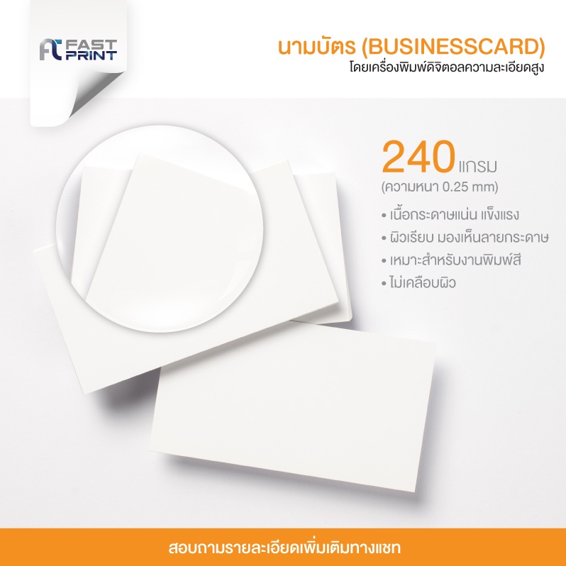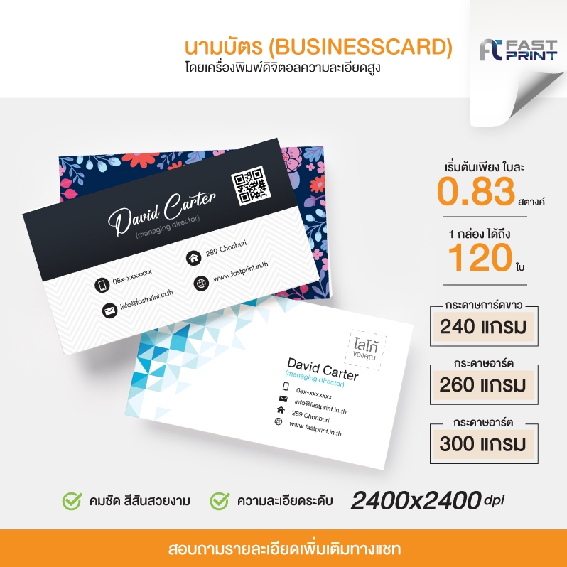 นามบัตรกระดาษอาร์ต การ์ดขาว 260,300 แกรม เริ่มต้นเพียงใบละ 0.83 สตางค์ โดยเครื่องพิมพ์ดิจิตอลคุณภาพสูง คมชัด สีสันสวยงาม