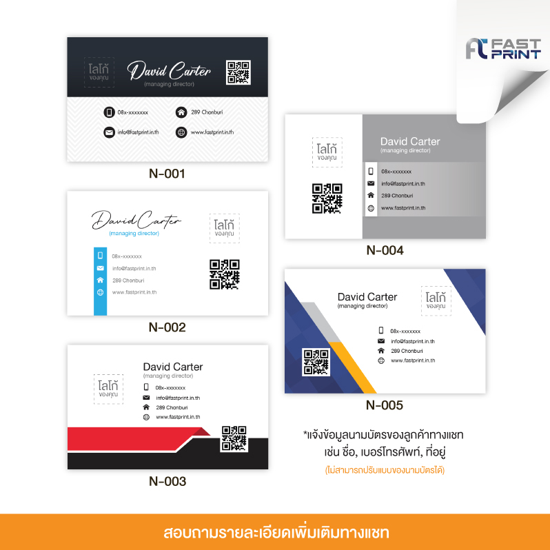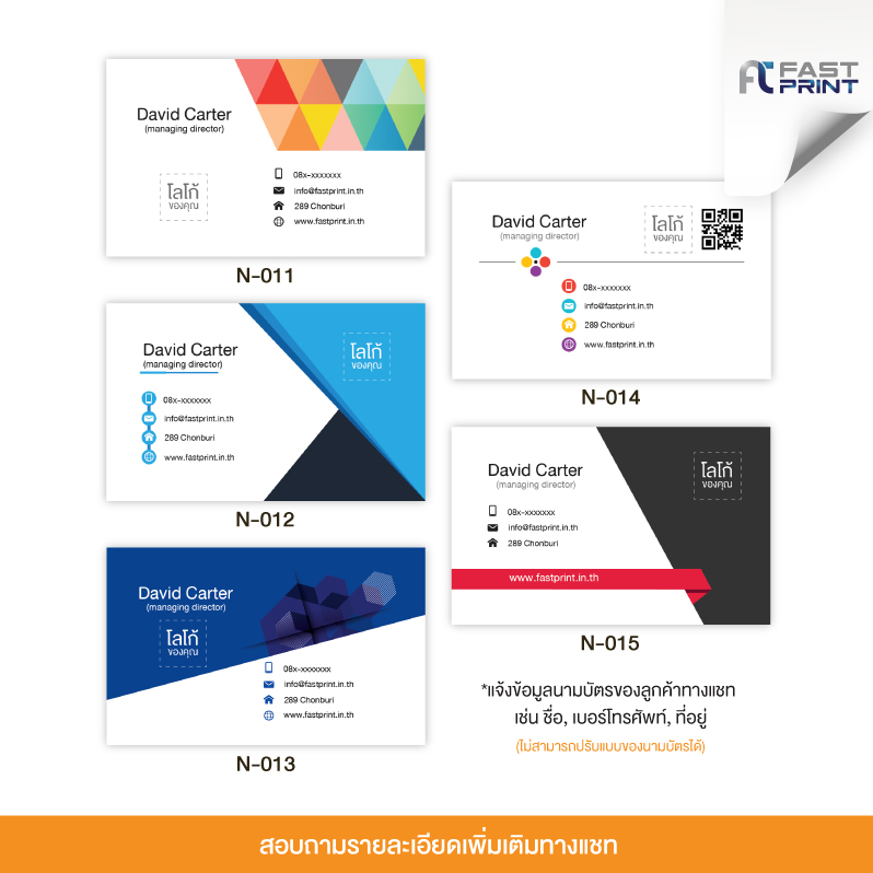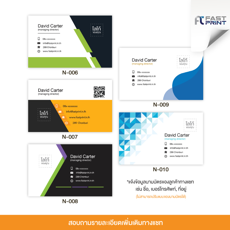 ... งใบละ 0.83 สตางค์ (ผิวมันเงา) นามบัตรกระดาษอาร์ต 300 แกรม เพียงใบละ 1.25 บาท (ผิวมันเงา) นามบัตรกระดาษการ์ดขาว 240 แกรม เพียงใบละ 1.25 บาท (ผิวด้าน, ผิวกระดาษ) การส่งไฟล์ให้ทางร้าน ***มีไฟล์พร้อมพิมพ์*** ***ลูกค้าเลือกแบบสำเร็จรูปของทางร้าน พร้อมแจ้งข้อมูลส่วนตัวทางแชท*** 1 แบบต่อ 1 กล่อง ไม่สามารถคละแบบได้