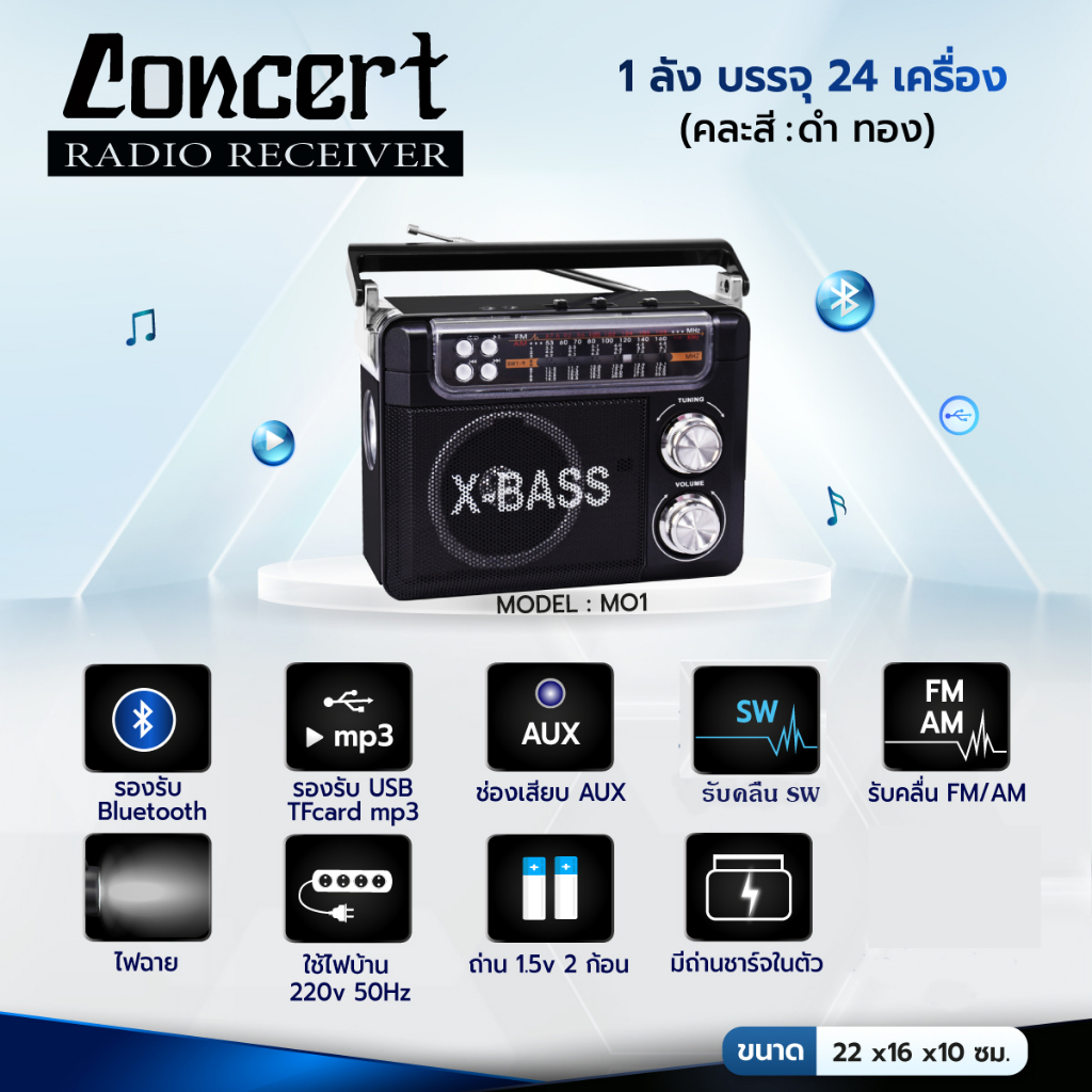 วิทยุ FM AM Mp3 bluetooth Concert CC-901BT พร้อมสายไฟ รับสัญญาณวิทยุ FM AM SW รองรับMp3 ฺBluetooth USB SDcard micro card Aux input ไฟฉาย ใช้ถ่านได้ ใช้ไฟบ้านได้ มีถ่านชาร์ทในตัว ถ่านชาร์ท สามารถซื้อเปลี่ยนใหม่ได้ กรณีแบตเตอรี่เสื่อม ง่ายๆแค่เปลี่ยน มอก. 1195-2536 ลำโพงเป็นขอบยาง เส