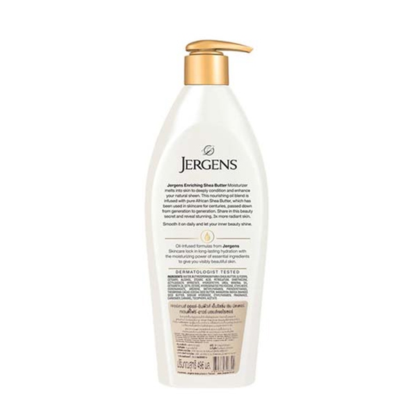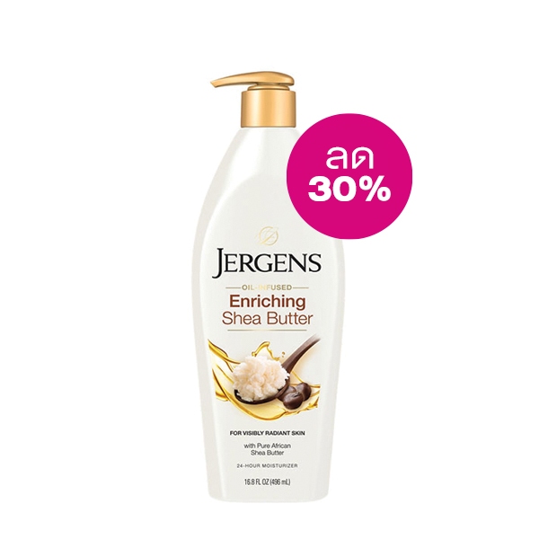 Jergens Oil-Infused Enriching Shea Butter 24-Hour Moisturizer 496 ml เจอร์เกนส์ ออยล์-อินฟิวส์ เอ็นริชชิ่ง เชีย บัตเตอร์ ทเวนตี้โฟร์-อาวร์ มอยส์เจอไรเซอร์ 496 มล. ซึมซาบเข้าฟื้นบำรุงผิวอย่างล้ำลึกเพื่อผิวดูเปล่งประกายอย่างเป็นธรรมชาติ สูตรผสานน้ำมันปรนนิบัติผิวและ African Shea Butter ส่วนผสมเพื่