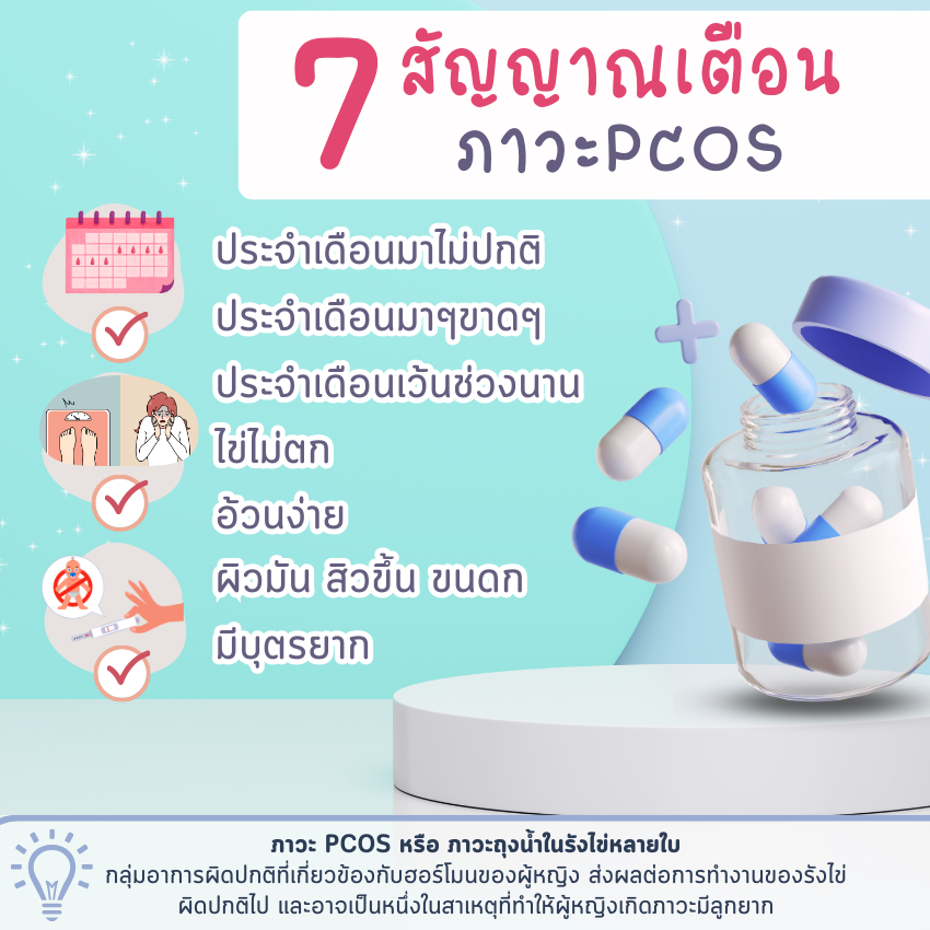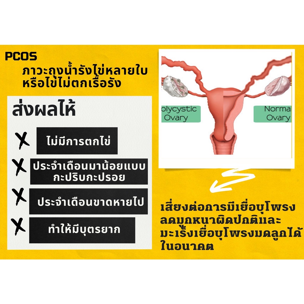 ... วนมาก เชื่อว่าการที่มีระดับเทสโทสเทอโรนมากจะมีผลไปลดความไวต่ออินซูลินของร่างกาย ซึ่งอินซูลิน มีหน้าที่ตอบสนองในภาวะที่น้ำตาลมาก โดยการขนน้ำตาลในเลือดไปไว้ที่เซลล์เพื่อนำไปเปลี่ยนเป็นพลังงาน ผู้หญิงที่มีภาวะ PCOS นั้น เซลล์ของร่างกายจะมีความไวต่ออินซูลินต่ำ ทำให้ส่งผลมีระดับฮอร์โมนอินซูลินที่สูงขึ้น และมีระดับฮอร์โมนเพศชายเพิ่มมากขึ้น ตามงานวิจัย พบว่า สาร Inositol หรือวิตามินบี 8 มีประโยชน์อย่างมากโดยเฉพาะในผู้หญิงที่มีภาวะ polycystic ovary syndrome (PCOS) โดยอิโนซิทอลจะช่วยให้อินซูลินทำงานดีขึ้น และเยียวยาภาวะถุงน้ำในรังไข่ หรือ ภาวะ PCOS เป็นสาเหตุหลักที่ทำให้ผู้หญิงมีบุตรยาก เพราะภาวะนี้ส่งผลให้ ไข่ไม่ตกเรื้อรัง ประจำเดือนขาดหาย ฮอร์โมนไม่สมดุล ซึ่งทำให้ผู้หญิงท้องยาก inositol จะช่วยในภาวะ PCOS โดยจะช่วยให้ร่างกายของเราสามารถนำอินซูลินไปใช้ได้อย่างมีประสิทธิภาพ และยังช่วยให้เกิดความสมดุลของฮอร์โมนซึ่งจะมีผลให้การทำงานของรังไข่ดีขึ้น Inositol ช่วยปรับระบบเผาผลาญ ช่วยให้ประจำเดือนมาสม่ำเสมอและไข่ตกเองได้ตามธรรมชาติ วิตามิน อิโนซิทอล กระปุกนี้ มีส่วนประกอบ ✅ INOSITOL 150 mg ✅ EPA AND DHA 300 mg ✅ L-THREONINE 70 mg ✅ GINKGO LEAF EXTRACT 25 mg ✅ L-LEUCINE 12.5 mg ✅ L-ISOLEUCINE 12.5 mg ✅ L-PROLINE 12.5 mg ✅ L-VALINE 12.5 mg ✅ GAMMA ORYZANOL 5 mg ขนาดบรรจุ 30 แคปซูล รับประทานครั้งละ 1-2 แคปซูล ก่อนนอน