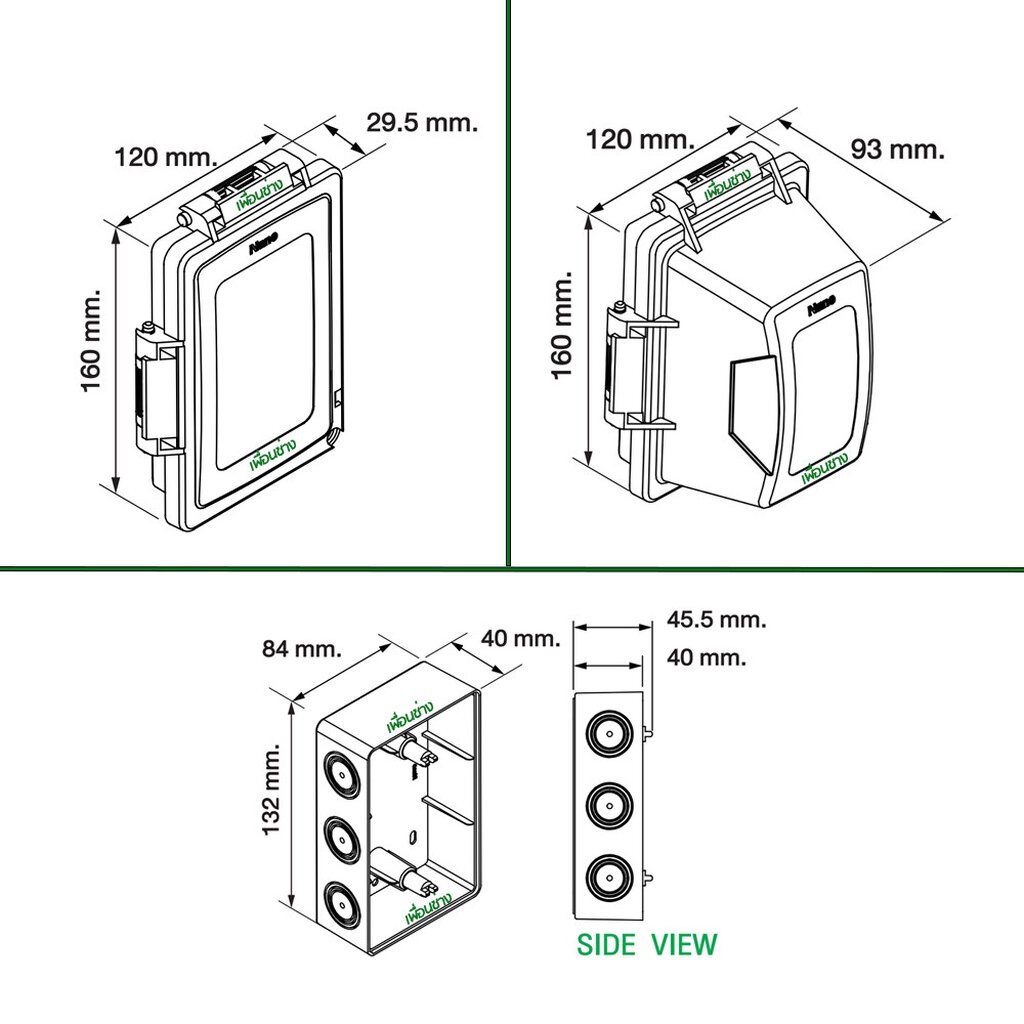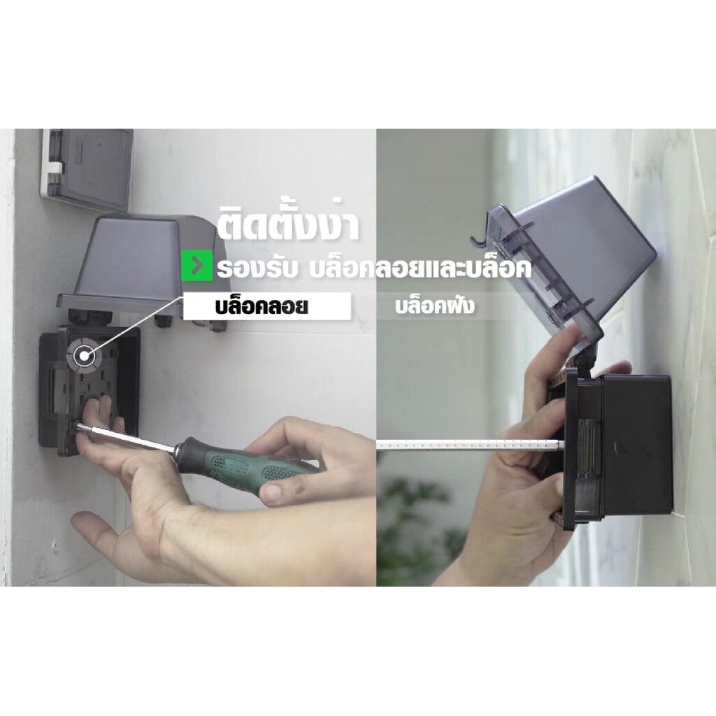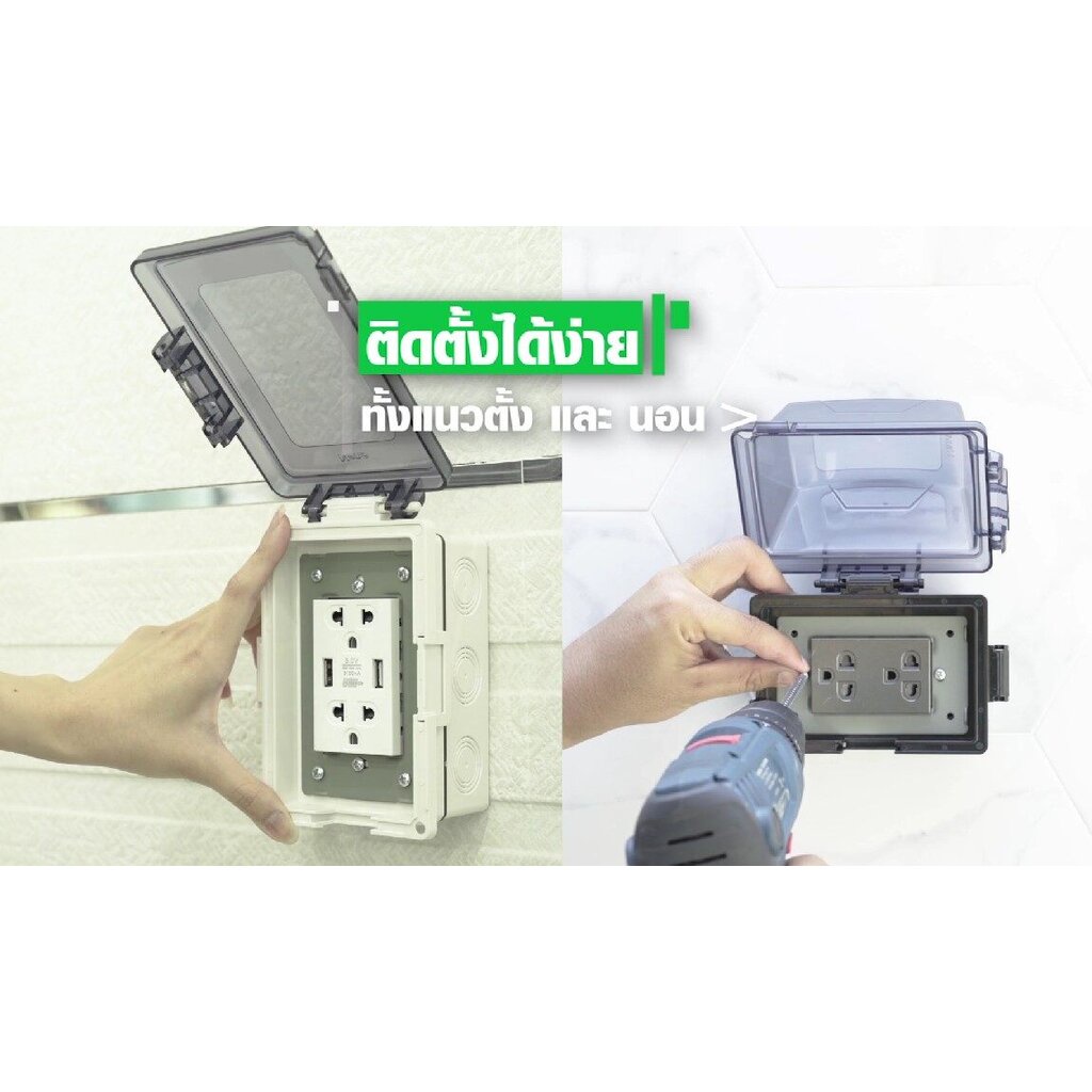 ... อื่นๆของยี่ห้ออื่น - สามารถเลือกให้เปิดได้ ด้านข้าง หรือ ด้านบน ใหม่ !!! ฝาครอบแผงหน้ากากกันน้ำ แบรนด์แรก และแบรนด์เดียวในประเทศไทย ที่สามารถเสียบปลั๊กใช้งานแล้วปิดฝาเพื่อกันน้ำกระเด็นเข้าเต้ารับ สะดวกปลอดภัยแน่นอน คุณสมบัติและจุดเด่นของสินค้า 1.ผลิตจากพลาสติก ABS ทำให้มีความทนทานต่อสภาพแวดล้อม และทนทานต่อการกัดกร่อนในทุกสภาวะอากาศ ทนความร้อนได้ถึงอุณหภูมิ 80C (ฝาใสผลิตจากPC) 2. มีน้ำหนักเบา แข็งแรง ทนทานต่อแรงกระแทก 3. ปลอดภัยจากกระแสไฟฟ้ารั่ว เนื่องจากทำจากพลาสติกซึ่งเป็นฉนวนไฟฟ้า 4. มียางกันน้ำ ป้องกันการรั่วซึมของน้ำเข้าภายใน และผ่านการทดสอบมาตรฐาน การกันน้ำกันฝุ่น มอก.513-2553 ที่ระดับ (IP54) 5. สามารถปรับเปลี่ยนฝาเปิดได้ทั้งแนวตั้งและแนวนอนเพื่อสะดวกต่อการใช้งาน เลขที่ใบอนุญาต/ใบรับรองมาตรฐาน ISO 9001 : 2015 สามารถออกใบกำกับภาษีได้