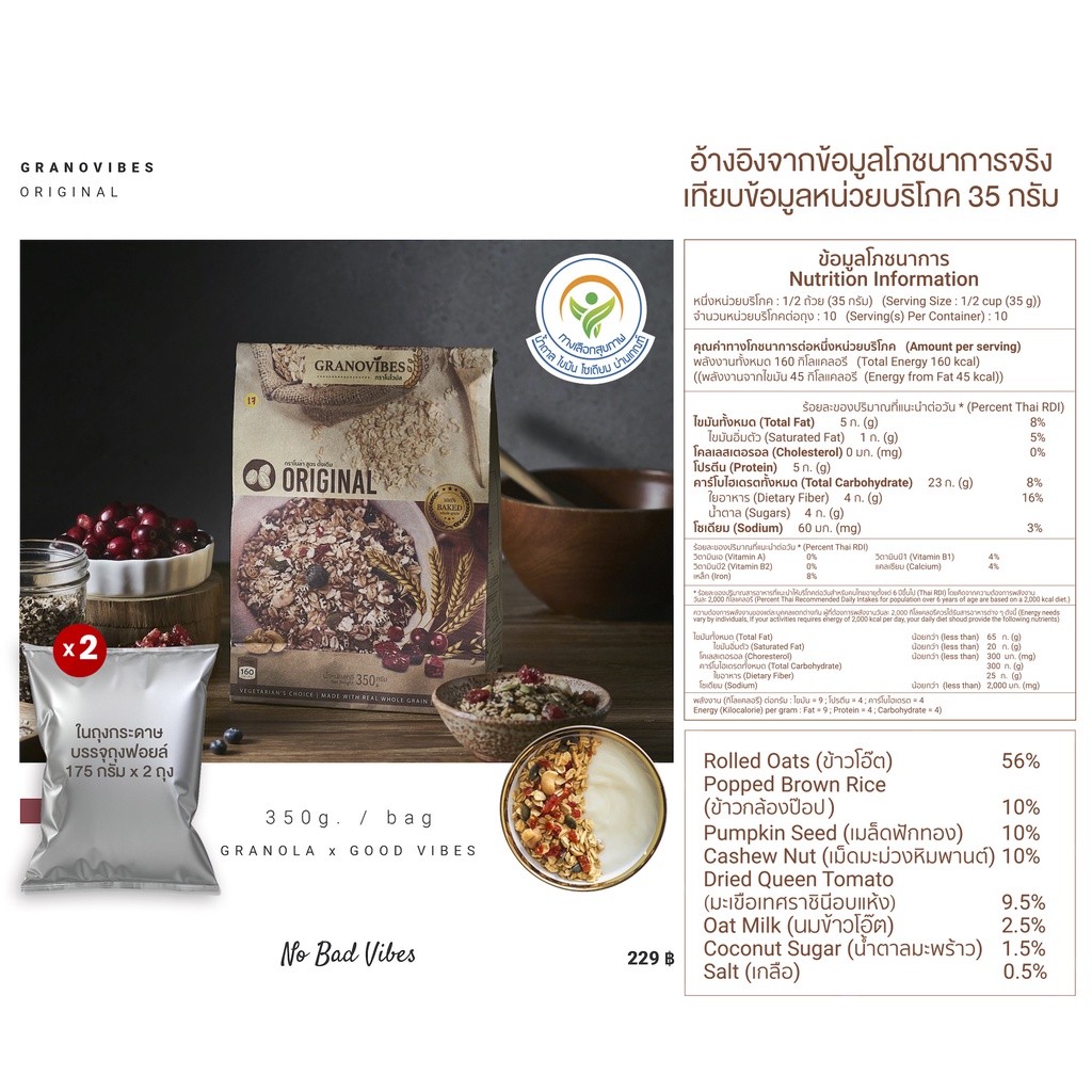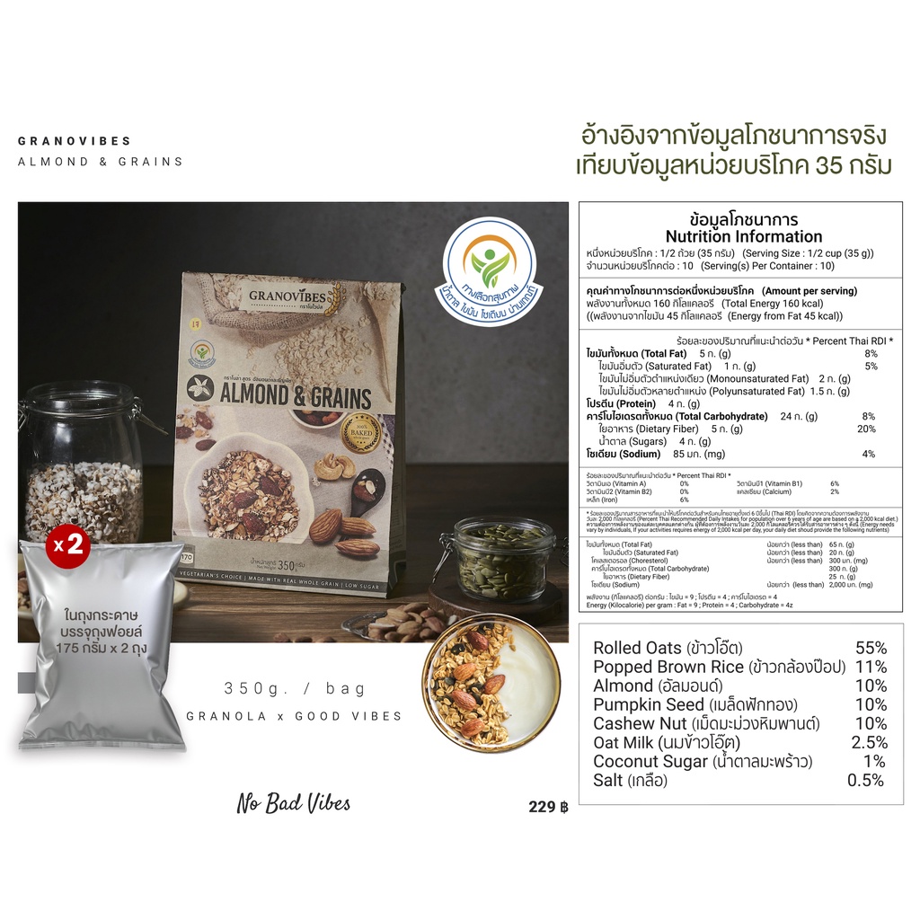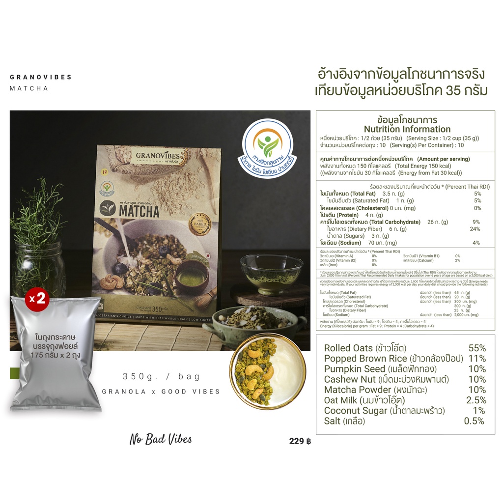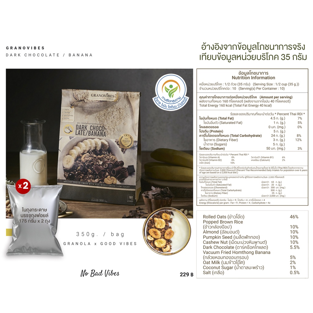 #Granovibes #กราโนไวบ์ส น้ำหนักสุทธิ 350 กรัม 1 ถุงใหญ่ บรรจุ 175g. x 2 ซองฟอยล์ 📌 ข้อมูลสำหรับผู้แพ้อาหาร อาจจะมีส่วนผสมของนม เนื่องจากในบางกรณีสินค้าอาหารบางชนิดก็ไม่ได้ใส่ส่วนผสมที่มีสารก่อภูมิแพ้นั้นๆโดยตรง แต่ใช้พื้นที่จัดเก็บในการผลิตร่วมกันกับอาหารที่มีส่วนผสมของสารก่อภูมิแพ้ เช่น การผ