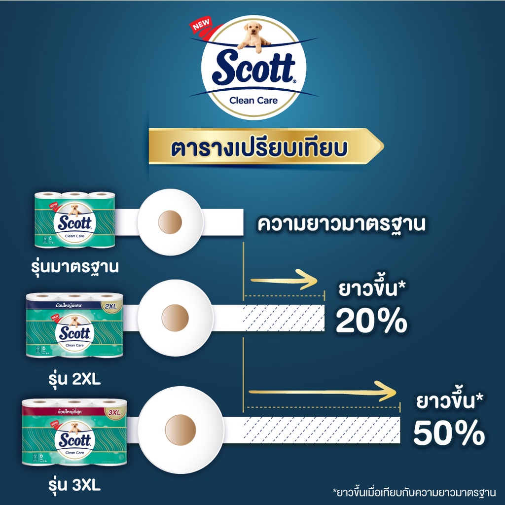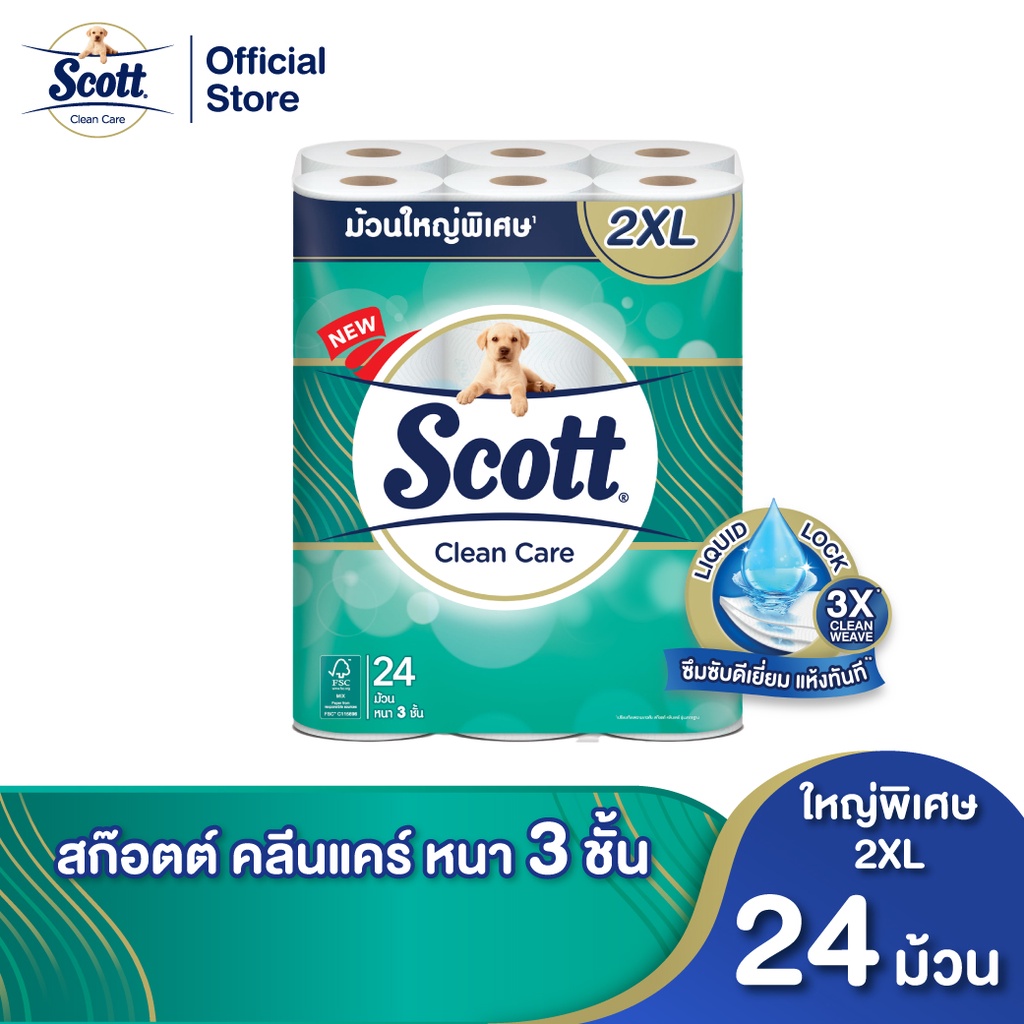 "กระดาษชำระ สก๊อตต์® คลีนแคร์ หนา 3ชั้น สะอาดหมดจด แห้งสบายอย่างเหนือระดับ - ด้วยลิควิดล็อกเทคโนโลยี (LIQUID LOCK TECHNOLOGY) เพิ่มประสิทธิภาพในการซึมซับดียิ่งขึ้น** ช่วยซึมซับและกักเก็บน้ำอย่างรวดเร็ว รู้สึกแห้งสบายทันที ลดความอับชื้นได้อย่างดีเยี่ยม จึงใช้จำนวนแผ่นน้อยลง - ลายกระดาษ 3X คลีนว