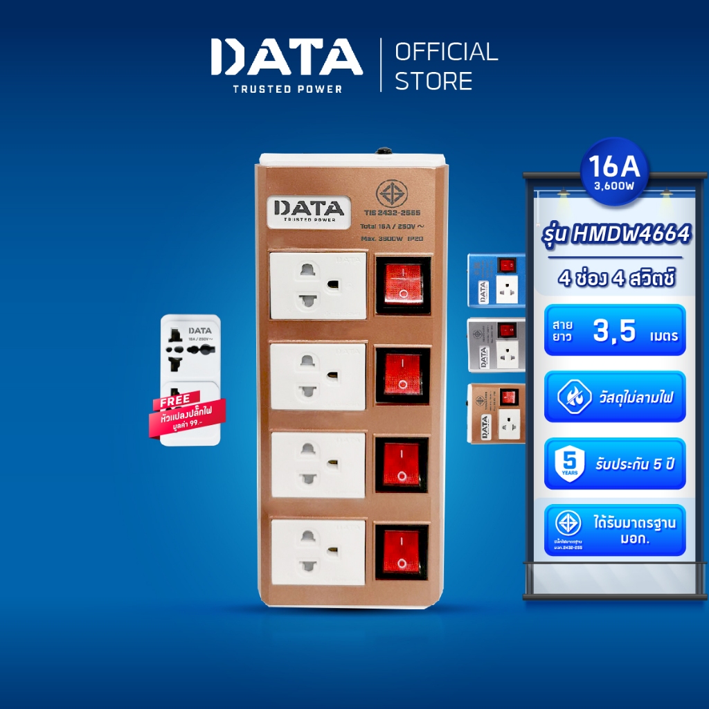 DATA ปลั๊กไฟ ดาต้า 4 ช่อง 4 สวิตช์ สาย 3 5 เมตร รุ่น HMDW4664 มาตรฐาน มอกแท้ กันไฟกระชาก มีรับประกัน