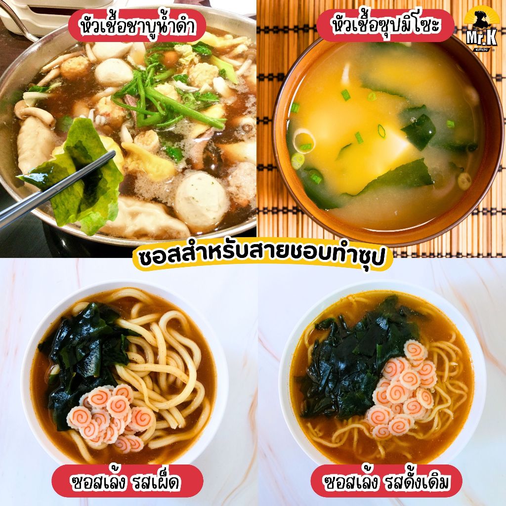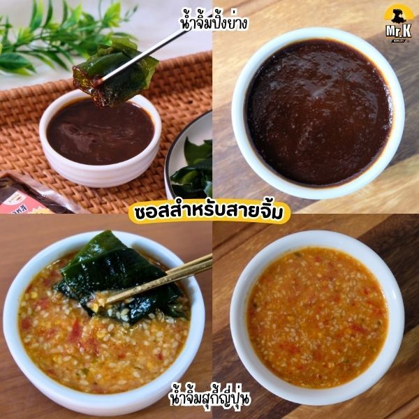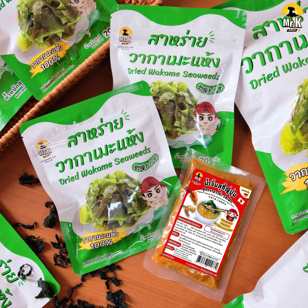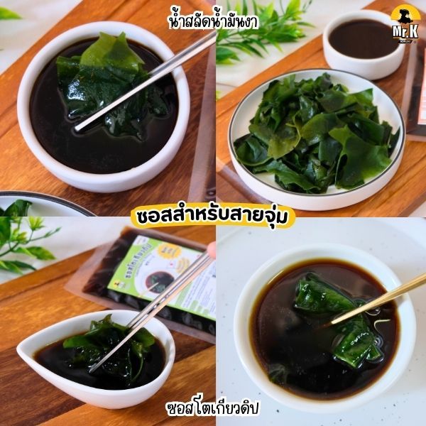 ... ที เพื่อให้สาหร่ายนิ่มและพองตัว เสร็จแล้วนำไปทานคู่กับซอส หรือรังสรรค์เมนูอื่นๆ ได้เลย แถม!! ซอสสุดกลมกล่อม ตามสไตล์มิสเตอร์เค กิมจิ ที่สามารถเลือกทานได้ถึง 6 แบบ 6 รสชาติ หมายเหตุ : ซอสแถมสามารถเลือกได้เพียง 1 รสชาติ ต่อสาหร่าย 1 ห่อ ซอสสำหรับสายจิ้ม 1. น้ำจิ้มสุกี้ญี่ปุ่น สุตรงาขาวคั่ว รสเผ็ด จัดจ้าน หอมกลิ่นงา จะทานคู่กับสาหร่ายวากาเมะ หรือเมนูดองซีอิ๊วเกาหลีก็อร่อยเข้ากัน มีเลขสารบบ อย. ถูกต้อง 30-2-06863-6-0141 2. น้ำจิ้มปิ้งย่างเกาหลี ซอสเนื้อเข้มข้น อร่อยครบรส มีเลขสารบบ อย. ถูกต้อง 30-2-06863-6-0073 ซอสสำหรับสายจุ่ม 1. น้ำสลัดน้ำมันงาซีอิ๊วญี่ปุ่น รสชาติเปรี้ยว หวาน หอมกลิ่นงา มีเลขสารบบ อย. ถูกต้อง 30-2-06863-6-0081 2. ซอสโตเกียวดิป เข้มข้น หวาน เค็ม ครบรสมาก มีเลขสารบบ อย. ถูกต้อง 30-2-06863-6-0083 ซอสสำหรับสายชอบทำซุป ซดทานร้อนๆ ฟินสุดๆ 1. หัวเชื้อซุปมิโซะ กลมกล่อมแบบต้นตำรับญี่ปุ่น มีเลขสารบบ อย. ถูกต้อง 30-2-06863-6-0107 2. หัวเชื้อชาบูน้ำดำ ซุปหอม เข้มข้น หวาน เค็มลงตัวสุดๆ มีเลขสารบบ อย. ถูกต้อง 30-2-06863-6-0142 เลือกซอสที่ชอบ แล้วนำมาทานคู่กับสาหร่ายวากาเมะ หรือเมนูอื่นๆ ได้ตามต้องการ จะซอสไหน ซุปไหนก็อร่อยเข้ากัน วิธีการจัดเก็บ สามารถจัดเก็บได้ในอุณหภูมิห้องปกติ แต่ควรหลีกเลี่ยงความชื้นและแสงแดด