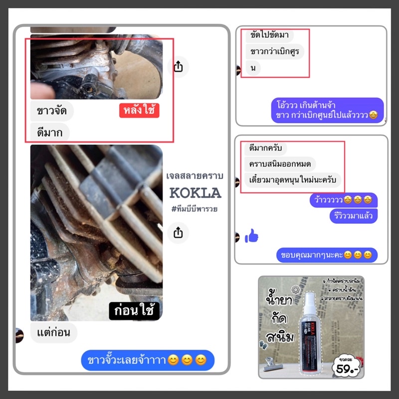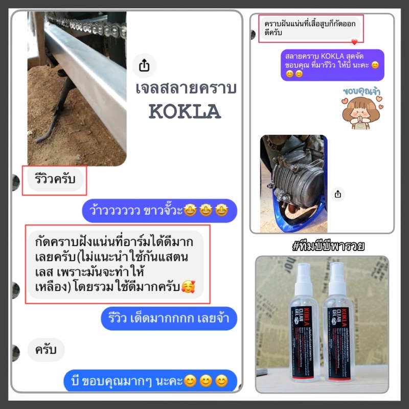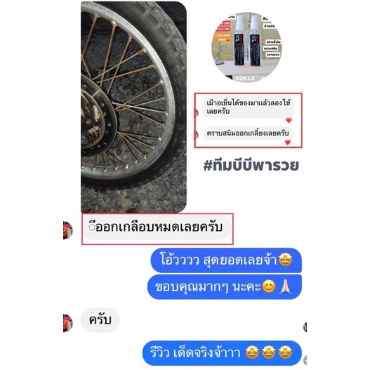 ... ์ล้างจาน หรือ เครื่องมือการเกษตรที่เป็นโลหะทุกชนิด คราบสนิม คราบเหลือง คราบแดง คราบน้ำมัน ล้างทำความสะอาด โครเมียม ลอกสีโล แช่โล ได้ ล้างเครื่อง ล้างโซ่ ล้างท่อ คอท่อ ดุม(เดิม) พักเท้า ซี่ ล้อเดิม(ถ้าล้อโลควรระวังจะทำให้ด่างลอกได้) 💥 ข้อควรระวัง 💥 น้ำยาสลายคราบ KOKLA ❌ห้ามใช้กับ สแตนเลส งานไทเท งานปัดเงา งานชุบสี งานโลใช้ไม่ได้❌ ❗️**จะทำให้ลอก ด่าง**❗️ **สนิมกินเนื้อ กินลึกจะไม่ค่อยออก** 💥ข้อแนะนำ💥 หากต้องการใช้ในปริมาณมากสามารถ ผสมน้ำได้1-2เท่าตัว ตัวน้ำยาจะยังมี ความเข้มข้นและกัดคราบสนิมได้อยู่ *หากโดนพลาสติก และสีรถ ควรใช้น้ำล้างออกทันที* 💢ข้อแนะนำหลังใช้เจลสลายคราบ💢 การใช้น้ำยาสลายคราบ จะทำให้สารเคลือบถูกทำลาย ชิ้นงานบางชนิดไวต่อ สนิมและขี้เกลือ - หลังล้างเสร็จ ควรใช้ผ้าเช็ดให้แห้งทันที - ใช้น้ำยาเคลือบสำหรับป้องกันสนิม , กันขี้เกลือ หรือ น้ำมันที่มีสารล่อลื่น เช่น น้ำมันเครื่อง, โซแน็กซ์, น้ำมันมะกอก, หรืออื่นๆทาเคลือบไว้จ้า😊 *สำคัญ**** หลังน้ำยาสลายคราบ ถ้าหากใช้ไม่หมด แนะนำ ให้ถอดหัวฉีดออกมาล้าง ด้วยน้ำเปล่า ไล่น้ำยาออกให้หมด *เพื่อถนอมหัวฉีด* ถ้าไม่ล้าง หัวฉีดจะพัง เพราะน้ำยาจะกัดสปริงในหัวฉีดพัง *ทำให้ฉีดไม่ออก* ------------------------------------------ 🚚ส่งของทุกวันจ้า📦📦📦 ------------------------------------------ ตัดรอบ เวลา 23.50 น. ถ้าทางร้าน กดดำเนินการแล้ว ไม่สามารถยกเลิกคำสั่งซื้อได้ ทุกกรณี จัดส่ง วันถัดไป จัดส่งสินค้าทุกวัน (บางครั้งอาจมีการเตรียมการจัดส่งภายใน 1-2 วัน) หลังจากทางร้านส่งสินค้าแล้ว ลูกค้าจะได้รับสินค้าภายใน 2-3 วัน ----------------------------------------- ก่อนเปิดกล่องพัสดุ รบกวนลูกค้าถ่ายวิดีโอด้วยนะคะ ถ้าสินค้าไม่ครบแล้ว ไม่มีหลักฐานการยืนยัน จะไม่สามารถเคลมสินค้าได้ค่ะ ไม่มีหลักฐานวีดีโอ = เคลมไม่ได้❌ มีหลักฐานวีดีโอ= เคลมได้✅ ไม่มีวีดีโอตอนเปิดก่อน ❌ไม่รับเคลมทุกกรณี ลูกค้ารักษาสิทธิ์ตัวเอง ด้วยการถ่ายวิดีโอด้วยนะคะ🙏🏻🥰 🚚ส่งของทุกวันจ้า📦📦📦 ------------------------------------------ ตัดรอบ เวลา 23.50 น. ถ้าทางร้าน กดดำเนินการแล้ว ไม่สามารถยกเลิกคำสั่งซื้อได้ ทุกกรณี จัดส่ง วันถัดไป จัดส่งสินค้าทุกวัน (บางครั้งอาจมีการเตรียมการจัดส่งภายใน 1-2 วัน) หลังจากทางร้านส่งสินค้าแล้ว ลูกค้าจะได้รับสินค้าภายใน 2-3 วัน ----------------------------------------- ก่อนเปิดกล่องพัสดุ รบกวนลูกค้าถ่ายวิดีโอด้วยนะคะ ถ้าสินค้าไม่ครบแล้ว ไม่มีหลักฐานการยืนยัน จะไม่สามารถเคลมสินค้าได้ค่ะ ไม่มีหลักฐานวีดีโอ = เคลมไม่ได้❌ มีหลักฐานวีดีโอ= เคลมได้✅ ไม่มีวีดีโอตอนเปิดก่อน ❌ไม่รับเคลมทุกกรณี ลูกค้ารักษาสิทธิ์ตัวเอง ด้วยการถ