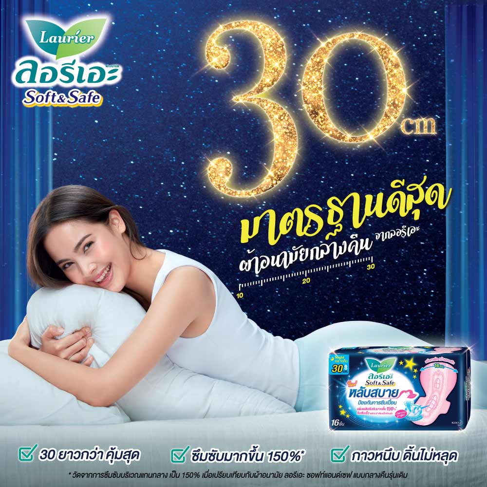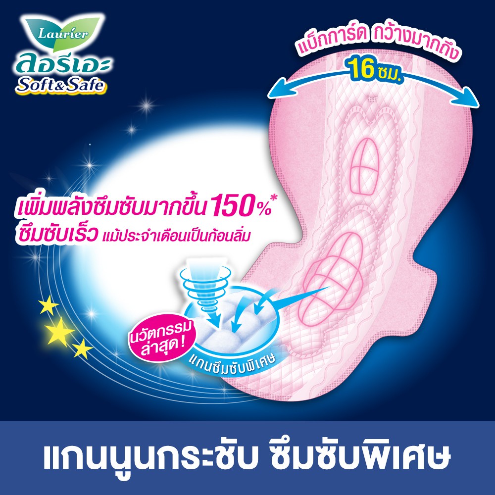 ... ระสิทธิภาพ เพิ่มพลังซึมซับมากขึ้น 150%* - ซึมซับประจำเดือนลงไปใต้แผ่นทันที แห้งสบาย ทิ้งคราบประจำเดือน ตกค้างบนผิวหน้าน้อยลง - พร้อมตารางทั่วแผ่น ช่วยเพิ่มพลังการดูดซับทุกทิศทาง รองรับทุกการเคลื่อนไหว หลับสบายจนถึงเช้า - ซึมซับได้ดี แม้ประจำเดือนเป็นก้อนลิ่ม - ซึมซับต่อเนื่อง และล็อกไว้ภายใน ด้วย วันเดอร์เจล - แกนซึมซับพิเศษ นูนกระชับ แนบสนิทสรีระ ล็อกการไหลของประจำเดือนไปด้านหลัง หมดกังวลเรื่องการซึมเปื้อน *เปรียบเทียบกับ ลอรีเอะ ซอฟท์แอนด์เซฟแบบกลางคืนรุ่นเดิม" "Laurier Soft & Safe Night 30cm for Heavy flow, Night time Comfortably Sleep, Prevent leakage, Superior protection, confident, no worry about leakage. Latest Innovation from Japan, with NEW “Power Square Surface”. Together with backguard wide to 16 cm. and triple lock to prevent back leakage. Power absorption 150%* - Instantly absorption. Comfortably dry & less remain on pad - Together with power square surface which increase absorption power - Absorb even blood clot - Instantly absorb and lock away wetness with Wonder Gel. No back flow. - Special Block Core, Fit to body and no back flow. Worry free on no leakage *Compare to previous Laurier Soft & Safe night เก็บรักษาได้ 3 ปีนับจากวันที่ผลิต"