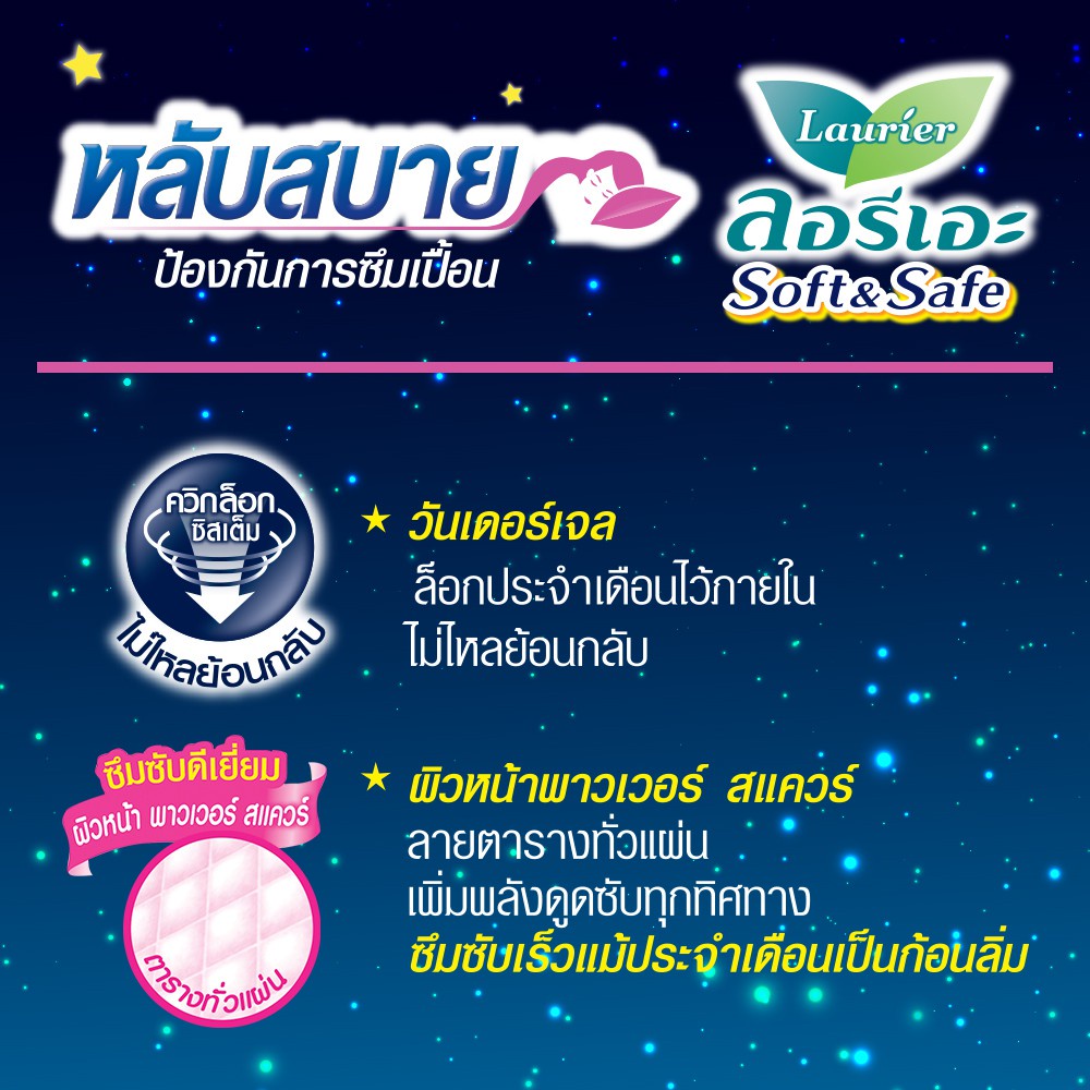"ลอรีเอะหลับสบาย มาหนักแค่ไหนก็หลับสบาย ผ้าอนามัยลอรีเอะ ซอฟท์แอนด์เซฟ ยาวถึง 30ซม. เหมาะสำหรับคืนมามาก หลับสบาย ป้องกันการซึมเปื้อน ปกป้องเหนือกว่า มั่นใจ ไม่กลัวเลอะ ด้วยนวัตกรรมล่าสุดจากญี่ปุ่น "ผิวหน้าพาวเวอร์สแควร์" พร้อมแบ็กการ์ดกว้าง 16 ซม. และแนวล็อก 3 ชั้น หยุดการซึมเปื้อนด้านหลังอย่างมีป
