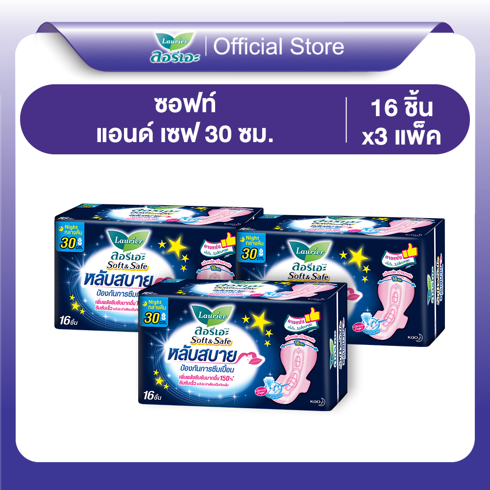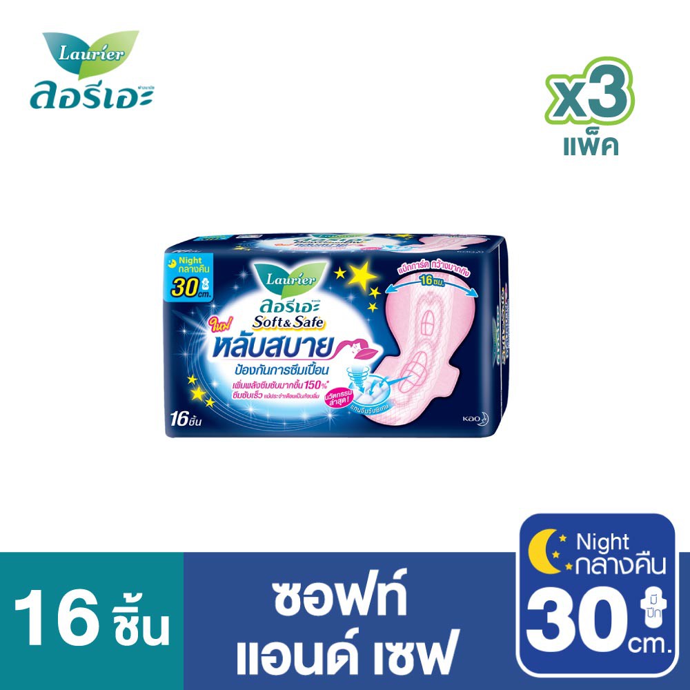 [แพ็ค3] ลอรีเอะ ซอฟท์แอนด์เซฟกลางคืน30ซม.16ชิ้น Laurier Soft&Safe ผ้าอนามัย,ยกแพ็ค,ซึมซับดี,สำหรับกลางคืน