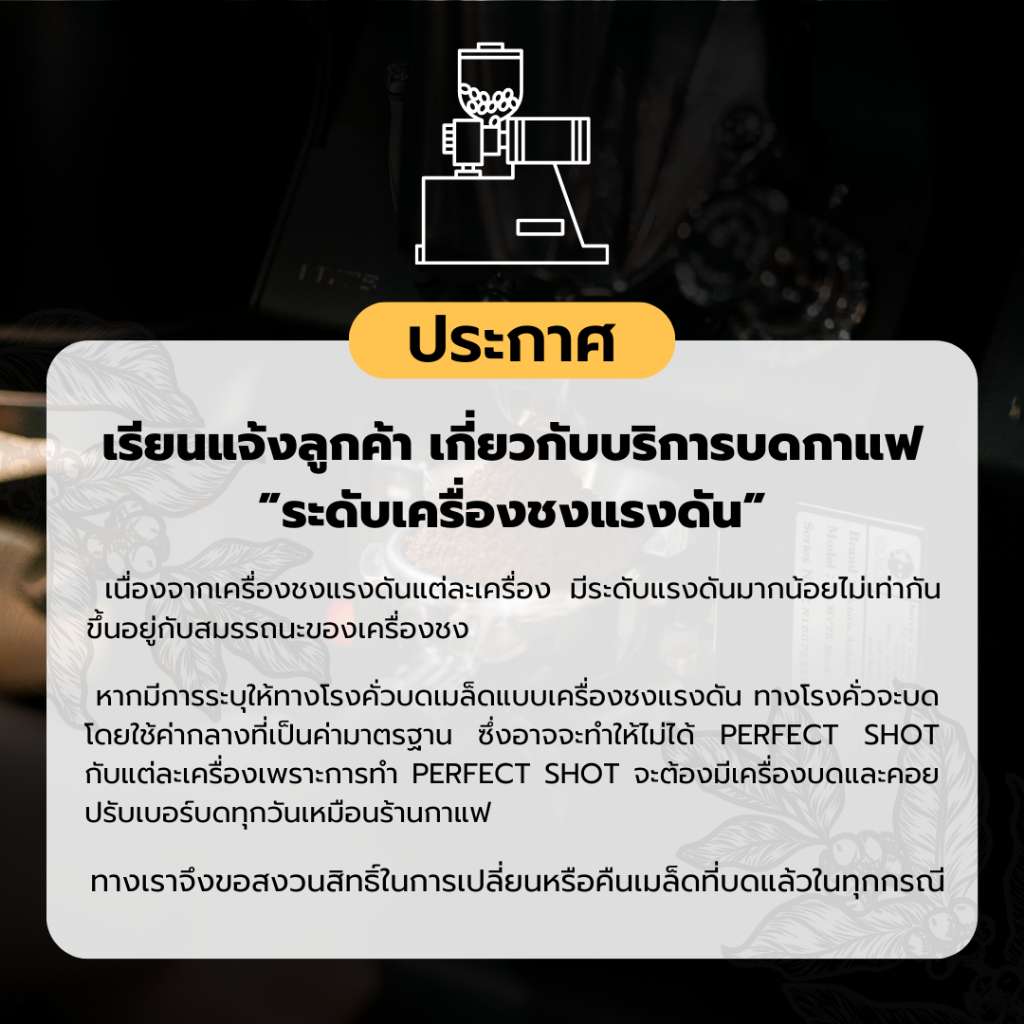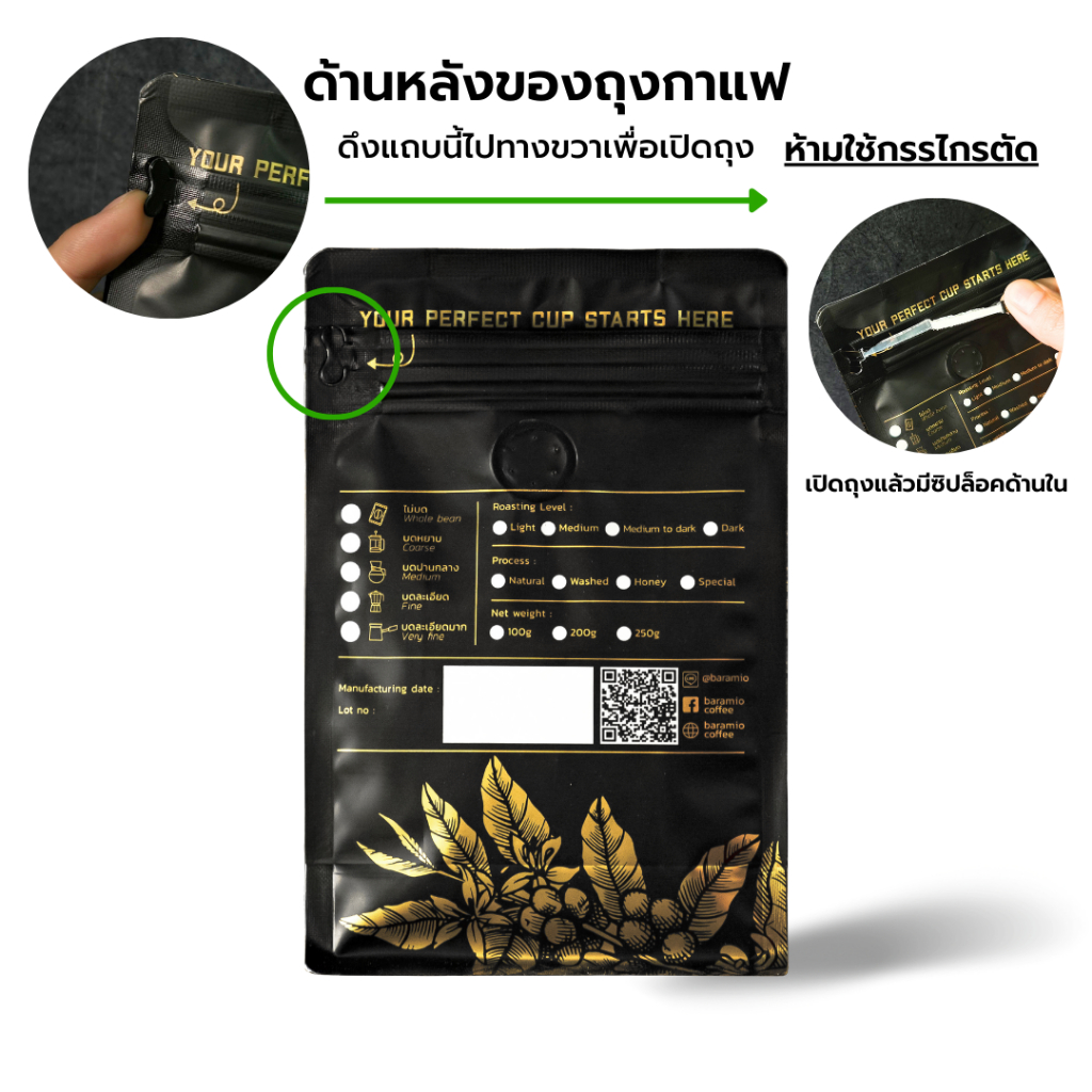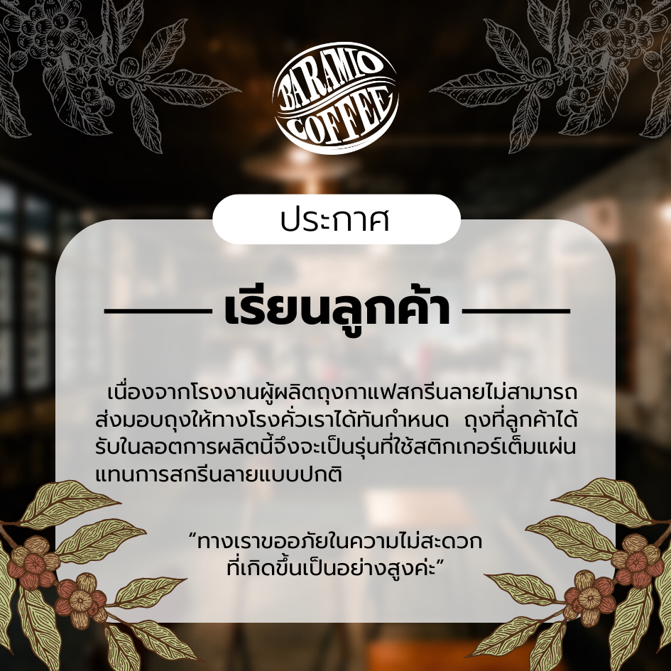 ... แฟใช้เวลาสุกยาวนานกว่าไร่ทั่วไปถึงสองเดือนทำให้กาแฟได้ดูดซึมสารอาหารแร่ธาตุในดินได้มากกว่าปกติ จากนั้นนำมาโพรเซสแบบ Anaerobic Fermentation หรือกระบวนการหมักแบบไม่ใช้ออกซิเจน และตากกาแฟเพื่อให้เมล็ดหวานฉ่ำเต็มที่อย่างช้าๆ หลายรอบ เพื่อให้กาแฟรุ่นนี้ มีบอดี้กาแฟแน่น หอมหวานโทนบลูเบอร์รี่ เรซิ่น และ แฝงรสหมักบ่มของวิสกี้ที่หอมหวาน ทิ้งรสยาวนานหลังการดื่ม ระดับคั่ว : คั่วอ่อนค่อนกลาง (Light to medium Roast) Taste note: Blueberry,Raisin ,Hint of Whiskey,Silky texture & long sweet aftertaste ราคา 269 บาท / 200 กรัม ราคา 575 บาท / 500 กรัม นโยบายการเปลี่ยน/คืนสินค้า 1. ไม่รับเปลี่ยนคืนสินค้าประเภทเมล็ดกาแฟที่บดแล้วทุกกรณี ยกเว้นทางร้านจัดส่งไปให้ผิดประเภทสินค้าเท่านั้น 2. ทางบริษัทรับเปลี่ยน/คืนสินค้า ภายใน 5 วันทำการ ทั้งนี้นับตั้งแต่วันที่ลูกค้าเซ็นต์รับสินค้านั้นแล้วหากเกินจากวันเวลาดังกล่าวแล้ว บริษัทฯ ขอสงวนสิทธิ์ในการไม่รับเปลี่ยน/คืนสินค้า 3.หากไม่มีวีดีโอประกอบการเคลมสินค้า ทางร้านขอสงวนสิทธิ์ไม่เคลมสินค้าในทุกกรณี