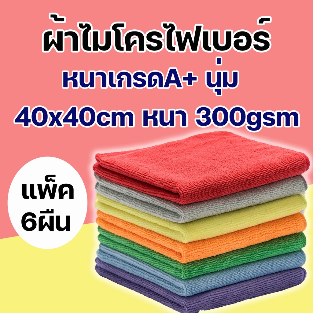 ผ้าไมโครไฟเบอร์ ผ้าเช็ดรถ (แพ็ค 6ผืน) ขนาด 40X40 ซม. หนา 300g , บาง 260g เนื้อผ้าเกรดA+ผ้าซึมซับน้ำได้ดีเยี่ยม