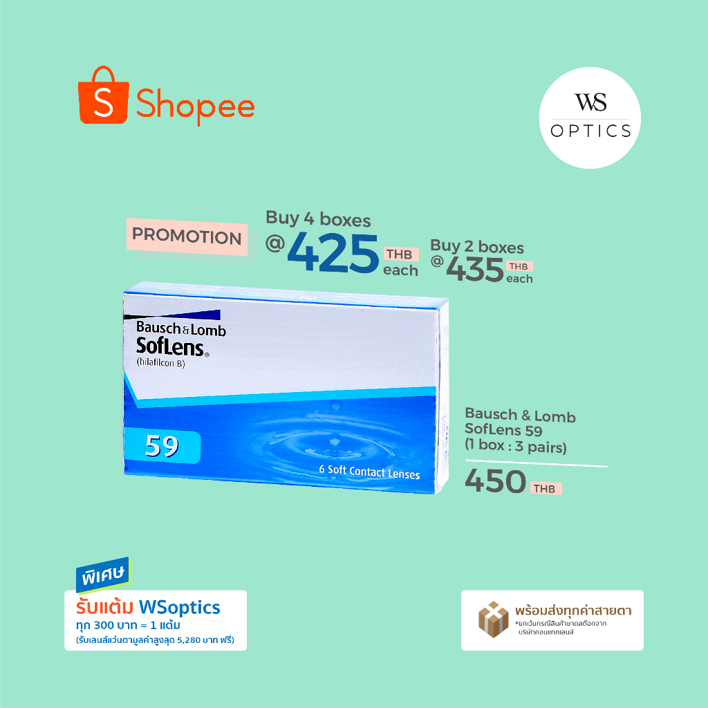 Bausch & Lomb : SofLens 59 คอนแทคเลนส์รายเดือน (1 Box : 3 Pairs) 1 กล่อง ราคากล่องละ 450 บาท 2 กล่อง ราคากล่องละ 435 บาท 4 กล่อง ราคากล่องละ 425 บาท แถมฟรี รายวัน 1 คู่ ***กรุณาแจ้งค่าสายตาในแชท*** ***Please inform prescription data (degree / power) in chat*** ค่าสายตา -1.00 ถึง -6.00 (เ