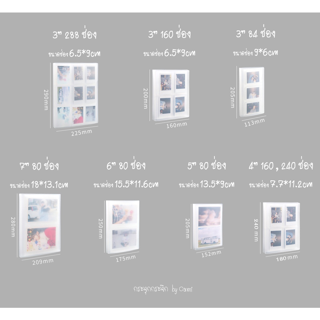 ... ูป อัลบั้มรูป โพลาลอยด์ ปกสีขาวขุ่นมินิมอล เหมาะสำหรับการตกแต่งเพิ่มเติม ด้านในเป็นซองใส ภายใน 1ซอง ช่องใส่รูปจะมี 2 ช่องค่ะ - ขนาด 6*6 cm แบบ 1 กริด ใส่ได้ 40 รูป ขนาดช่อง 6.8*6.8 cm - ขนาด 10*10 cm แบบ 1 กริด ใส่ได้ 48 รูป ขนาดช่อง 10.7*10.7 cm ขนาด 2*3 นิ้ว - แบบ 1 กริด ใส่ได้ 48 รูป ขนาดช่อง 6.7*9.4 cm - แบบ 2 กริด ใส่ได้ 56 รูป ขนาดช่อง 9.3*6.5 cm - แบบ 3 กริด ใส่ได้ 84 รูป ขนาดช่อง 9*6 cm - แบบ 4 กริด ใส่ได้ 160 รูป ขนาดช่อง 6.5*9 cm - แบบ 4 กริด ใส่ได้ 160 รูป (ซองบาง รุ่นนี้ราคาประหยัด ซองบางกว่ารุ่นปกติ) ขนาดช่อง 6.5*9 cm - แบบ 9 กริด ใส่ได้ 288 รูป ขนาดช่อง 6.5*9 cm - แบบ 9 กริด ใส่ได้ 432 รูป ขนาดช่อง 6.5*9 cm - แบบ 9 กริด ใส่ได้ 720 รูป ขนาดช่อง 6.5*9 cm - แบบ 9 กริด ใส่ได้ 900 รูป ขนาดช่อง 6.5*9 cm ขนาด 3*4 นิ้ว - แบบ 1 กริด ใส่ได้ 48 รูป ขนาดช่อง 8*11.3 cm - แบบ 4 กริด ใส่ได้ 160 รูป ขนาดช่อง 7.7*11.2 cm - แบบ 4 กริด ใส่ได้ 240 รูป ขนาดช่อง 7.7*11.2 cm ขนาด 3*5 นิ้ว - แบบ 1 กริด ใส่ได้ 48 รูป ขนาดช่อง 9.3*13.3 cm - แบบ 2 กริด ใส่ได้ 80 รูป ขนาดช่อง 13.5*9 cm - แบบ 2 กริด ใส่ได้ 160 รูป ขนาดช่อง 12.9*9.3 cm ขนาด 4*6 นิ้ว - แบบ 1 กริด ใส่ได้ 48 รูป ขนาดช่อง 10.5*15.5 cm - แบบ 2 กริด ใส่ได้ 80 รูป ขนาดช่อง 15.5*11.6 cm - แบบ 2 กริด ใส่ได้ 160 รูป ขนาดช่อง 15.5*11.6 cm ขนาด 5*7 นิ้ว - แบบ 1 กริด ใส่ได้ 48 รูป ขนาดช่อง 13.3*18.2 cm - แบบ 2 กริด ใส่ได้ 80 รูป ขนาดช่อง 18*13.1 cm - แบบ 2 กริด ใส่ได้ 160 รูป ขนาดช่อง 18*13.1 cm ขนาด 6*8 นิ้ว - แบบ 1 กริด ใส่ได้ 48 รูป ขนาดช่อง 16*21 cm แบบใส่ตั๋ว มีสายรัด มี 2 ขนาดในเล่มเดียว - 3 กริด ใส่ได้ 120 รูป ขนาดช่อง 7*9.4 cm , 1 กริด ใส่ได้ 40 รูป ขนาด 9.8*21.6 cm - 1 กริด ใส่ได้ 80 รูป ขนาด 9.8*21.6 cm แบบปกมีกระดุม 1. ขนาด 3 นิ้ว (2*3นิ้ว) ใส่ได้ 84 รูป ขนาดช่อง 6.4*9.3 cm 2. ขนาด 3 นิ้ว (2*3นิ้ว) ใส่ได้ 120 รูป ขนาดช่อง 6.4*9.3 cm 3. ขนาด 3 นิ้ว (2*3นิ้ว) ใส่ได้ 240 รูป ขนาดช่อง 6.4*9.3 cm 4. ขนาด 3 นิ้ว (2*3นิ้ว) ใส่ได้ 160 รูป ขนาดช่อง 6.7*9.3 cm 5. ขนาด 5 นิ้ว (3*5นิ้ว) ใส่ได้ 80 รูป ขนาดช่อง 9.2*13.7 cm (ขนาดโดยประมาณ บวกลบไม่เกิน 3-5 mm) 🙏🙏🙏🙏🙏