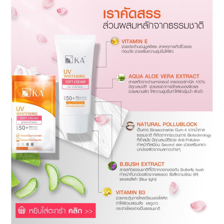 ... 0) 📦 ค่าส่งจะคิดตามน้ำหนักของสินค้าต่อคำสั่งซื้อ (เทียบกับเรทค่าส่งแต่ละขนส่ง) 💬 รายละเอียดสินค้า 💬 กันแดดบางเบา.... เบาสุดที่เคยมีมา ครีมกันแดดเนื้อซอฟท์ครีมสำหรับผิวหน้า สัมผัสเบา ไม่มัน สบายผิว แม้แดดแรง-แรงมากก็พร้อมปกป้องทุกอณูผิวจากแสงแดด บางเบา ... เอาอยู่ ปกป้องผิวจากแสงแดด • ปกป้องผิวหน้าไม่ให้แก่ก่อนวัยด้วย Pollution filter ป้องกันริ้วรอย • ป้องกันผิวหมอง และริ้วรอยก่อนวัยจาก IR/ Blue Light ปกป้องผิวจากการถูกทำร้าย • ปกป้องผิวถูกทำร้ายลึกถึงชั้น DNA ผิวคล้ำเสีย กร้านสะสม จากรังสี UVA1/UVA2/UVB วิธีใช้ ทาให้ทั่วหน้าและลำคอ เป็นขั้นตอนสุดท้ายก่อนการแต่งหน้าและก่อนสัมผัสแสงแดด KA UV WHITENING SOFT CREAM SPF 50+ PA++++ • มี AQUA ALOE VERA EXTRACT ช่วยปลอบประโลมผิวจากการทำร้าย จากแสงแดดและฝุ่นควัน ให้กลับมาชุ่มชื่น น่าสัมผัสผิวดูอ่อนวัยช่วยบำรุงผิว • เติมอาหารผิวต้านความแก่ด้วยวิตามินอี พร้อมปรับผิววิ้งมีออร่าด้วย วิตามินบี 3 เนื้อเบา สบายผิว • สูตรสำหรับทุกสภาพผิว • ไม่เหนอะ ไม่มัน ไม่อุดตัน ขนาด 15 g. 1 ชิ้น เลขที่ใบรับแจ้ง : 10-1-6200002835