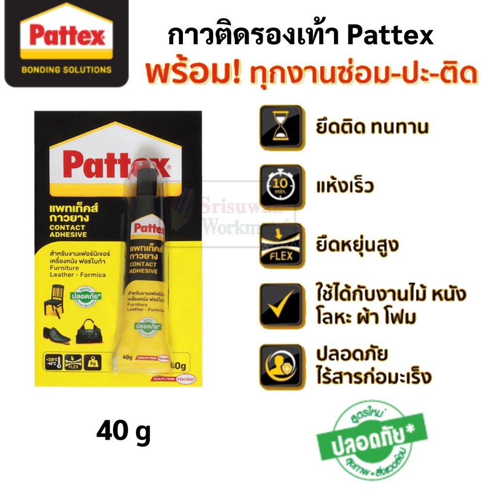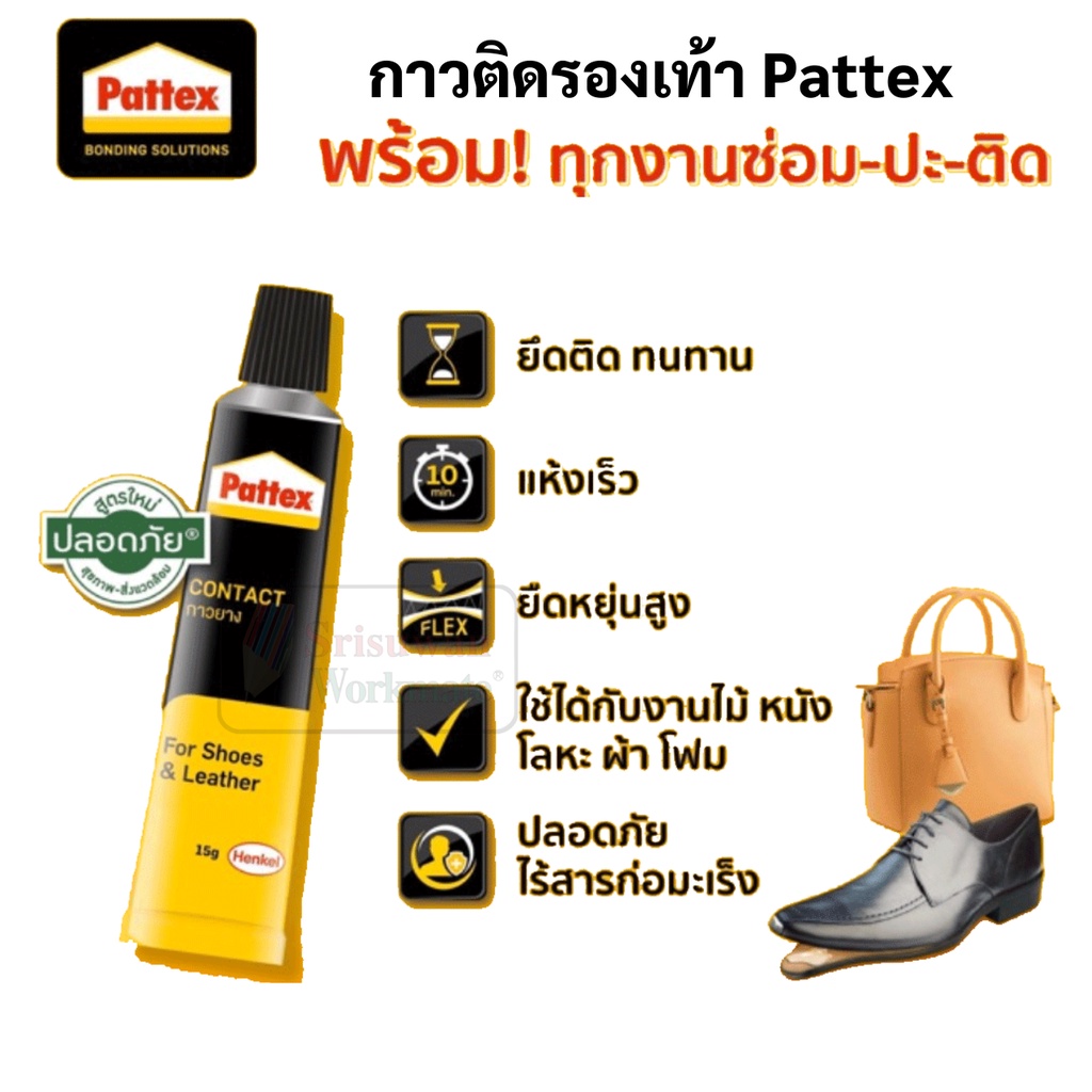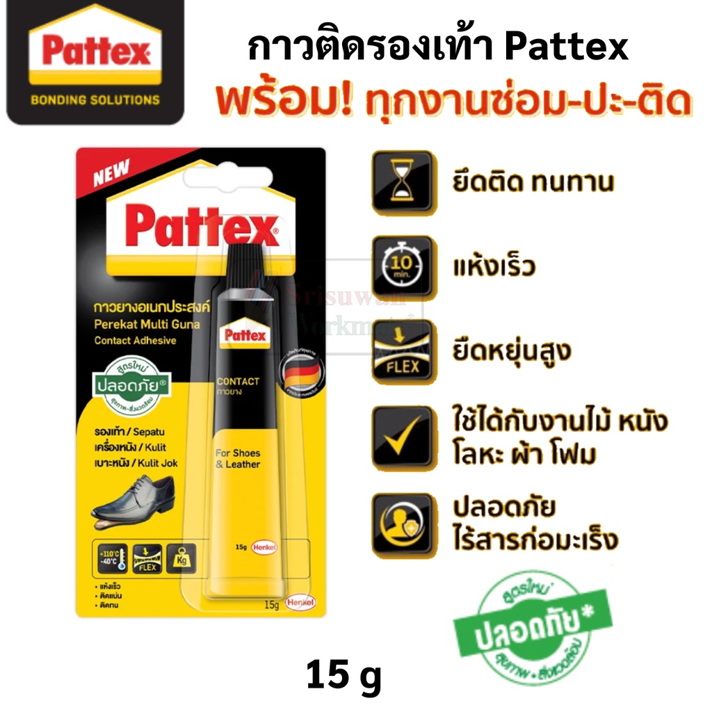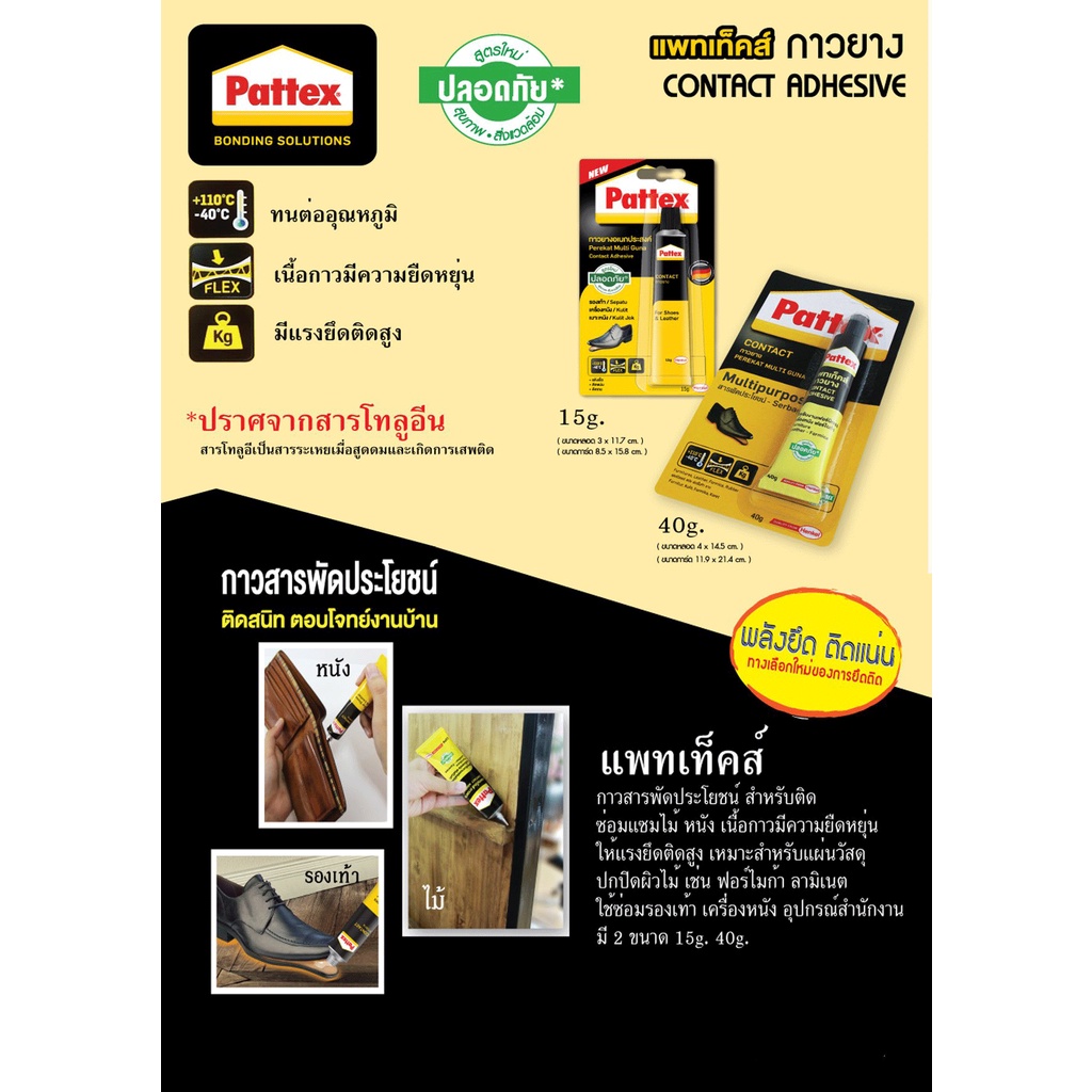 ... าใหญ่จึงสามารถให้ราคาพิเศษได้ ☎หากลูกค้าต้องการสอบถามรายละเอียดสินค้าเพิ่มเติมสามารถทักแชทมาได้เลยค่ะ กาวติดรองเท้า Pattex - มี 2 ขนาด : 15 กรัม / 40 กรัม - ให้แรงยึดติดสูง - สามารถใช้งานได้กับ พื้นรองเท้า แผ่นไม้อัด ผ้า ยาง เครื่องหนัง - ไม่มีสารโทลูอีน ซึ่งเป็นสารที่อาจก่อให้เกิดการเสพติดเเละเป็นอันตรายต่อระบบทางเกินหายใจและระบบประสาท ปลอดภัย - ทนทานต่ออุณหภูมิสูง วิธีใช้ : 1). ทำความสะอาดพื้นผิววัสดุให้สะอาดปราศจากฝุ่นและคราบน้ำมัน 2). ทากาวลงบนวัสดุทั้งสองด้าน ทิ้งไว้ให้พอแห้งประมาณ 5-15 นาที หรือแตะแล้วรู้สึกว่ากาวเกือบแห้ง 3). ประกบวัสดุทั้งสอง ออกแรงกดให้แน่น 4). ไล่ฟองอากาศโดยรีดจากส่วนกลางของวัสดุ 5). เช็ดกาวที่ล้นออกมาด้วยทินเนอร์ หรือน้ำมัน 6). เพื่อการยึดติดที่ดีควรปล่อยกาวให้แห้งตัวเต็มที่ 12-24 ชั่วโมง #กาวยาง #กาวยางทารองเท้า #กาวยางซ่อมรองเท้า #กาวติดไม้อัด #กาวติดพื้นรองเท้า #กาวติดเครื่องหนัง #กาวยาง #กาวซ่อมพื้นรองเท้า #กาวติดทน #กาวติดรองเท้า #pattex #แพทเท็กซ์