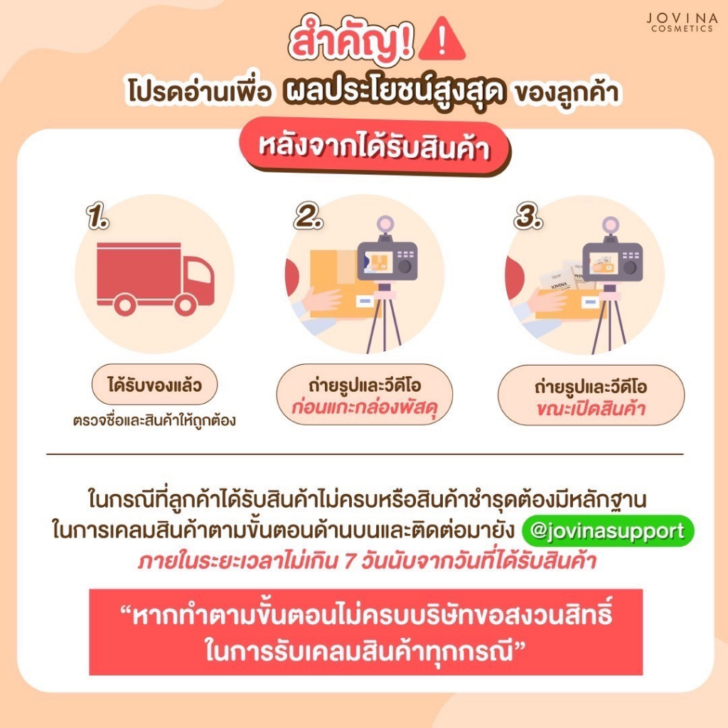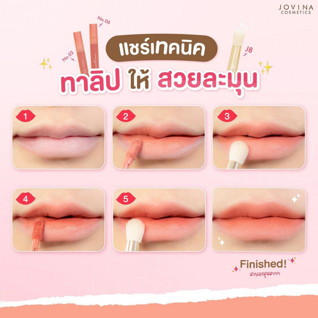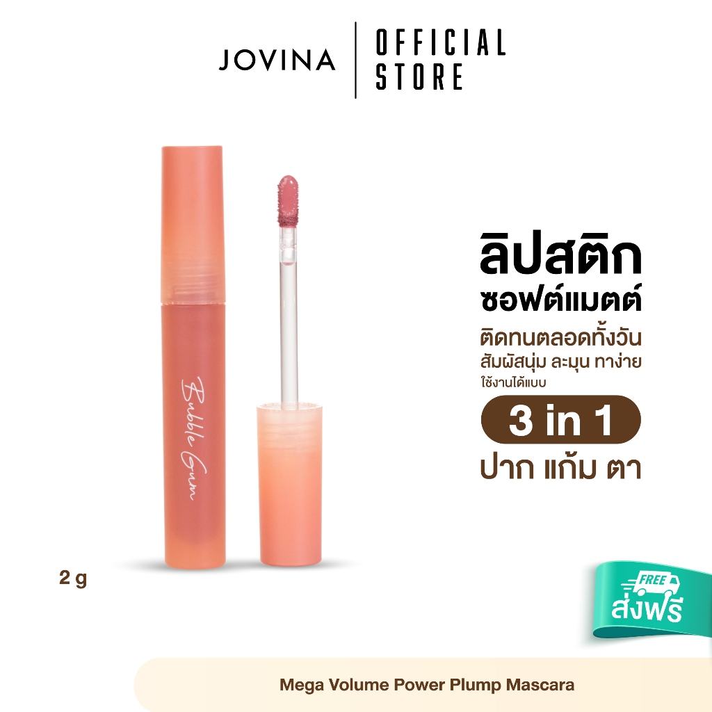 ... ่งเรื่องเม็ดสีที่แน่นชัด ปาดครั้งเดียวก็เอาอยู่ แถมสีสวยทุกเฉด เข้ากับทุกผิวสีของคนไทย มาพร้อมกับสารบำรุง 2 ชนิด Wild Mango Butter และ Coconut Oil ที่ช่วยบำรุงริมฝีปากให้ชุ่มชื้นไม่แห้งแตก และช่วยให้เนื้อลิปมีความนุ่มลื่นสบายปากมากขึ้น ครีเอตลุคได้สนุก สวยไม่ซ้ำวัน กับ 𝗝𝗼𝘃𝗶𝗻𝗮 𝗟𝗼𝘃𝗲 𝗟𝗶𝗽𝘀𝘁𝗶𝗰𝗸 7 สี 7 แท่ง 💄 จะสายหวาน สายฝอ สายแซ่บ หรือลูกคุณหนู ทาออกมาได้สวยทุกลุค All in one ในแท่งเดียว ใช้เป็นลิป ครีมบลัช หรือ อายแชโดว์ก็ได้ งานปากสุดปัง❗️สีสวยชัด แค่ปาดเดียวก็กลบสีปากเดิมมิด 💕 ใครตามหาลิปติดทน เนื้อนุ่ม สบายปาก ฟีลทาเหมือนไม่ได้ทา ❤️ ปกติแท่งละ 350.- ✅️ ลดเหลือ 𝟐𝟗𝟎.- เท่านั้น! ลิปสติกโจวีน่า มีถึง 𝟳 เฉดสี 🍪 𝗡𝗼.𝟬𝟭 𝗖𝗼𝗼𝗸𝗶𝗲𝘀 สีนู้ดอมชมพู 🧁 𝗡𝗼.𝟬𝟮 𝗠𝗼𝘂𝗹𝗶𝗻 𝗥𝗼𝘂𝗴𝗲 สีนู้ดพีช 🍰 𝗡𝗼.𝟬𝟯 𝗦𝘁𝗿𝗮𝘄𝗯𝗲𝗿𝗿𝘆 𝗖𝗵𝗲𝗲𝘀𝗲𝗰𝗮𝗸𝗲 สีชมพูโอลด์โรส 🥕 𝗡𝗼.𝟬𝟰 𝗖𝗮𝗿𝗿𝗼𝘁 𝗖𝗮𝗸𝗲 สีส้มพีช 🍬 𝗡𝗼.𝟬𝟱 𝗕𝘂𝗯𝗯𝗹𝗲 𝗚𝘂𝗺 สีชมพูตุ่น 🧇 𝗡𝗼.𝟬𝟲 𝗖𝗿𝗼𝗳𝗳𝗹𝗲 สีส้มตุ่น 🧀 𝗡𝗼.𝟬𝟳 𝗕𝘂𝘁𝘁𝗲𝗿𝘀𝗰𝗼𝘁𝗰𝗵 สีส้มอิฐ คุณสมบัติ ✅ ลิปสติกจิ้มจุ่มเนื้อชอฟต์แมตต์ที่มอบสัมผัสนุ่ม ละมุน ทาง่าย เบาสบายปากมากขึ้นกว่าเดิม ✅ เนื้อลิปสติกเกลี่ยง่ายยิ่งขึ้นด้วยส่วนผสมของสารบำรุงจาก Coconut Oil ที่ช่วยให้เนื้อลิปสติกมีความนุ่มลื่นสบายปากมากขึ้น ✅ เนื้อลิปสติกนุ่มละมุนเหมือนไอซิ่ง ช่วยเติมร่องปากให้ดูอวบอิ่ม เรียบเนียน ไม่ทำให้ปากแตกแห้งหรือเป็นขุย ✅ ติดทนยาวนานทั้งวันไม่มีหลุด หมดปัญหาเติมลิประหว่างวัน ✅ เม็ดสีแน่น สีชัด ทาเพียงรอบเดียวก็สามารถกลบสีปากเดิมได้สนิท ✅ คนแพ้ลิปสติกง่ายสามารถใช้ได้ เพราะมีส่วนผสมของสารบำรุงที่มาจากธรรมชาติ ช่วยให้ริมฝีปากนุ่ม ไม่แห้งแตก และไม่เป็นขุย ✅ มาพร้อมกับแอปพลิเคเตอร์รูปทรงเรียวแหลมที่เข้ากับรูปปากได้พอดี ทำให้ทาลิปง่าย แถมยังช่วยกระจายเนื้อลิปสติกได้อย่างพอเหมาะ ✅ โทนนู้ดสุดฮิต! มีให้เลือกถึง 7 เฉดสี คัดมาให้แล้ว เป็นโทนสีที่ทุกสีผิวสามารถทาได้ ! ✅ ทาแล้วไม่ติดแมสก์ ไม่ติดหลอด และไม่ติดขอบแก้ว ✅ All in one ในแท่งเดียว ใช้เป็นลิป ครีมบลัช หรือ อายแชโดว์ก็ได้ ✅ ทาสีเดียวก็สวย หรือผสมกับสีอื่นทำเป็น ombre ก็เริ่ด ครีเอทสีลิปเข้าได้กับทุกลุค