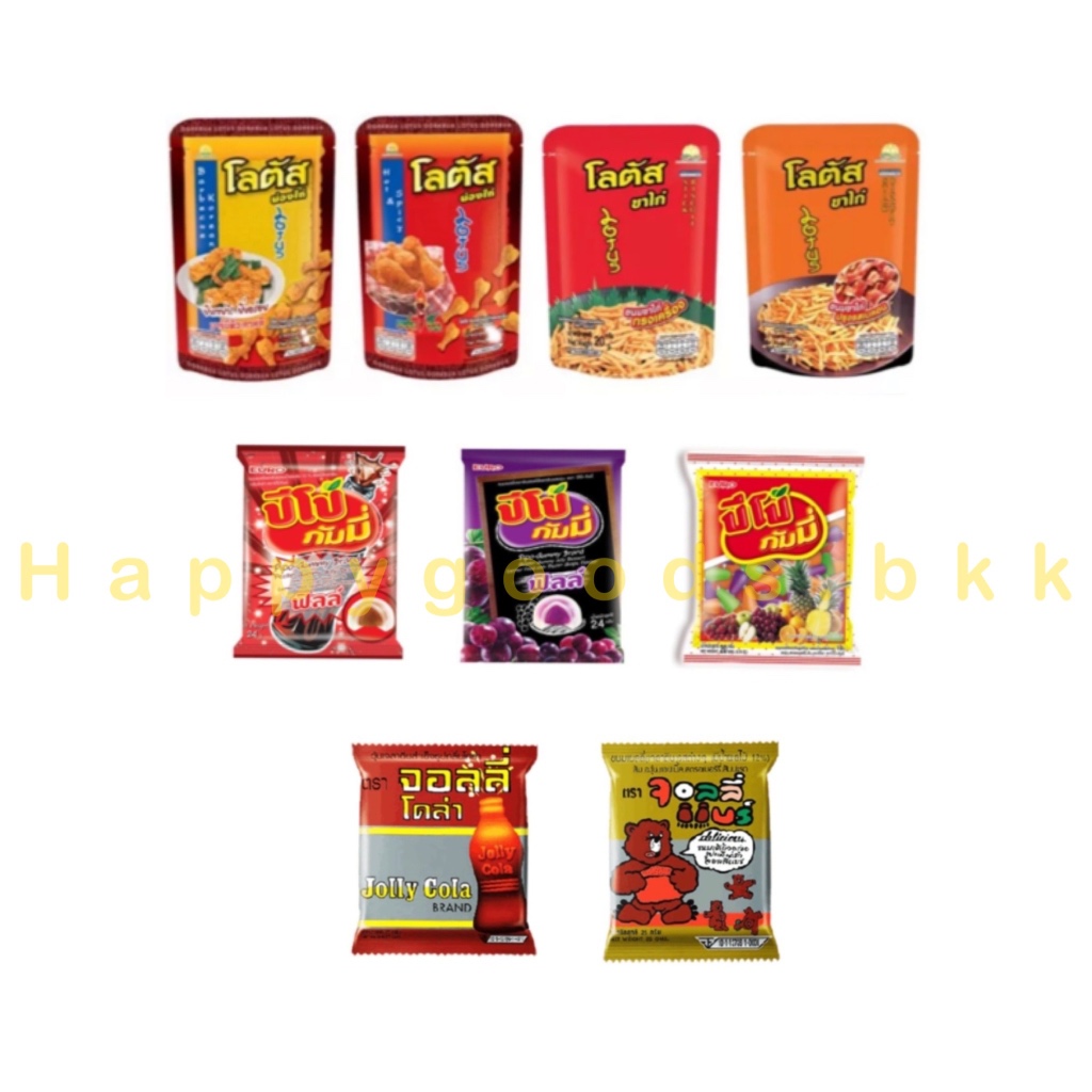 ขนมขาไก่ น่องไก่ ปีโป้กัมมี่ jolly ขนมทานเล่น เคี้ยวเพลิน อร่อยได้ทุกที่ ซองเล็ก 5 บาท - ขาไก่-น่องไก่ โลตัส มี 4 รสชาติ ขาไก่ทรงเครื่องและเบคอน ขนาด15-20 กรัม น่องไก่ทรงเครื่องและแซ่บซี้ด ขนาด18กรัม - เยลลี่ปีโป้ มี 3 ราชาติ โคล่า องุ่น และผลไม้รวม ขนาด 20-24 กรัม - jolly มี 2 รสขาติ jollybea