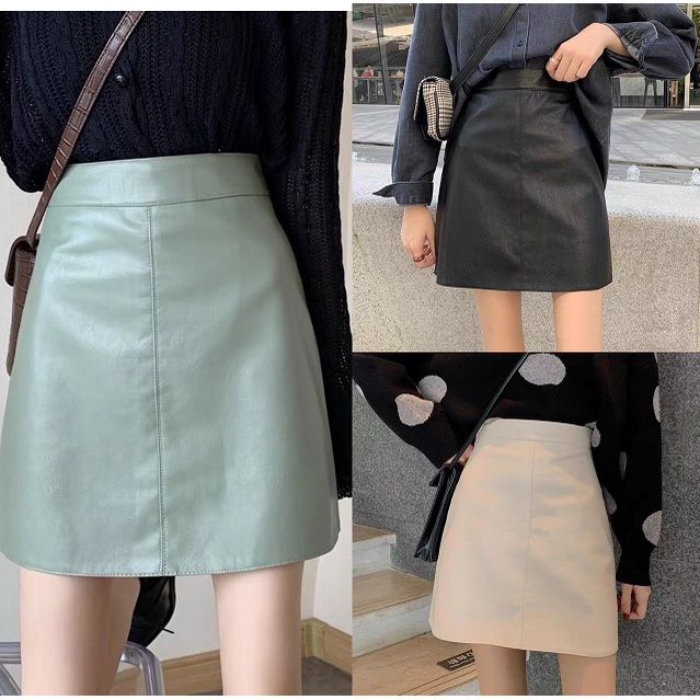 ✨ กระโปรงหนัง PU ฤดูใบไม้ผลิและฤดูใบไม้ร่วง แฟชั่นใหม่ 👗 กระโปรงหนังสั้นสั้นเอวสูง ทรงเอบาง all-match