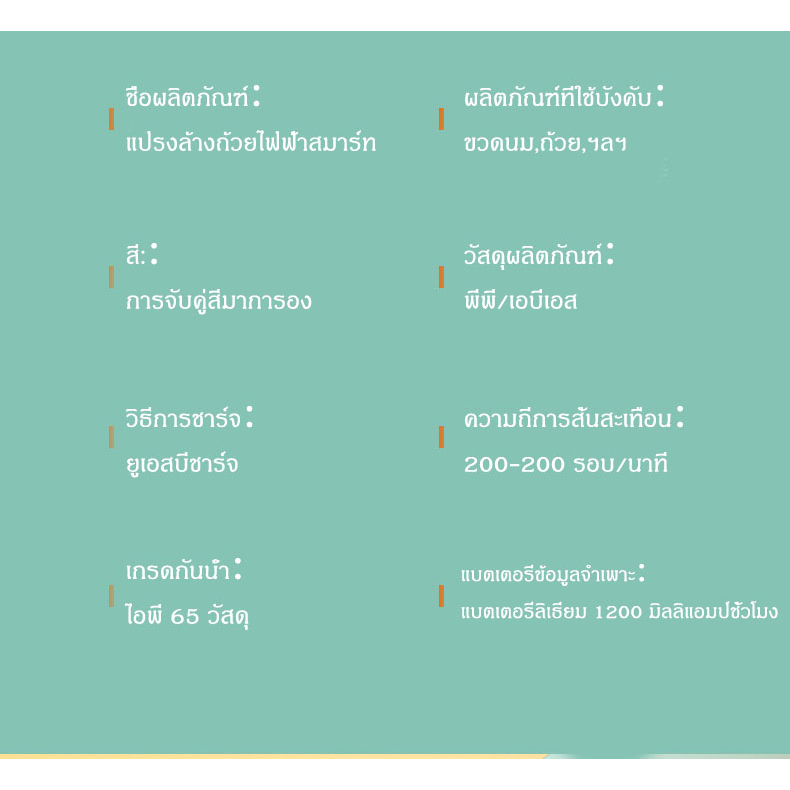 ... ควรสะบัดน้ำออกให้มากที่สุด ● คำเตือน: ห้ามใช้แอลกอฮอล์, ฝอยขัดทุกชนิด, น้ำยาทำความสะอาดหรือของเหลวที่มีฤทธิ์กัดกร่อนในการทำความสะอาดผลิตภัณฑ์ มิฉะนั้นอาจทำให้ผลิตภัณฑ์เสียหายหรือทำให้ชิ้นส่วนแตกหรือผิดปกติได้ ● วัสดุ: silicone (แปรงซิลิโคน), ABS (ตัวเครื่อง ABS), Food Grade POM (วัสดุเกรดสัมผัสอาหาร) และโพลีอะซิทั่ล พลาสติกทนความร้อนสูง ● แรงดันไฟฟ้า: 3.7 V ● ความจุแบตเตอรี่: 1500 mAh ● น้ำหนักสุทธิสินค้า: 300 กรัม ● Waterproof:ระดับ 7 กันน้ำ ● ความถี่การสั่นสะเทือน:200-220 รอบต่อนาท แปรงล้างขวดนมอัตโนมัติ ที่มีหลักฐานการทดสอบจากแล็บสถาบันระดับโลกว่าไม่มีสารก่อมะเร็ง[BPA FREE] ใช้แล้วปลอดภัยไม่มีสารปนเปื้อน ตรงชื่อแบรนด์ระบุที่อยู่ในประเทศไทยอย่างถูกต้อง มั่นใจ โปร่งใส ตรวจสอบได้ พิสูจน์แล้วว่าตัวแปรง ลดการสะสมของเชื้อโรคและแบคทีเรีย ซื้อครบ จบ ในเครื่องเดียวไม่ต้องซื้อถ่านเพิ่ม มาพร้อม Battery 1500 mAh ชาร์จเร็ว ใช้ได้นานต่อเนื่องยาวนาน เพียงชาร์จครั้งเดียว จากการใช้จริง ใช้ทุกวันเกือบเดือนก็ยังไม่หมดค่ะ ราคานี้ถูกมากเพราะมาพร้อมBatteryชาร์จเร็วในตัว เกรดเดียวกับที่ใช้ในพาวเวอร์แบงค์ระดับโลก