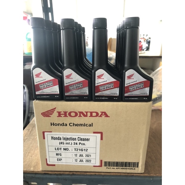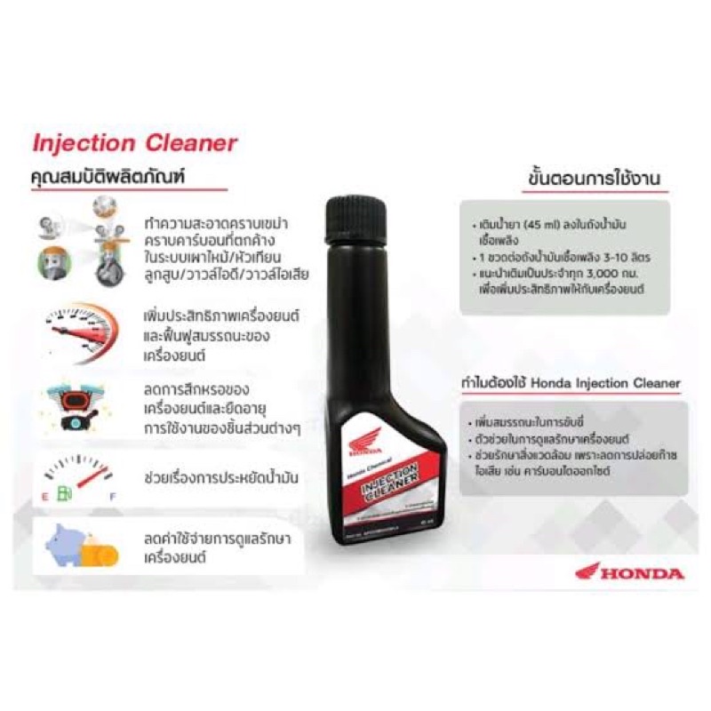 ... นะของเครื่องยนต์ - ลดการสึกหรอของ เครื่องยนต์และยืดอายุ การใช้งานของชิ้นส่วนต่างๆ - ช่วยเรื่องการประหยัดน้ำมัน - ลดค่าใช้จ่ายการดูแลรักษา เครื่องยนต์ ทำไมต้องใช้ Honda Injection Cleaner • เพิ่มสมรรถนะในการขับขี่ • ตัวช่วยในการดูแลรักษาเครื่องยนต์ • ช่วยรักษาสิ่งแวดล้อม เพราะลดการปล่อยก๊าซไอเสีย เช่น คาร์บอนไดออกไซด์ ขั้นตอนการใช้งาน • เติมน้ำยา (45 ml) ลงในถังน้ำมันเชื้อเพลิง • 1 ขวดต่อถังน้ำมันเชื้อเพลิง 4-10 ลิตร • แนะนำเติมเป็นประจำทุก 3,000 กม. เพื่อเพิ่มประสิทธิภาพให้กับเครื่องยนต์ **ในกรณีสินค้าชำรุดเสียหายจากความผิดพลาดในการผลิต เปลี่ยนสินค้าคืนได้ภายใน 7 วันหลังจากได้รับสินค้า รอบส่ง จ.-ส. 08.00-17.00 (หยุดวันอาทิตย์)