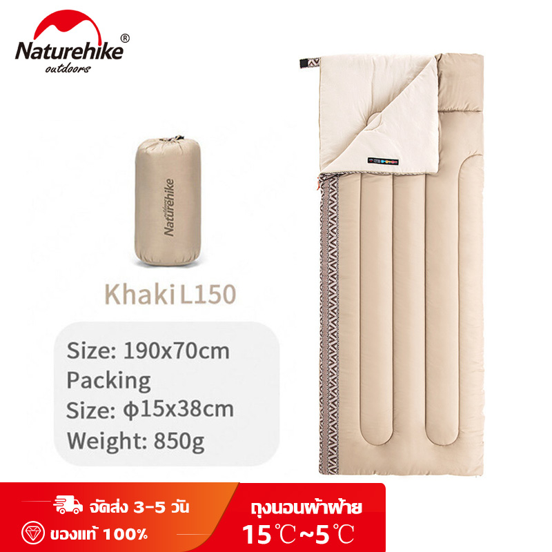 ... ์ Pongee (ผ้า) ซักผ้าฝ้าย (ซับใน) ฮอลโลว์คอตตอน(ไส้) สี: สีกากี / เขียว ใช้: ท่องเที่ยว / พักผ่อน / แคมป์ปิ้ง / นอนพักกลางวัน / สำนักงาน Brand Name: Naturehike Comfortable Temperature Scale: [15℃~5℃] Single/Double Sleeping Bag: Splicing Single Sleeping Bag Applicable People: Adult Length: Standard (Suitable for 1.8 m Height and Below) Origin: CN(Origin) Season: Spring & Autumn Season: Winter Size: 190x75cm Model Number: L150 Type: 3 Season Sleeping Bag Temperature Scale Category: Spring and Autumn Sleeping Bag is_customized: Yes Category: Cotton Sleeping Bag Filling: Cotton Fabric: Polyester Pongee(Fabric) Style: Envelope Type Model NO: NH20MSD05 Name: L150 Cotton Sleeping Bag Weight: About:1026g Size: 190x75cm Packing Size: 15x38cm Comfort Temperature: 13℃ Fit Temperature: 7℃ Extreme Temperature: -4℃ Material: Polyester Pongee(Fabric)