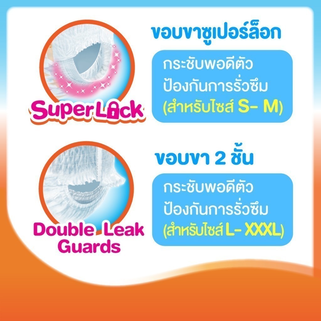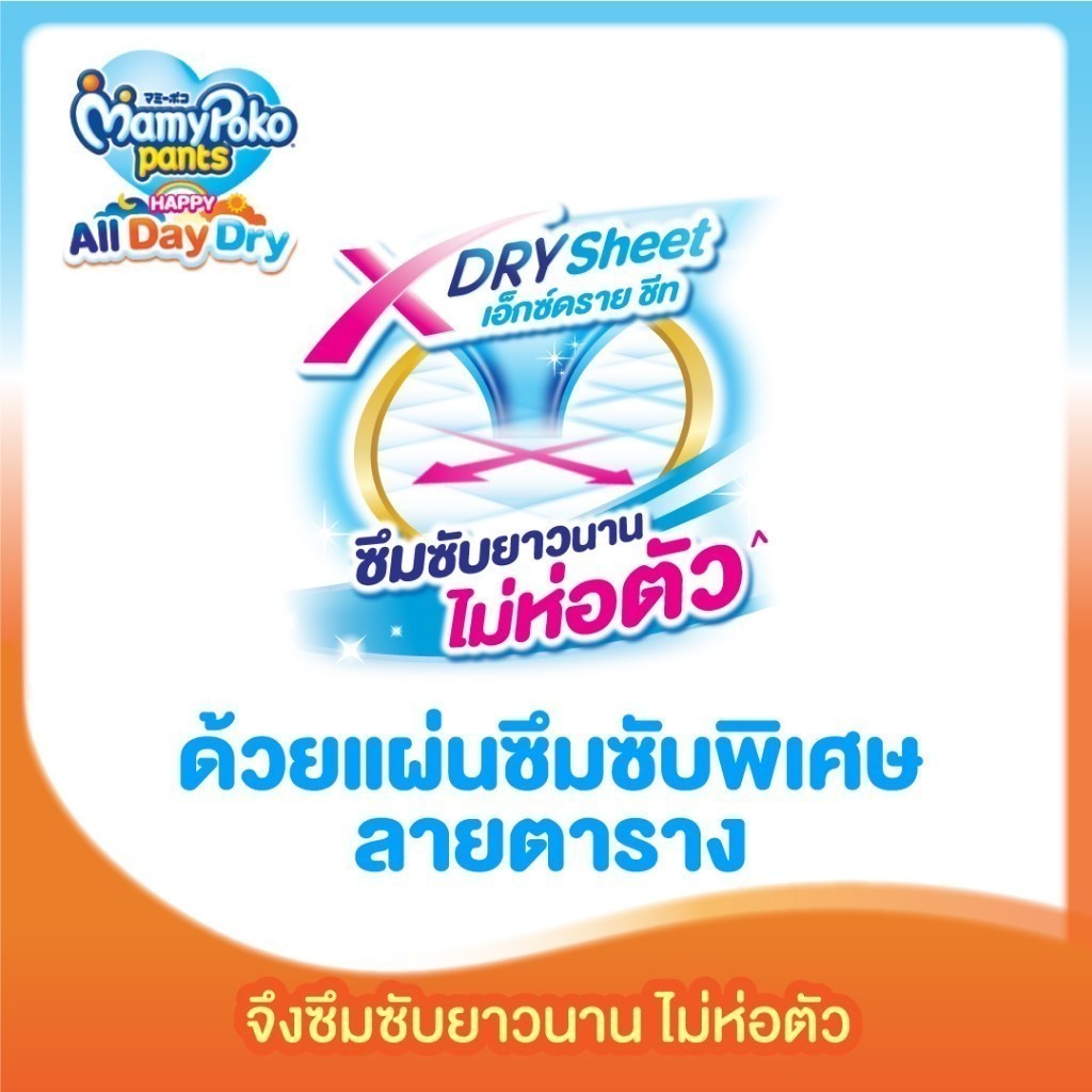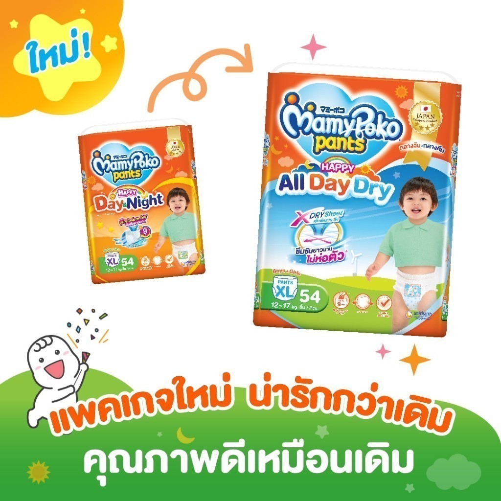 **สินค้าอยู่ในระหว่างการเปลี่ยนแปลงแพ็คเกจใหม่** ข้อมูลทั่วไป ผ้าอ้อมสำเร็จรูปแบบกางเกงสำหรับเด็กทุกเพศ รุ่น Happy All Day Dry ไซส์ S,M,L,XL,XXL มามี่โพโค แพ้นท์ แฮปปี้ออลเดย์ดรายกางเกงผ้าอ้อมเด็กสาเร็จรูปที่ซึมซับได้ยาวนาน ด้วยแผ่นซุปเปอร์แอคทีฟซึมซับยาวนานถึง 9 ชั่วโมง ช่วยให้ลูกน้อยหลับสบายใ