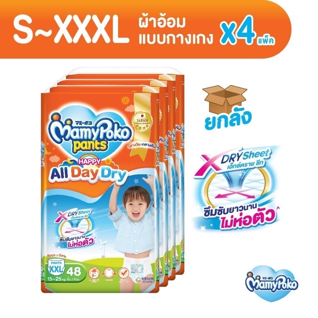 MamyPoko มามี่โพโค กางเกงผ้าอ้อมเด็ก แฮปปี้ ออลเดย์ดราย ไซส์ S-XXXL x 4 แพ็ค