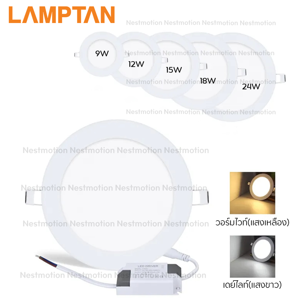 ... ุกสถานที่ให้ดูทันสมัย ให้ความร้อนต่ำ เหมาะกับการใช้งานทั่วไป สามารถใช้ทดแทนโคมไฟแบบเดิม เช่น โคมไฟเพดาน โคมไฟตกแต่ง โคมไฟซาลาเปา โคมไฟตะแกรง โคมไฟแขวน 5 นิ้ว 9w / 6 นิ้ว 12w / 7 นิ้ว 15w / 8 นิ้ว 18w / 11 นิ้ว 24w https://appdb.tisi.go.th/Q/i.php?d=2970732292 มอก.1955-2551 ---------------------------- คุณสมบัติพิเศษ ---------------------------- - ประหยัดไฟขึ้น 80% ช่วยประหยัดค่าใช่จ่ายในบ้านมากขึ้น - เป็นมิตรต่อสิ่งแวดล้อม ปราศจากรังสี UV ไม่เป็นอันตรายต่อผู้อยู่อาศัย - ใช้ทดแทนหลอดไฟฮาโลเจน หลอดไส้ โคมดาวไลท์แบบเก่า ที่กินไฟค่อนข้างสูง - มีไดร์เวอร์มาให้พร้อมครบชุด สามารถติดตั้งใช้งานได้เลย - สว่างทันทีเมื่อเปิดใช้งาน ไม่ต้องรอนาน - แสงให้ความรู้สึกสบายตา ช่วยถนอมสายตาและไม่เป็นอันตราย - แสงสว่างมากถึง 9 วัตต์ 540 ลูเมน ( สำหรับ 5 นิ้ว ) - แสงสว่างมากถึง 12 วัตต์ 800 ลูเมน ( สำหรับ 6นิ้ว ) - แสงสว่างมากถึง 15 วัตต์ 1050 ลูเมน ( สำหรับ 7นิ้ว ) - แสงสว่างมากถึง 18 วัตต์ 1260 ลูเมน ( สำหรับ 8 นิ้ว ) - แสงสว่างมากถึง 24 วัตต์ 1610 ลูเมน ( สำหรับ 11 นิ้ว ) ---------------------------- รายละเอียดสินค้า ---------------------------- โคมไฟดาวน์ไลท์ รุ่น 5 นิ้ว ( 9 วัตต์ ) Model : LAMPTAN Downlight Ultra Slim Alu 5นิ้ว/9W องศา : 140 ° Input Voltage : 220-240V ช่วงอุณหภูมิสี : 6500K / 2700KK อายุการใช้งาน : 15,000 Hours น้ำหนัก : 154 g โคมไฟดาวน์ไลท์ รุ่น 6 นิ้ว ( 12 วัตต์ ) Model : LAMPTAN Downlight Ultra Slim Alu 6นิ้ว/12W แสงสว่าง : 800 LM องศา : 140 ° Input Voltage : 220-240V ช่วงอุณหภูมิสี : 6500K / 2700KK อายุการใช้งาน : 15,000 Hours น้ำหนัก : 196 g โคมไฟดาวน์ไลท์ รุ่น 7 นิ้ว ( 15 วัตต์ ) Model : LAMPTAN Downlight Ultra Slim Alu 7นิ้ว/15W แสงสว่าง : 1,050 LM องศา : 140° Input Voltage : 220-240V ช่วงอุณหภูมิสี : 3000K/6500K อายุการใช้งาน : 15,000 Hours น้ำหนัก : 260 g โคมไฟดาวน์ไลท์ รุ่น 8 นิ้ว ( 18 วัตต์ ) Model : LAMPTAN Downlight Ultra Slim Alu 8นิ้ว/18W แสงสว่าง : 1,260 LM องศา : 140° Input Voltage : 220-240V ช่วงอุณหภูมิสี : 3000K/6500K อายุการใช้งาน : 15,000 Hours น้ำหนัก : 320 g โคมไฟดาวน์ไลท์ รุ่น 11 นิ้ว ( 24 วัตต์ ) Model : LAMPTAN Downlight Ultra Slim Alu 11นิ้ว/24W แสงส่องสว่าง : 1,610 LM องศา : 140° Input Voltage : 220-240V ช่วงอุณหภูมิสี : 3000K/6500K อายุการใช้งาน : 15,000 Hours น้ำหนัก : 539 g !!! การใช้งาน : ห้ามใช้งานร่วมกับสวิทซ์หรี่ไฟ dimmer !!!! เหมาะสำหรับการใช้งานตกแต่ง เช่น ห้องโถงรับแขก ห้องนอน ห้องอ่านหนังสือ ห้องทำงาน ห้องอาหาร ห้องโชว์สินค้า ห้างสรรพสินค้า ตกแต่งเคาน์เตอร์ โรงพยาบาล โรงแรม รีสอร์ท สถานที่ท่องเที่ยว ---------------------------- สินค้าในกล่อง ---------------------------- 1 X โคม ไฟดาวน์ไลท์ + Driver ==================== การจัดส่ง ==================== • โดยทั่วไปสินค้าจะจัดส่งภายถึงลูกค้าภายใน 2 วันทำการ (ไม่รวมวันอาทิตย์และวันหยุดนักขัตฤกษ์) โดยความเร็วในการจัดส่งจะ ขึ้นกับพื้นที่และปริมาณสินค้าที่จัดส่งในช่วงนั้นๆครับ • การนับวันให้นับวันที่สั่งสินค้าเป็นวันที่ 0 เพื่อให้ร้านค้าเตรียมสินค้าเพื่อจัดส่งนะครับ • เมื่อสั่งสินค้าแล้ว รบกวนรอระบบอ