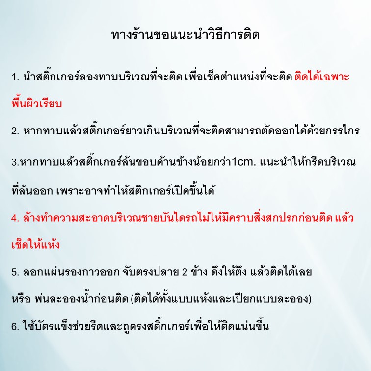... รียบ อาจหลุดได้❌ 1.นำสติกเกอร์ลองทาบกับบริเวณที่จะติดก่อนลอกกาวออก เพื่อเช็คความเเหมาะสมของตำแหน่งที่จะติด ติดได้เฉพาะพื้นผิวเรียบ 2.หากลองทาบแล้ว สติ๊กเกอร์กันรอยยาวเกินบริเวณที่จะติดสามารถตัดออกได้ด้วยกรรไกร 3.หากลองทาบแล้วสติกเกอร์ล้นขอบด้านข้างน้อยกว่า1cm แนะนำให้กรีดออกบริเวณที่ล้น เพราะอาจทำให้ติดไปนานด้านข้างของสติ๊กเกอร์อาจจเปิด 4.ทำความสะอาดบริเวณชายบันไดรถไม่ให้มีฝุ่น สิ่งสกปรก และเช็ดให้แห้ง 5.ลอกแผ่นรองกาวออก จับตรงปลายสองข้างให้ตึงทาบลงบริเวณขอบ แล้วรีดจนสุด 6.ใช้ผ้าหนาๆกดและถูตรงสติ๊กเกอร์เพื่อให้การติดแน่นขึ้น **อ่านรายละเอียดด้านล่างก่อนกดสั่งสินค้านะครับ** - ตรวจสอบยี่ห้อที่ต้องการ และที่อยู่ในการจัดส่งให้ดีก่อนกดสั่ง สั่งแล้วไม่สามารถแก้ไขได้ - ไม่รับเปลี่ยนสินค้าในกรณีที่ลูกค้าสั่งของเข้ามาผิดเอง ยกเว้นทางร้านส่งผิด แจ้งทางแชทได้ครับ ขอบคุณลูกค้าทุกท่านที่อุดหนุน มีข้อสงสัยหรือไม่แน่ใจเกี่ยวกับสินค้าทักแชทสอบถามได้เลยครับ