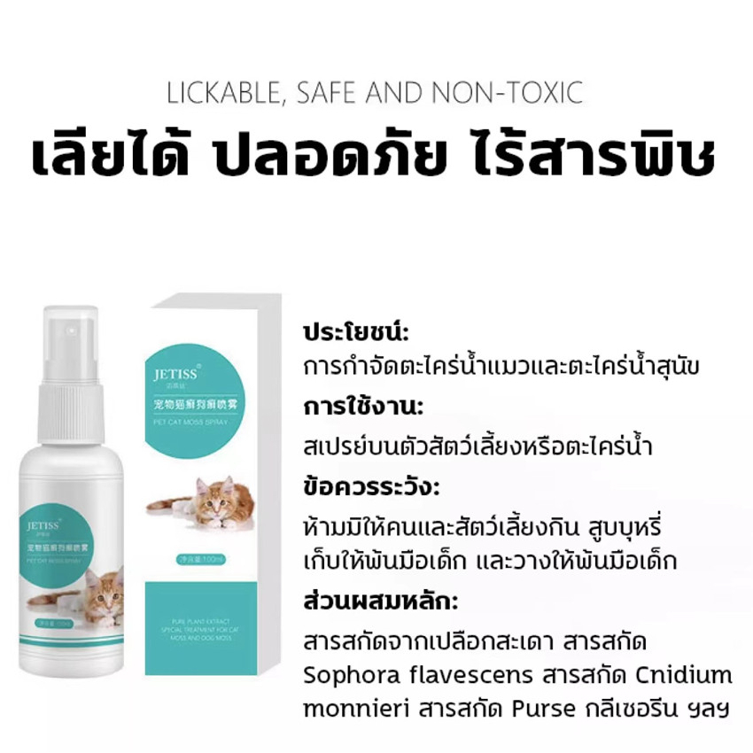 ... : ทั่วไปสำหรับแมวและสุนัข ประโยชน์:การกำจัดตะไคร่น้ำแมวและตะไคร่น้ำสุนัข รักษาขี้เรื้อน เชื้อรา ผื่นแดง อาการคันเรื้อรัง ฆ่าเชื้อโรคและแบคทีเรีย กำจัดปริสิตและตัวอ่อนปริสิต แห้งชื้น ขับลม ฆ่าแมลง บรรเทาอาการคัน กลาก และคัน เลียได้ ปลอดภัย ไร้สารพิษ เหมาะสำหรับสัตว์เลี้ยงที่ตั้งครรภ์และทารก ตัวช่วยสำหรับปัญหาผิวสัตว์เลี้ยง แก้ปัญหาผิวสัตว์เลี้ยง ใช้ตะไคร่น้ำแมวและตะไคร่น้ำได้ กำจัดขน ผื่นแดงและรังแค โรคผิวหนังและกลาก เชื้อราไร สารสกัดจากพืชมีประสิทธิภาพมากกว่า ใช้วัตถุดิบจากธรรมชาติ สามารถเลียได้ ปลอดภัยทั้งผู้ใช้และสัตว์เลี้ยง ส่วนผสมหลัก:สารสกัดจากเปลือกสะเดา สารสกัด Sophora flavescens สารสกัด Cnidium monnieri สารสกัด Purse กลีเซอรีน ฯลฯ สารสกัดจากพืช Cnidium วิธีใช้:สเปรย์บนตัวสัตว์เลี้ยงหรือตะไคร่น้ำ ทาบริเวณที่เป็นวันละ 2 ครั้ง เช้า-เย็น ต่อเนื่องกัน เห็นผลเร็วใน 3 วันที่ใช้ ข้อควรระวัง:ห้ามมิให้คนและสัตว์เลี้ยงกิน สูบบุหรี่ เก็บให้พ้นมือเด็ก และวางให้พ้นมือเด็ก ผลิตภัณฑ์ปลอดภัยต่อสสัตว์เลี้ยงและผู้ใช้ไม่ก่อให้เกิดอันตราย สารตกค้าง และสารก่อมะเร็ง
