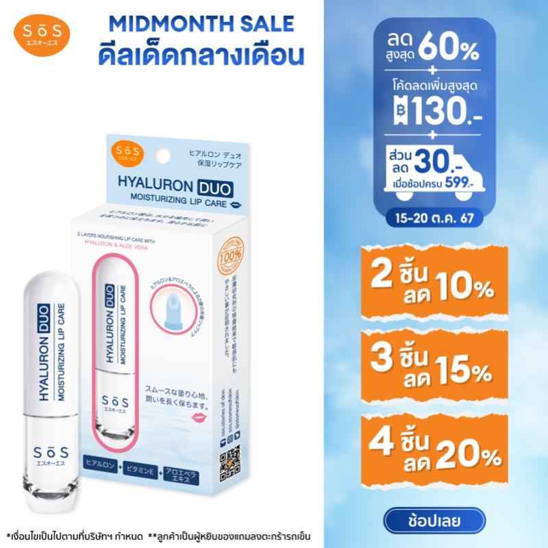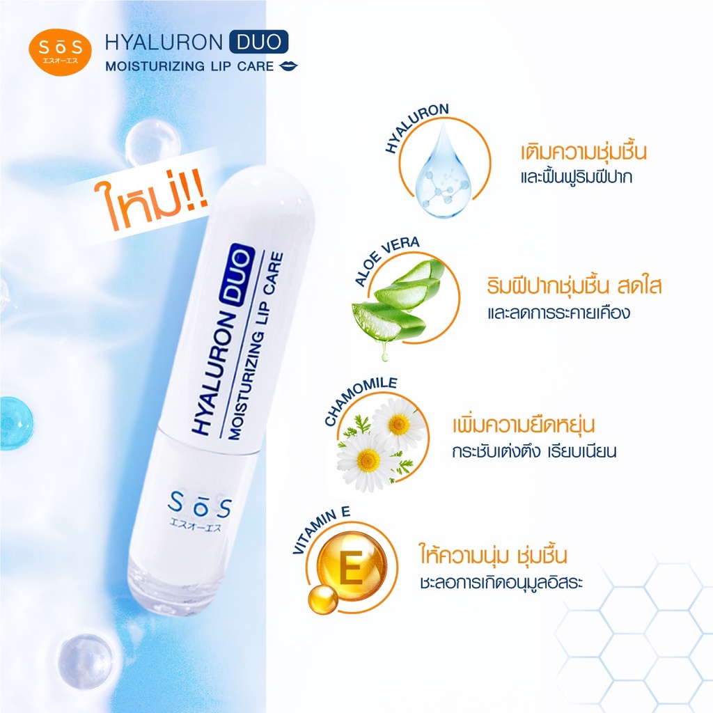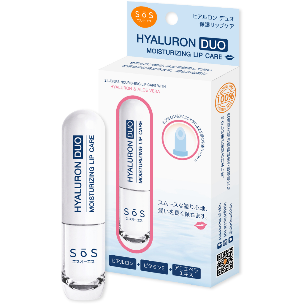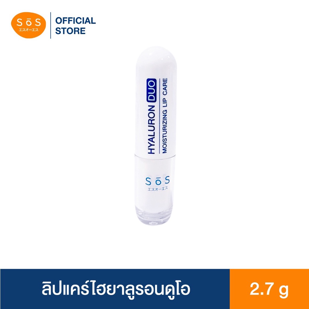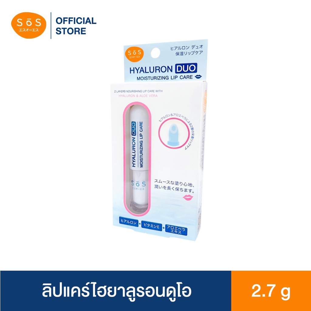 SOS HYALURON DUO MOISTURIZING LIP CAREเอะสึ โอ เอะสึ ลิปแคร์ไฮยาลูรอนดูโอ บำรุงริมฝีปากถึง 2 ชั้น เพื่อความชุ่มชื้นอย่างยาวนาน ให้ริมฝีปากนุ่มแลดูอวบอิ่ม ปรับให้ริมฝีปากไม่แห้งกร้าน ดูเนียนนุ่มยืดหยุ่นขึ้น แลดูสุขภาพดีอย่างเป็นธรรมชาติ ด้วยสารสกัดจาก ไฮยาลูรอน อโลเวล่า คาโมมายล์และวิตามินอี อ่อนโยนต